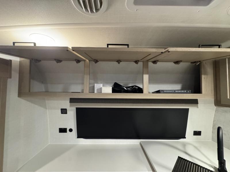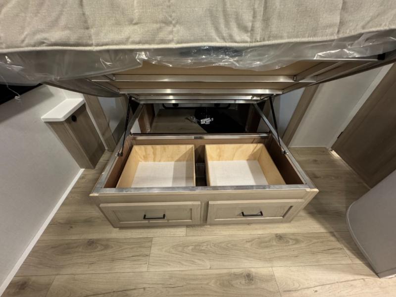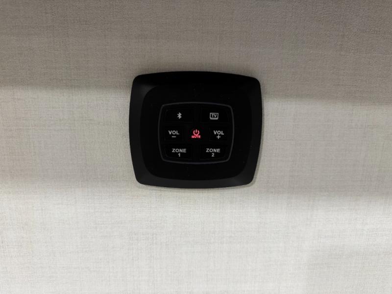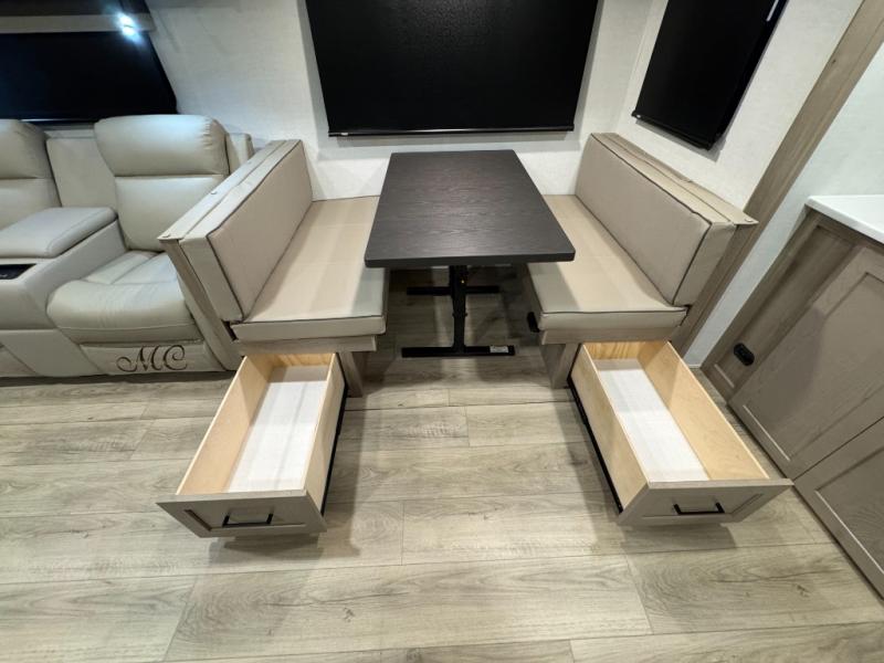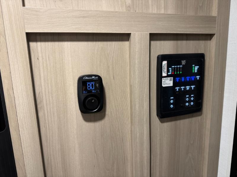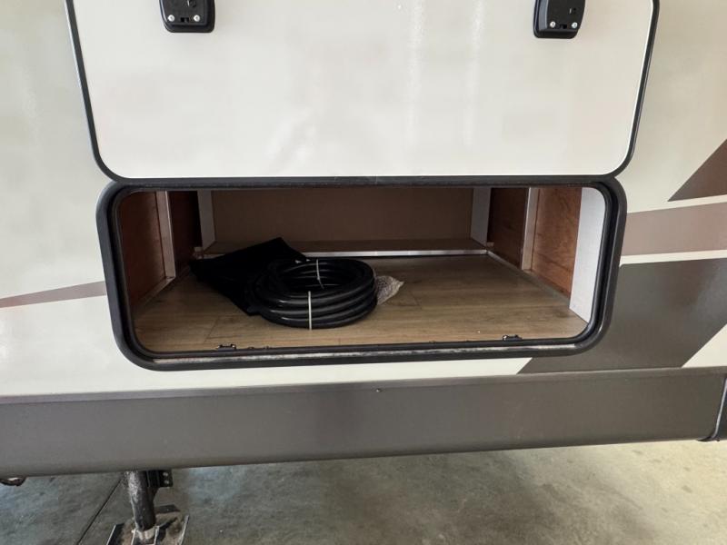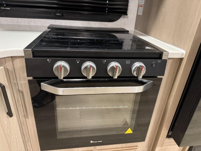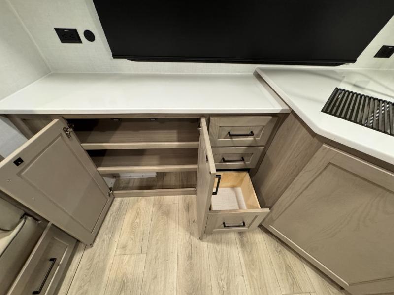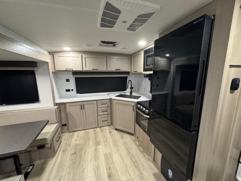 When you are outside this trailer you can enjoy the protection from the 21' power awning, and whip up a meal using the outside griddle. You will find exterior storage for your extra gear, and a ladder at the rear. You get to choose which entrance to step up into, be it the spacious rear bedroom with a queen bed slide and a wardrobe, or the main entry into the kitchen and living area. The furniture slide includes a booth dinette to eat your meals at, and theater seating to watch the Smart TV with a fireplace below. And the cook will love the front kitchen with extra counter space, a three burner range, plus a 12V refrigerator and pantry for food storage!