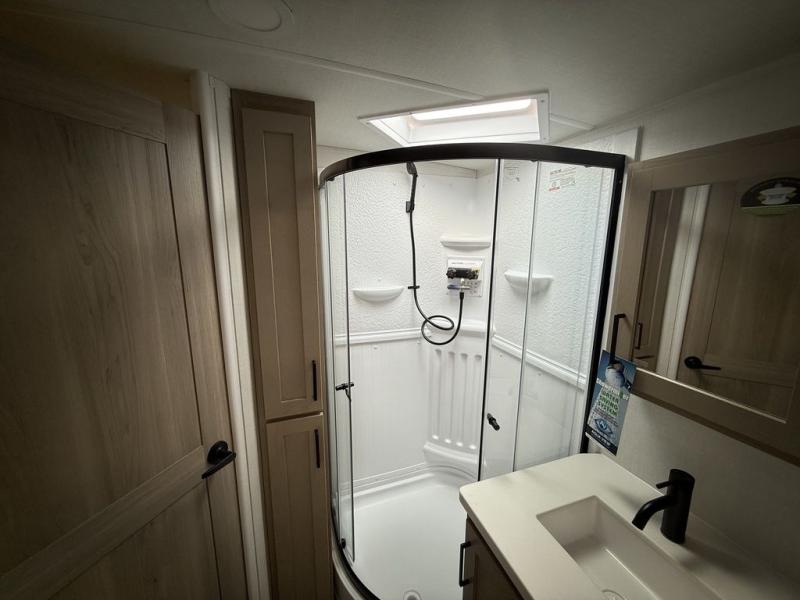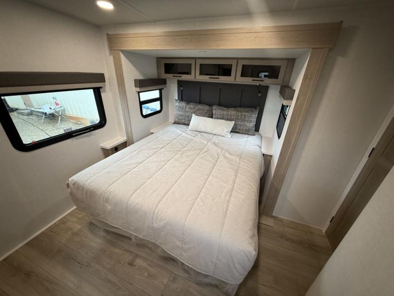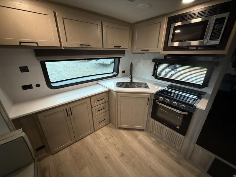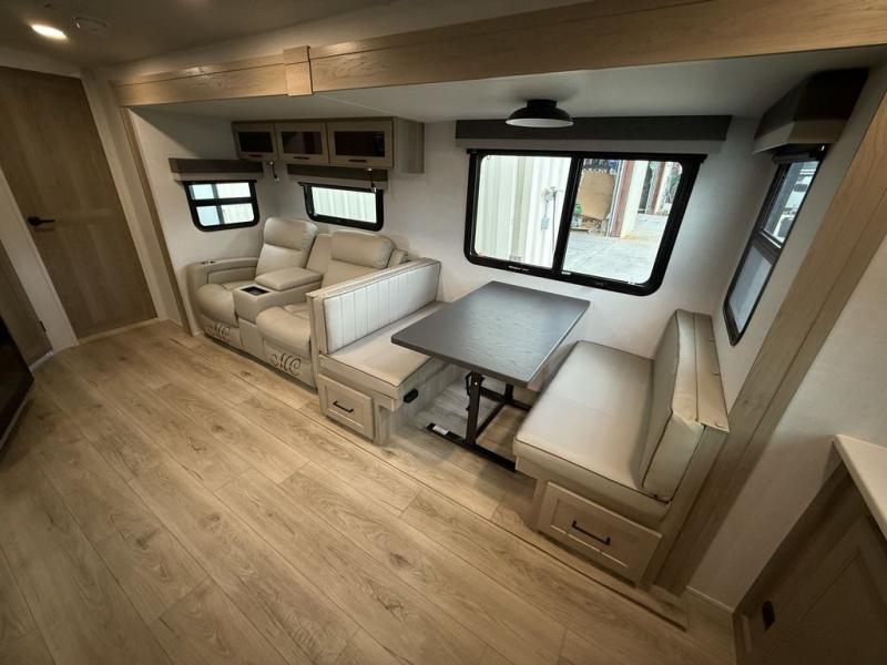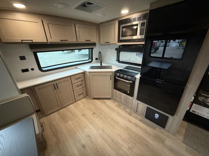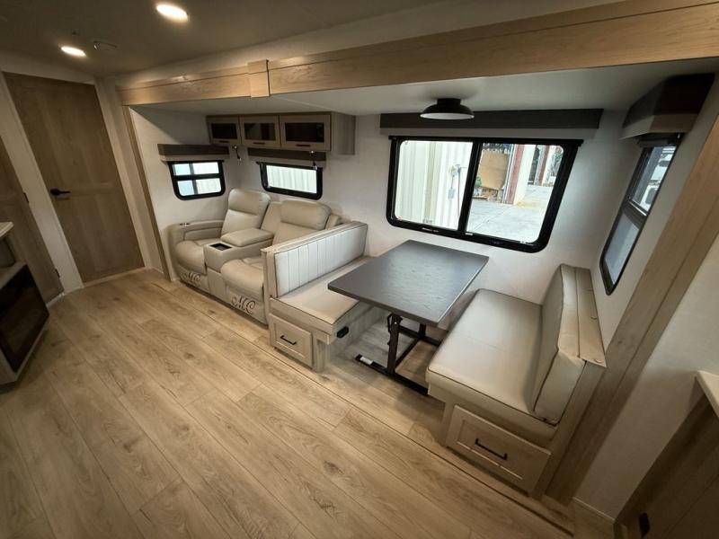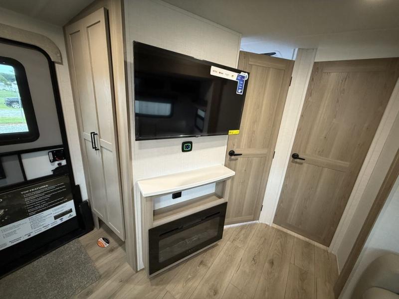 When you are outside this trailer you can enjoy the protection from the 21' power awning, and whip up a meal using the outside griddle. You will find exterior storage for your extra gear, and a ladder at the rear. You get to choose which entrance to step up into, be it the spacious rear bedroom with a queen bed slide and a wardrobe, or the main entry into the kitchen and living area. The furniture slide includes a booth dinette to eat your meals at, and theater seating to watch the Smart TV with a fireplace below. And the cook will love the front kitchen with extra counter space, a three burner range, plus a 12V refrigerator and pantry for food storage!