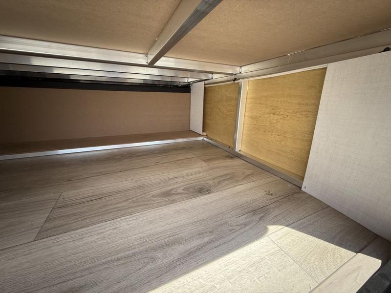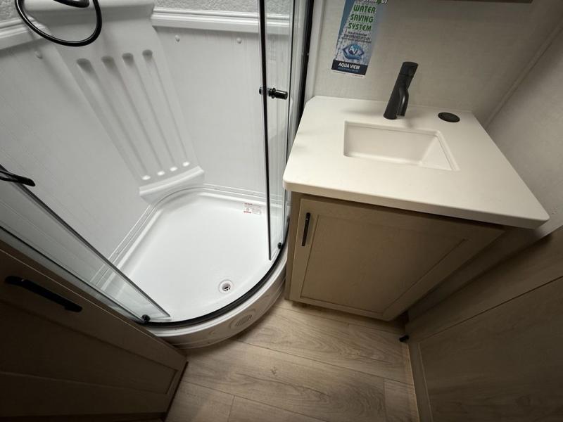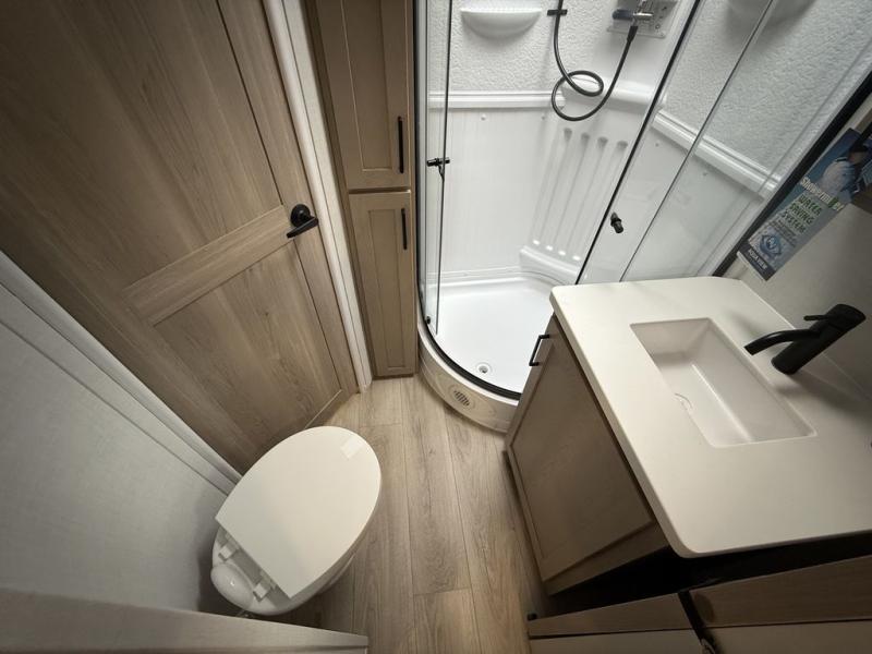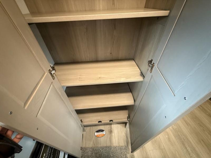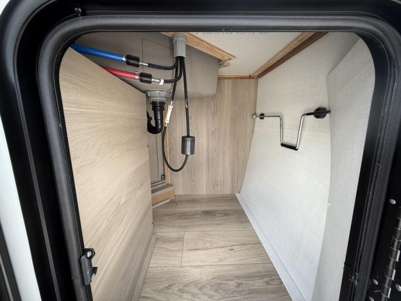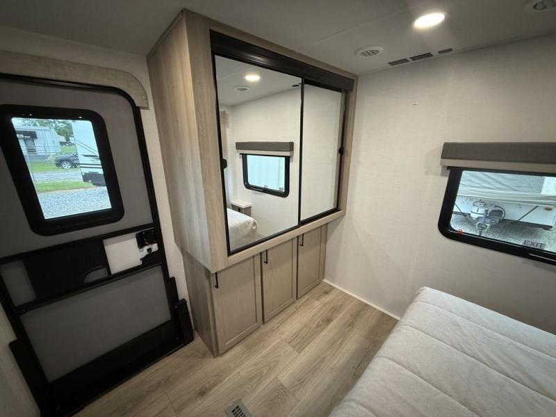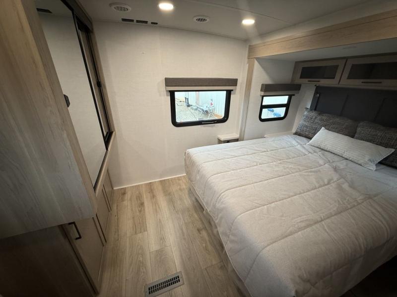 When you are outside this trailer you can enjoy the protection from the 21' power awning, and whip up a meal using the outside griddle. You will find exterior storage for your extra gear, and a ladder at the rear. You get to choose which entrance to step up into, be it the spacious rear bedroom with a queen bed slide and a wardrobe, or the main entry into the kitchen and living area. The furniture slide includes a booth dinette to eat your meals at, and theater seating to watch the Smart TV with a fireplace below. And the cook will love the front kitchen with extra counter space, a three burner range, plus a 12V refrigerator and pantry for food storage!