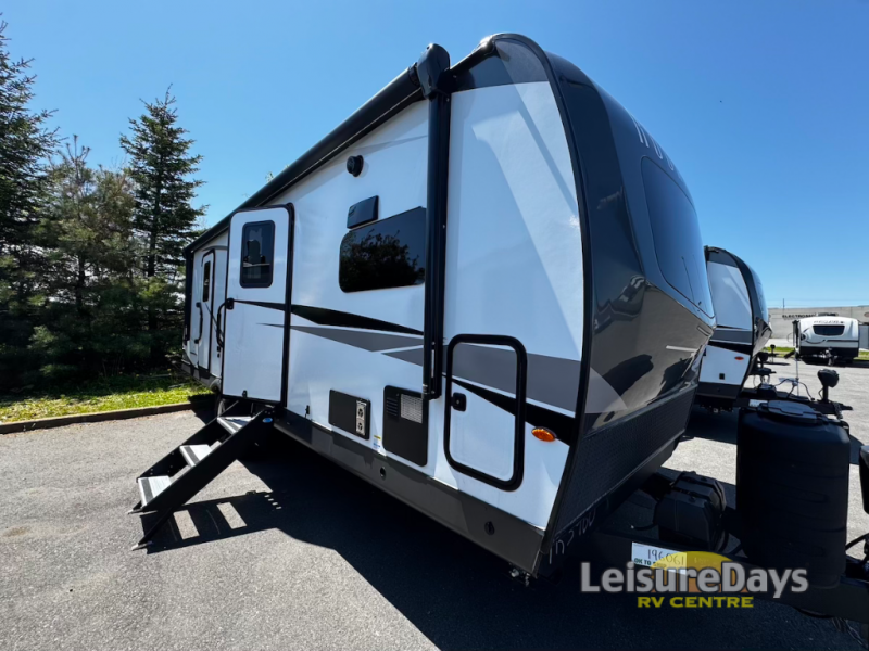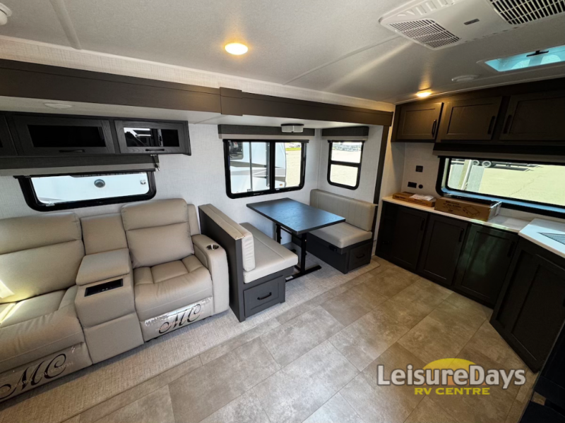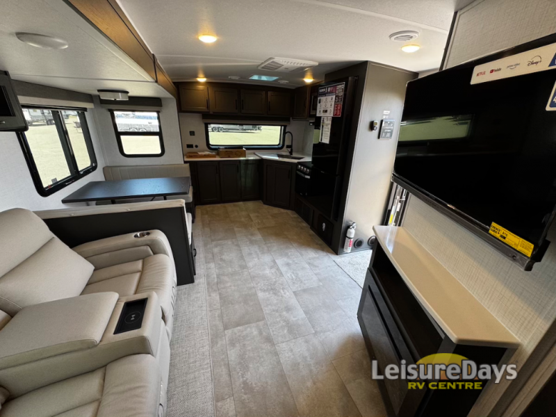 When you are outside this trailer you can enjoy the protection from the 21' power awning, and whip up a meal using the outside griddle. You will find exterior storage for your extra gear, and a ladder at the rear. You get to choose which entrance to step up into, be it the spacious rear bedroom with a queen bed slide and a wardrobe, or the main entry into the kitchen and living area. The furniture slide includes a booth dinette to eat your meals at, and theater seating to watch the Smart TV with a fireplace below. And the cook will love the front kitchen with extra counter space, a three burner range, plus a 12V refrigerator and pantry for food storage!