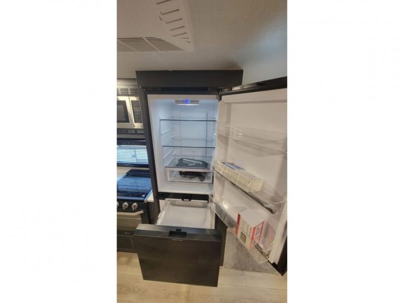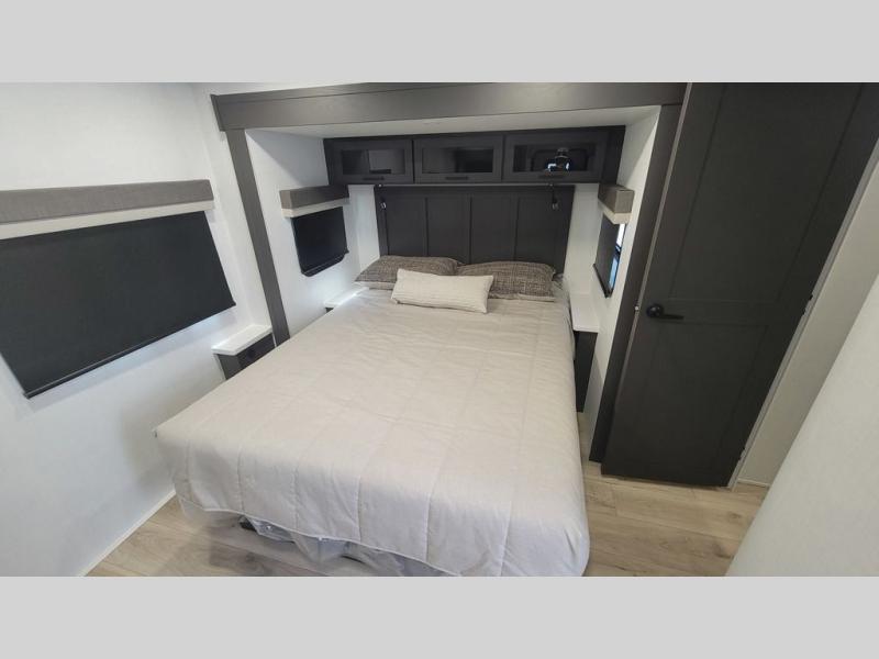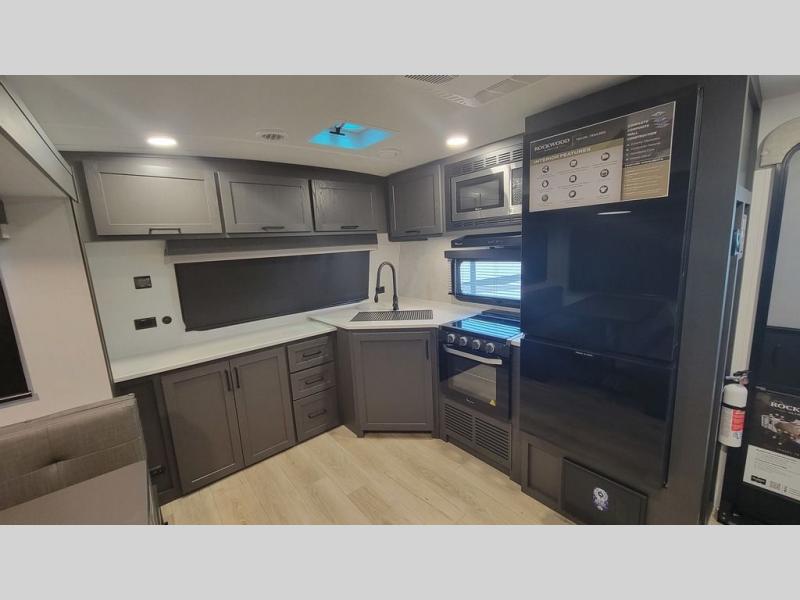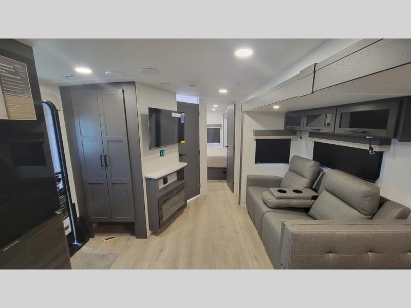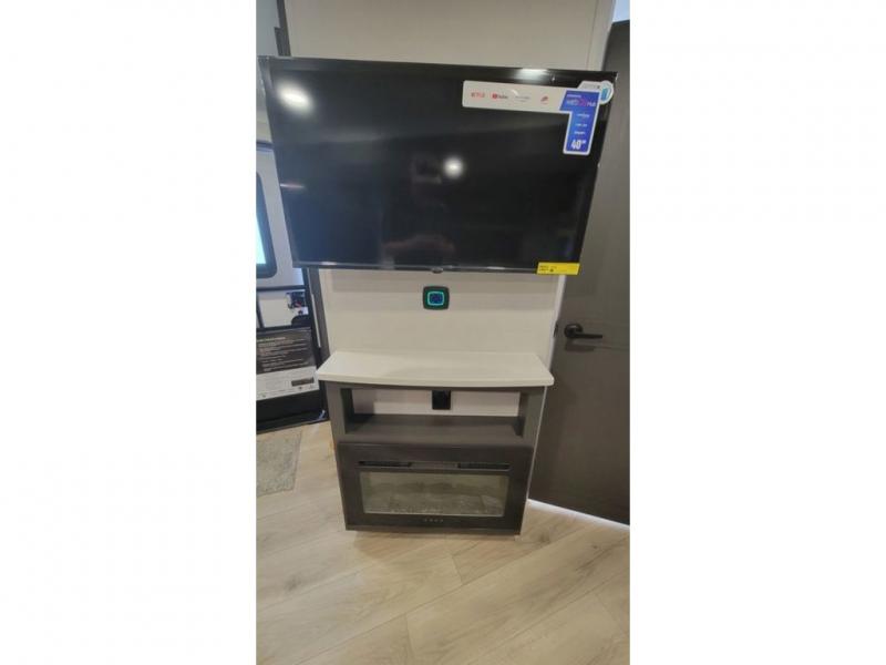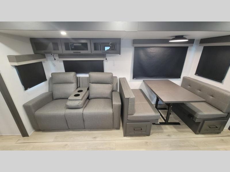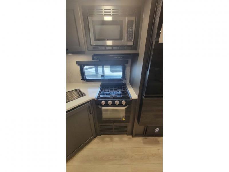 When you are outside this trailer you can enjoy the protection from the 21' power awning, and whip up a meal using the outside griddle. You will find exterior storage for your extra gear, and a ladder at the rear. You get to choose which entrance to step up into, be it the spacious rear bedroom with a queen bed slide and a wardrobe, or the main entry into the kitchen and living area. The furniture slide includes a booth dinette to eat your meals at, and theater seating to watch the Smart TV with a fireplace below. And the cook will love the front kitchen with extra counter space, a three burner range, plus a 12V refrigerator and pantry for food storage!