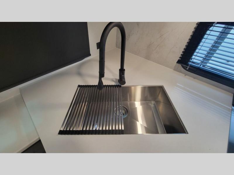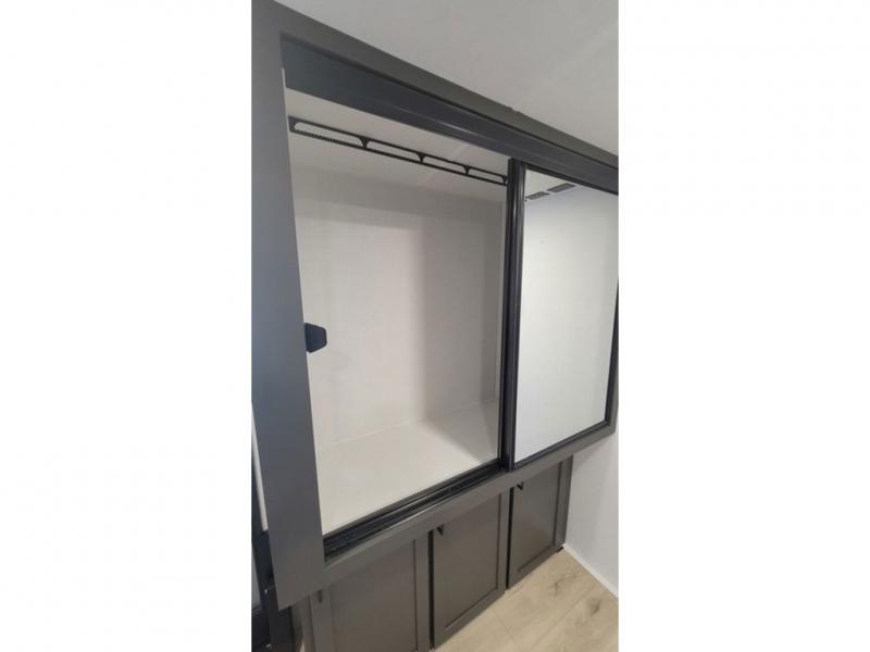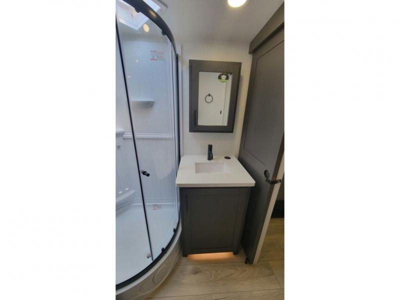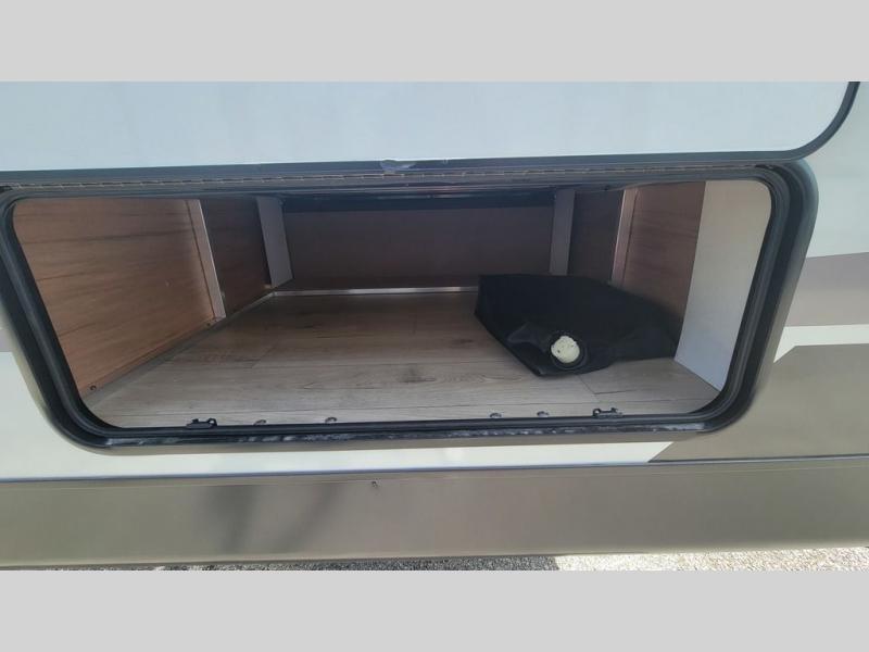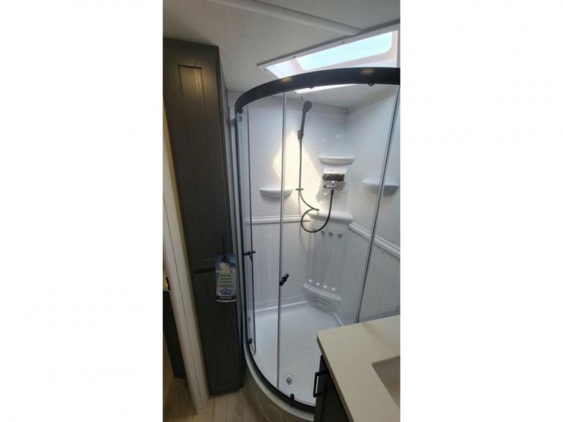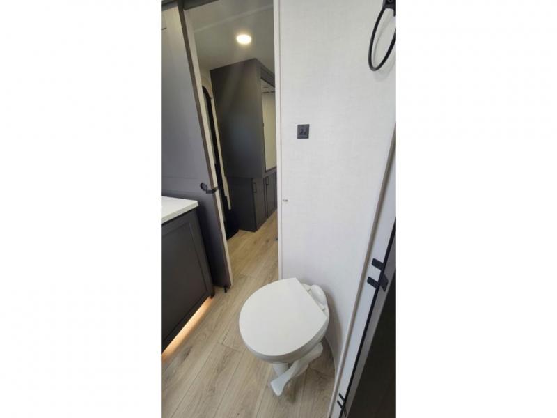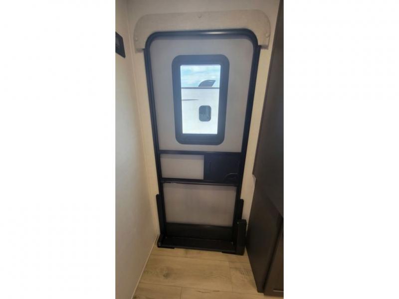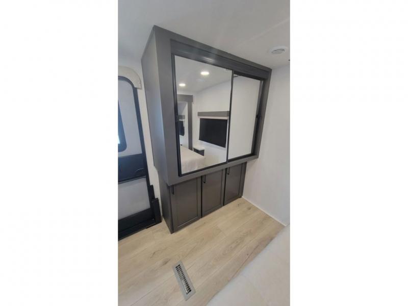 When you are outside this trailer you can enjoy the protection from the 21' power awning, and whip up a meal using the outside griddle. You will find exterior storage for your extra gear, and a ladder at the rear. You get to choose which entrance to step up into, be it the spacious rear bedroom with a queen bed slide and a wardrobe, or the main entry into the kitchen and living area. The furniture slide includes a booth dinette to eat your meals at, and theater seating to watch the Smart TV with a fireplace below. And the cook will love the front kitchen with extra counter space, a three burner range, plus a 12V refrigerator and pantry for food storage!