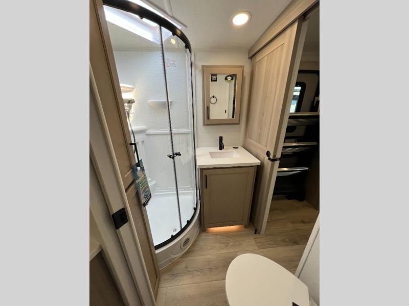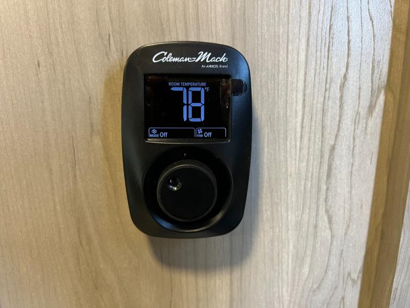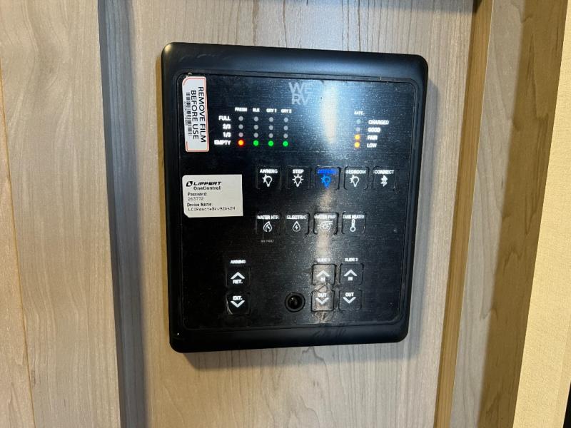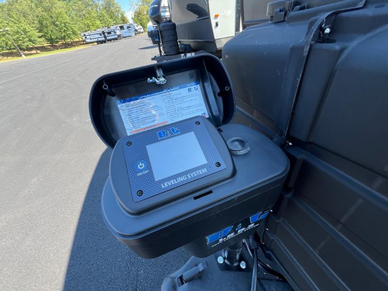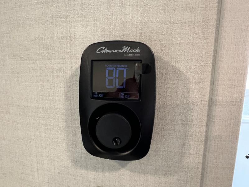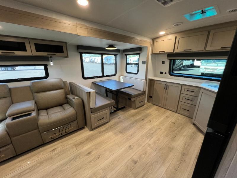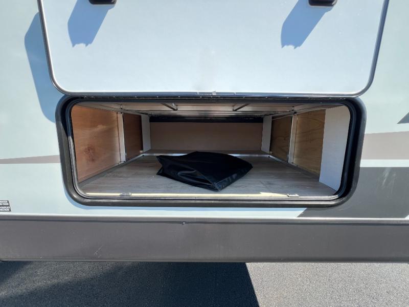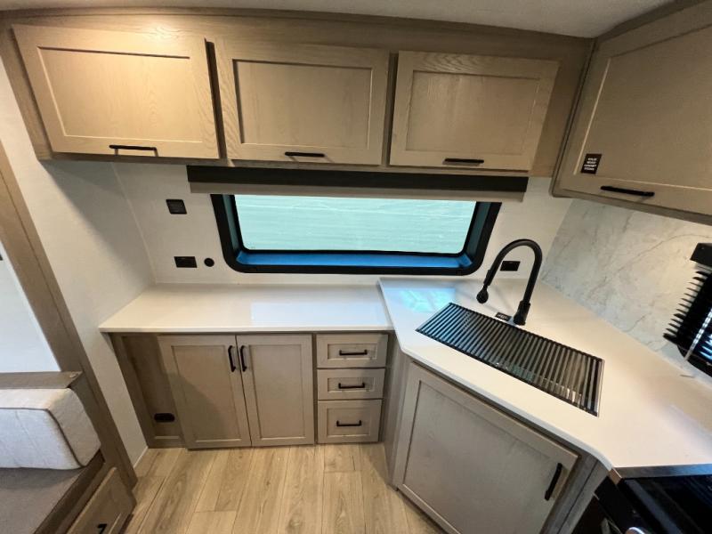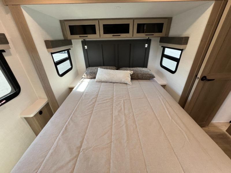 When you are outside this trailer you can enjoy the protection from the 21' power awning, and whip up a meal using the outside griddle. You will find exterior storage for your extra gear, and a ladder at the rear. You get to choose which entrance to step up into, be it the spacious rear bedroom with a queen bed slide and a wardrobe, or the main entry into the kitchen and living area. The furniture slide includes a booth dinette to eat your meals at, and theater seating to watch the Smart TV with a fireplace below. And the cook will love the front kitchen with extra counter space, a three burner range, plus a 12V refrigerator and pantry for food storage!