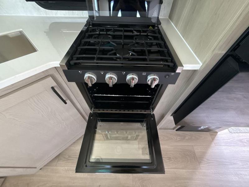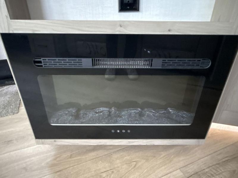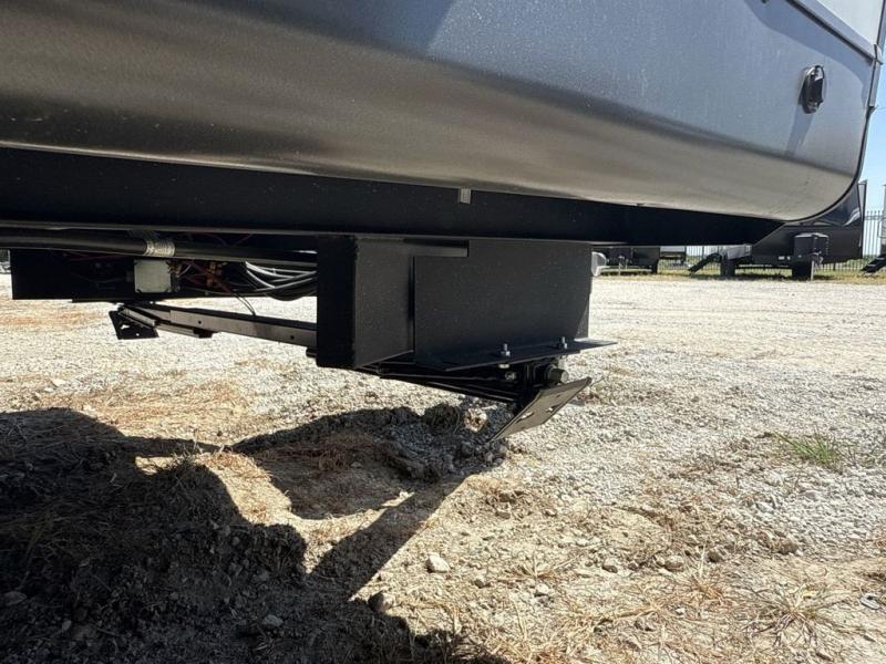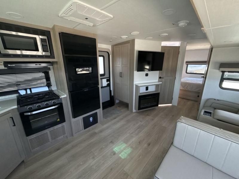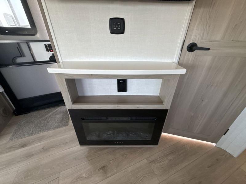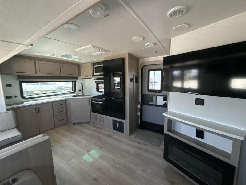 When you are outside this trailer you can enjoy the protection from the 21' power awning, and whip up a meal using the outside griddle. You will find exterior storage for your extra gear, and a ladder at the rear. You get to choose which entrance to step up into, be it the spacious rear bedroom with a queen bed slide and a wardrobe, or the main entry into the kitchen and living area. The furniture slide includes a booth dinette to eat your meals at, and theater seating to watch the Smart TV with a fireplace below. And the cook will love the front kitchen with extra counter space, a three burner range, plus a 12V refrigerator and pantry for food storage!