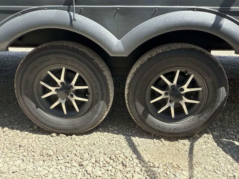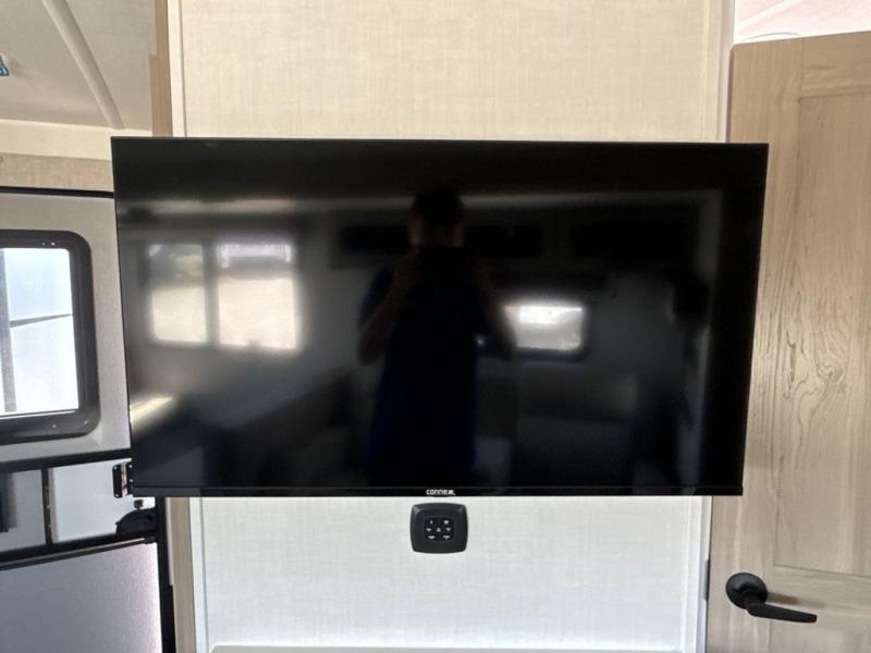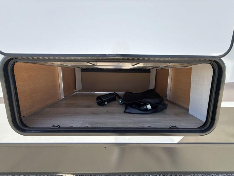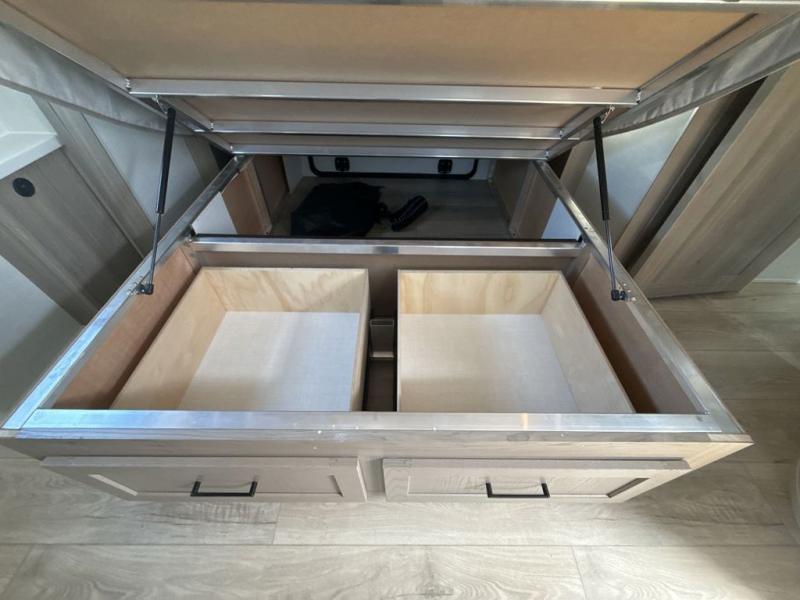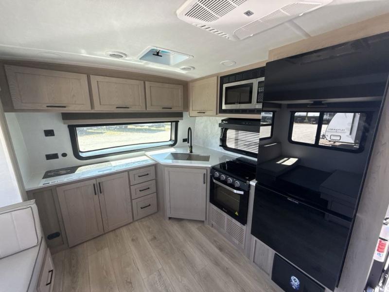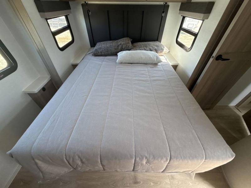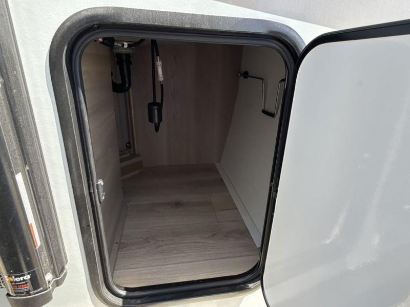 When you are outside this trailer you can enjoy the protection from the 21' power awning, and whip up a meal using the outside griddle. You will find exterior storage for your extra gear, and a ladder at the rear. You get to choose which entrance to step up into, be it the spacious rear bedroom with a queen bed slide and a wardrobe, or the main entry into the kitchen and living area. The furniture slide includes a booth dinette to eat your meals at, and theater seating to watch the Smart TV with a fireplace below. And the cook will love the front kitchen with extra counter space, a three burner range, plus a 12V refrigerator and pantry for food storage!