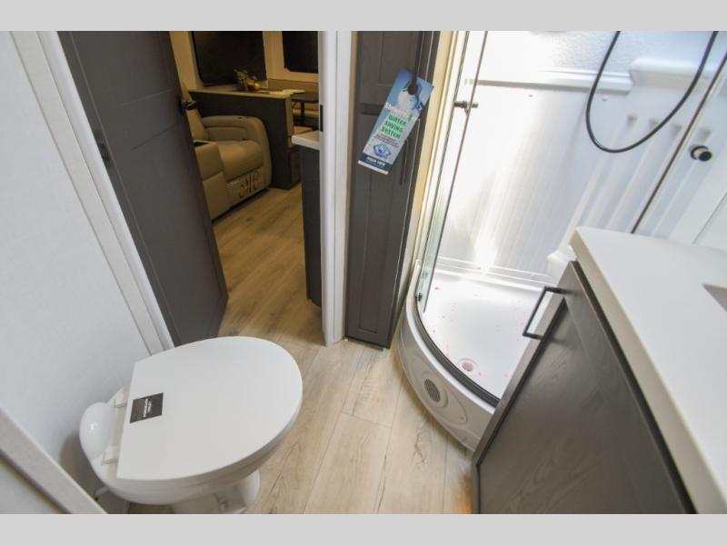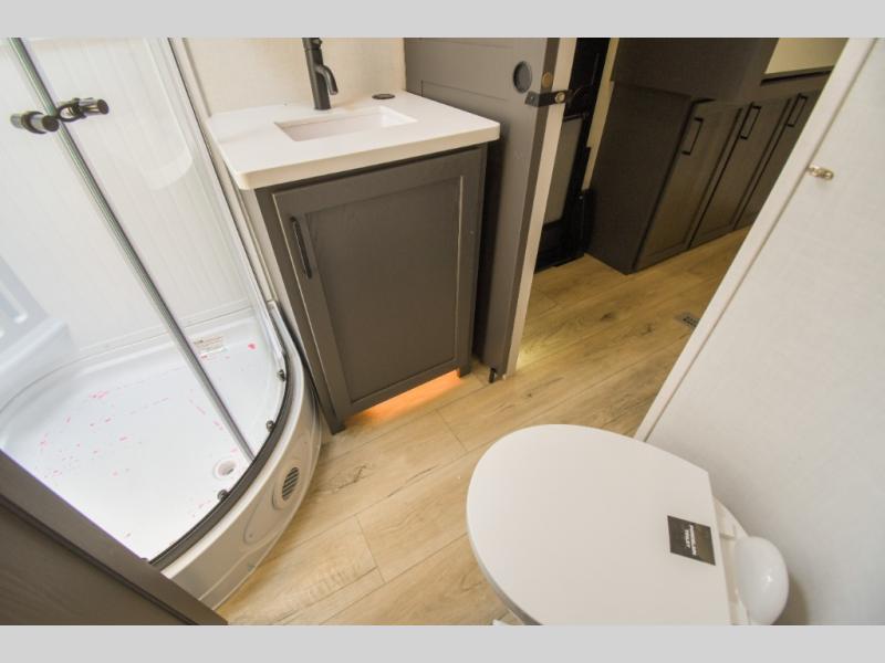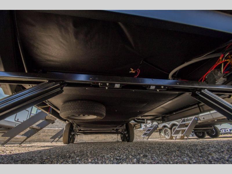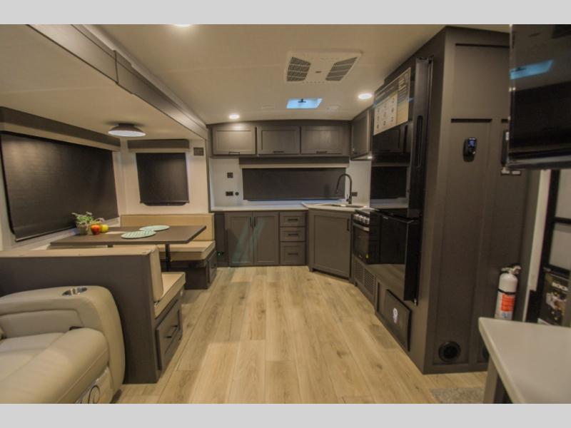 When you are outside this trailer you can enjoy the protection from the 21' power awning, and whip up a meal using the outside griddle. You will find exterior storage for your extra gear, and a ladder at the rear. You get to choose which entrance to step up into, be it the spacious rear bedroom with a queen bed slide and a wardrobe, or the main entry into the kitchen and living area. The furniture slide includes a booth dinette to eat your meals at, and theater seating to watch the Smart TV with a fireplace below. And the cook will love the front kitchen with extra counter space, a three burner range, plus a 12V refrigerator and pantry for food storage!
