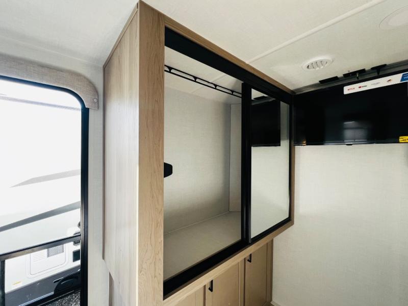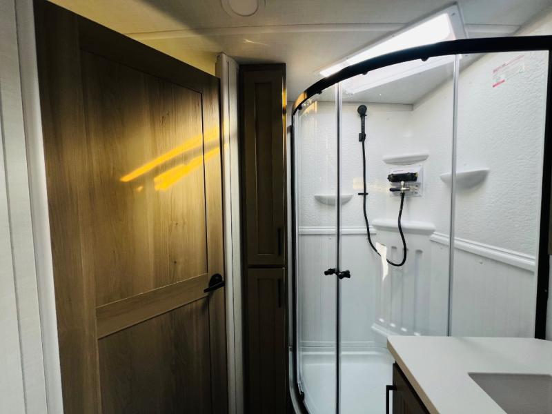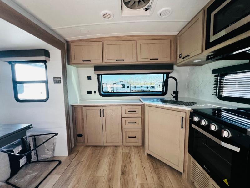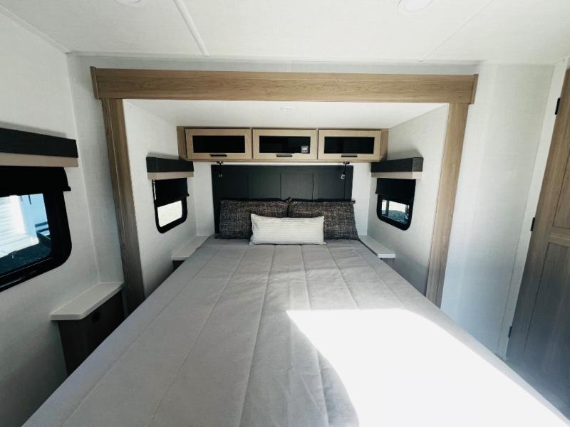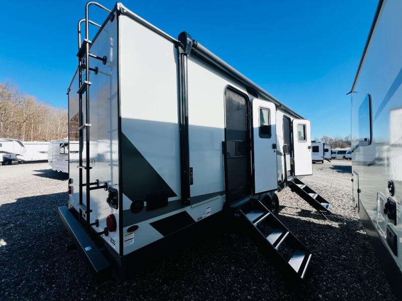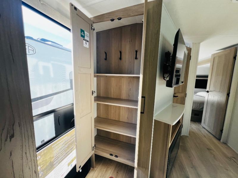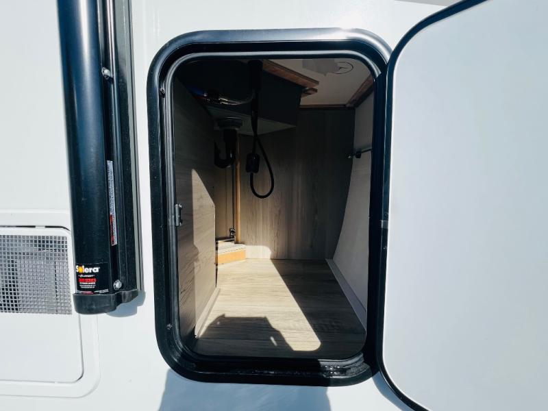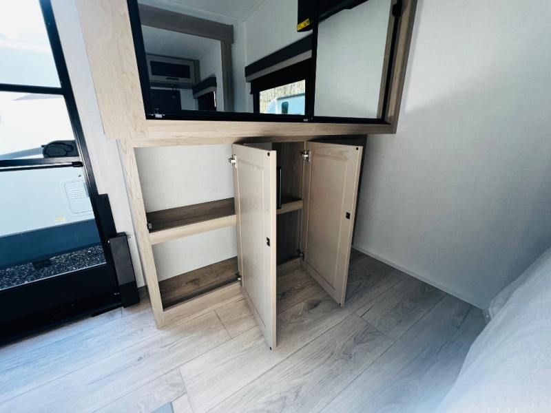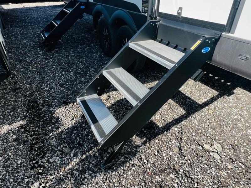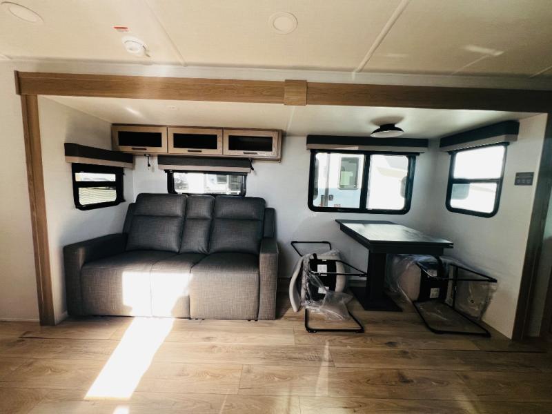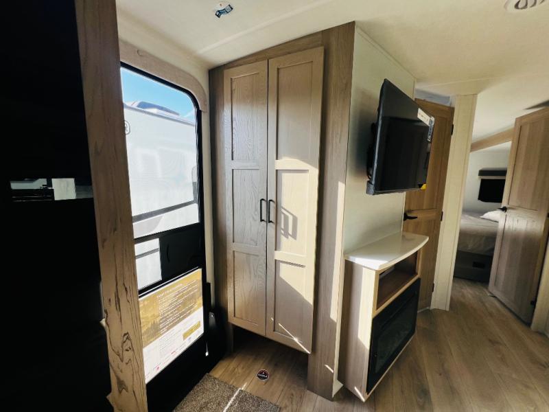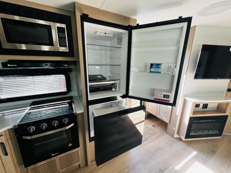 When you are outside this trailer you can enjoy the protection from the 21' power awning, you will also find exterior storage for your extra gear, and a ladder at the rear. You get to choose which entrance to step up into, be it the spacious rear bedroom with a queen bed slide and a wardrobe, or the main entry into the kitchen and living area. The furniture slide includes a booth dinette to eat your meals at, and theater seating to watch the Smart TV with a fireplace below. And the cook will love the front kitchen with extra counter space, a three-burner range, plus a 12V refrigerator and pantry for food storage!