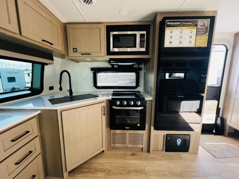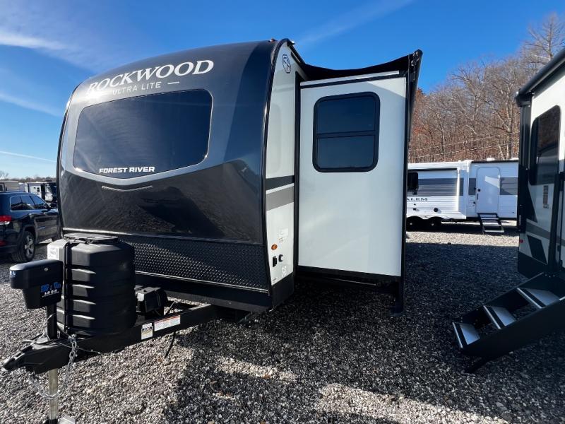 Each Rockwood Ultra Lite travel trailer by Forest River includes superior construction with a high gloss fiberglass cap, aluminum cage construction, and a power awning with LED lighting for a cozy and functional outdoor space. The torsion axle, power tongue jack will make towing smooth and hassle-free, along with the nitrogen filled, Goodyear Endurance tires and the tire pressure monitor system. Interior comforts include kitchen sink with high rise faucet, hidden hinge cabinet doors, and roller shades to name a few. Choose a Rockwood Ultra Lite travel trailer today!