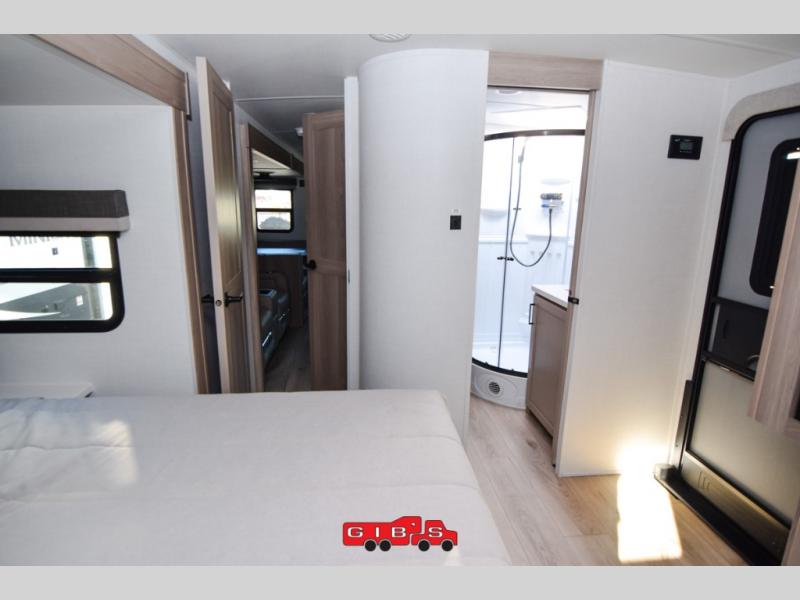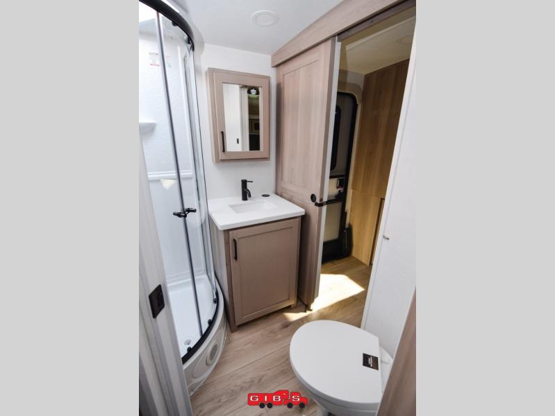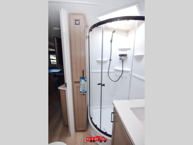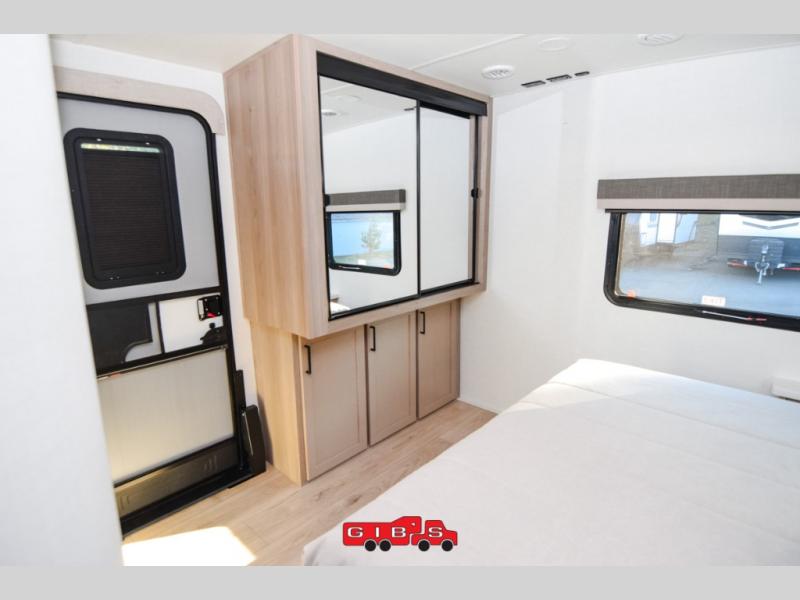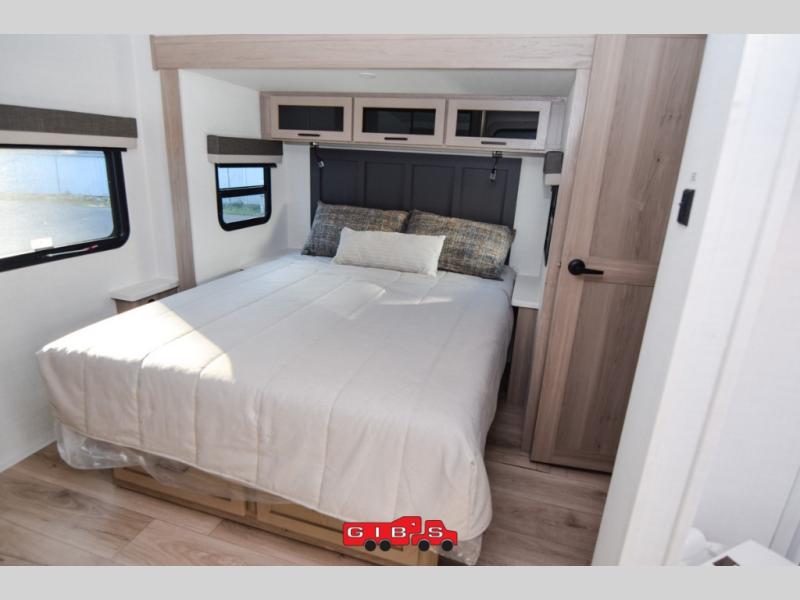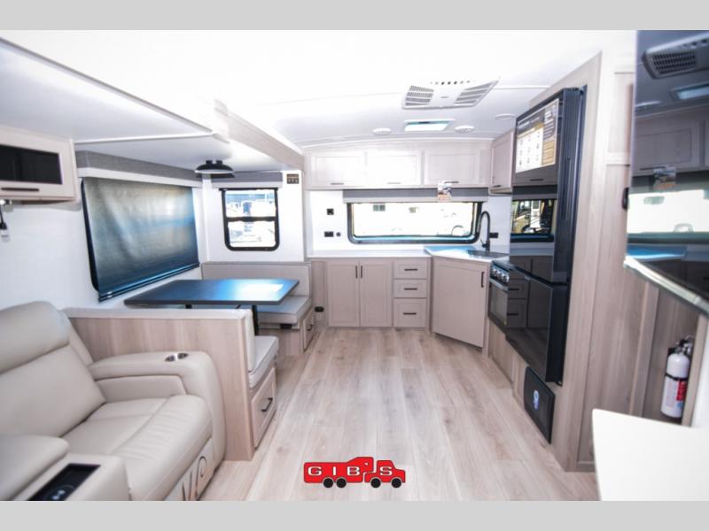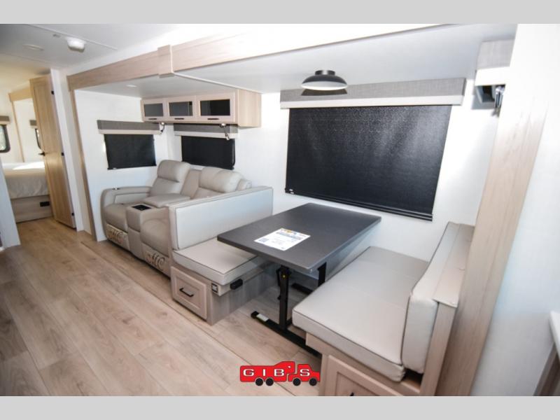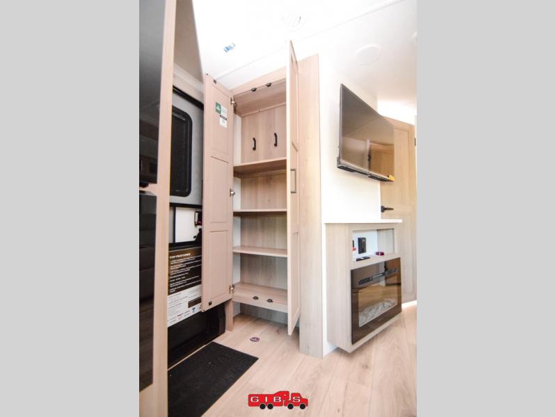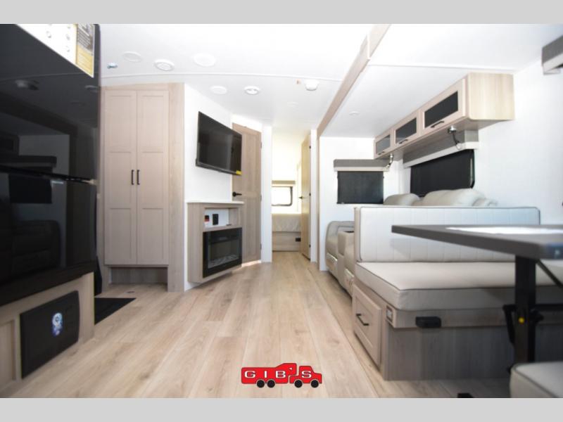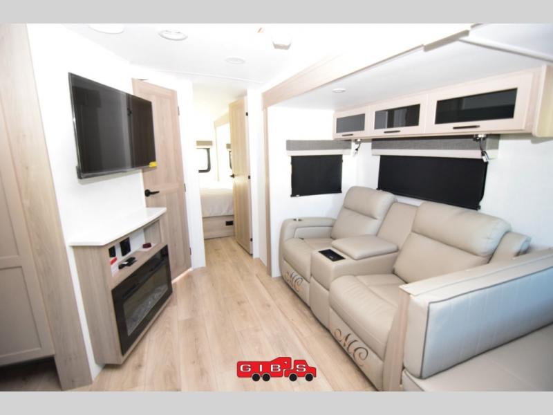 When you are outside this trailer you can enjoy the protection from the 21' power awning, and whip up a meal using the outside griddle. You will find exterior storage for your extra gear, and a ladder at the rear. You get to choose which entrance to step up into, be it the spacious rear bedroom with a queen bed slide and a wardrobe, or the main entry into the kitchen and living area. The furniture slide includes a booth dinette to eat your meals at, and theater seating to watch the Smart TV with a fireplace below. And the cook will love the front kitchen with extra counter space, a three burner range, plus a 12V refrigerator and pantry for food storage!