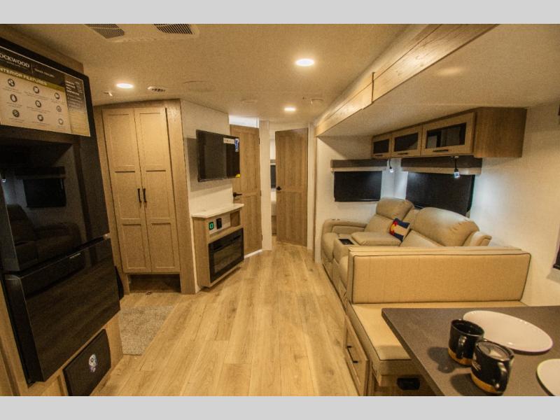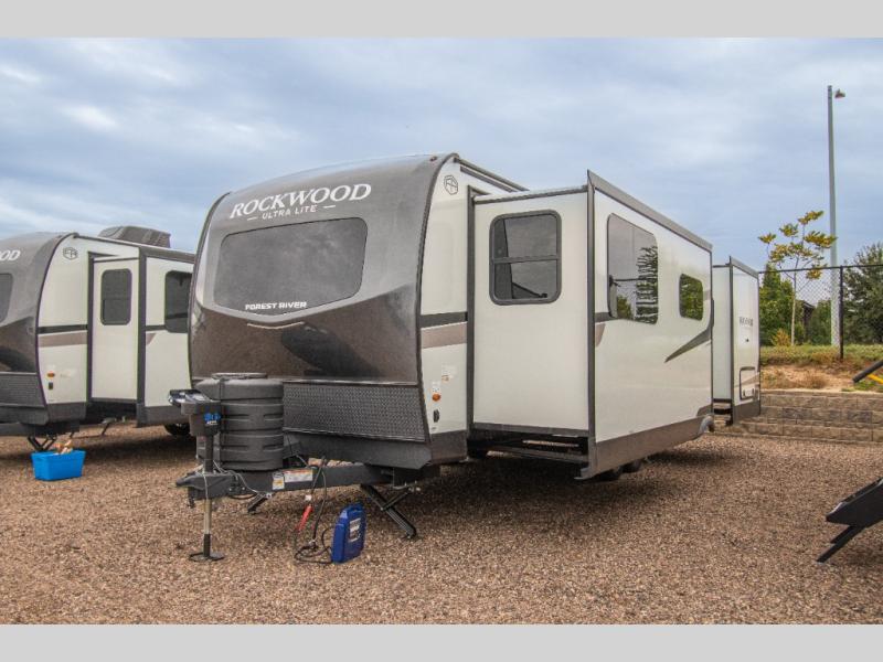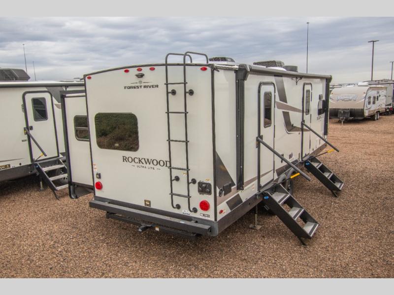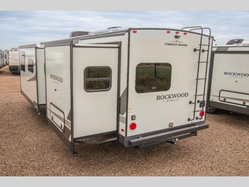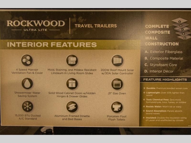 Each Rockwood Ultra Lite travel trailer by Forest River includes superior construction with a high gloss fiberglass cap, aluminum cage construction, and a power awning with LED lighting for a cozy and functional outdoor space. The torsion axle, power tongue jack will make towing smooth and hassle-free, along with the nitrogen filled, Goodyear Endurance tires and the tire pressure monitor system. Interior comforts include kitchen sink with high rise faucet, hidden hinge cabinet doors, and roller shades to name a few. Choose a Rockwood Ultra Lite travel trailer today!