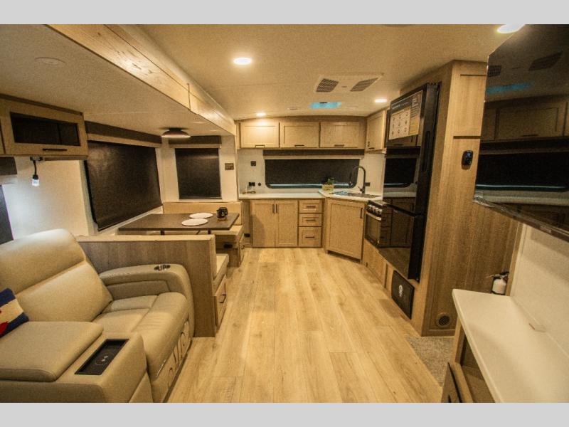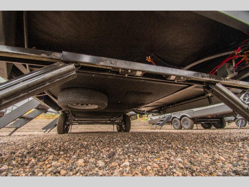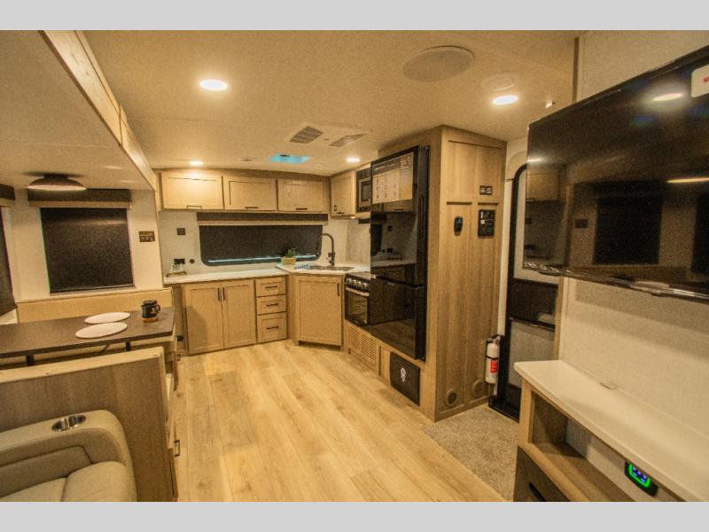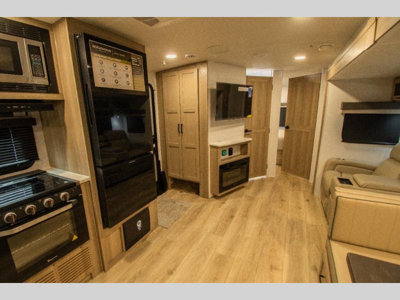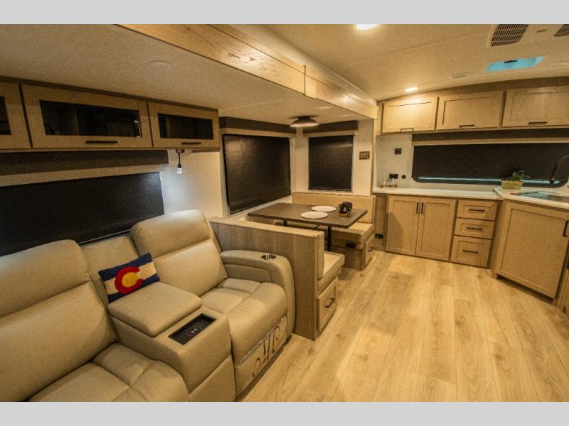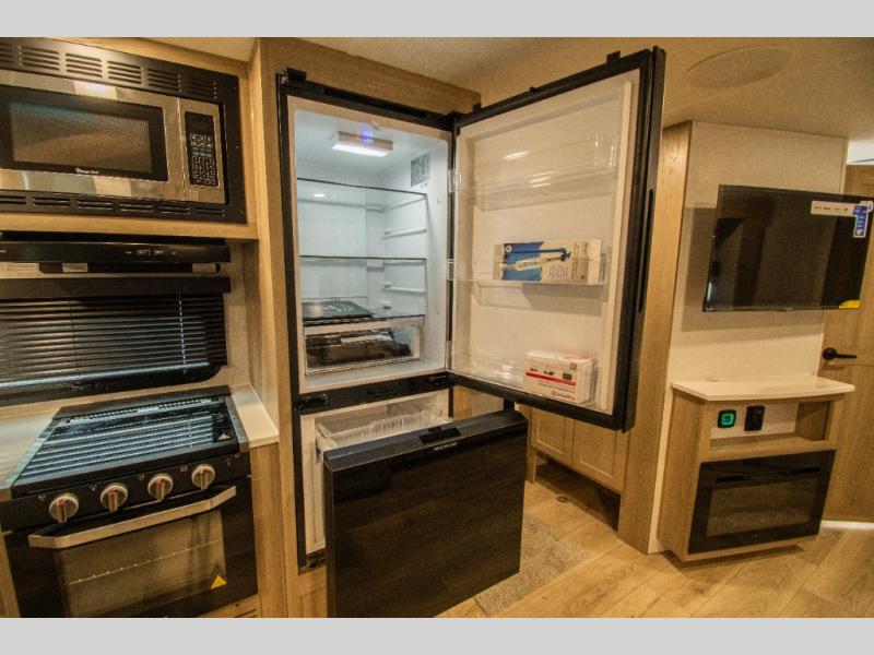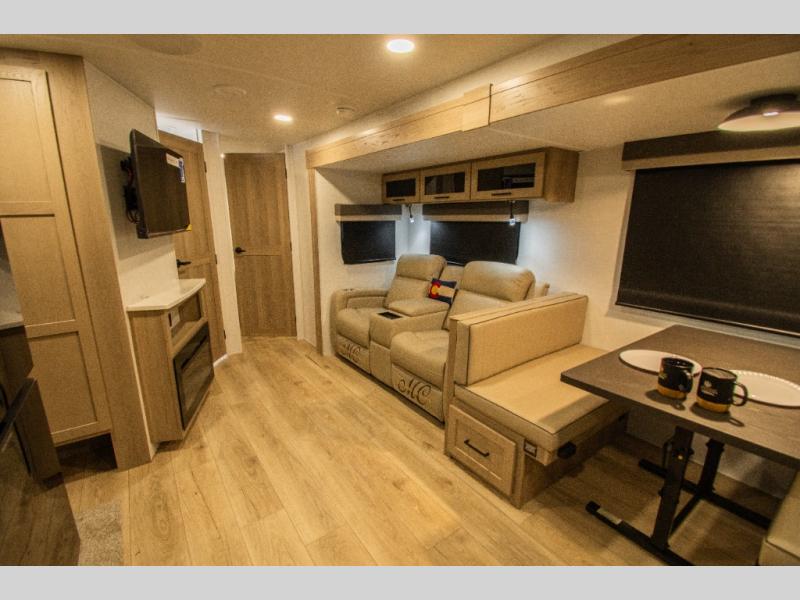 When you are outside this trailer you can enjoy the protection from the 21' power awning, you will also find exterior storage for your extra gear, and a ladder at the rear. You get to choose which entrance to step up into, be it the spacious rear bedroom with a queen bed slide and a wardrobe, or the main entry into the kitchen and living area. The furniture slide includes a booth dinette to eat your meals at, and theater seating to watch the Smart TV with a fireplace below. And the cook will love the front kitchen with extra counter space, a three-burner range, plus a 12V refrigerator and pantry for food storage!