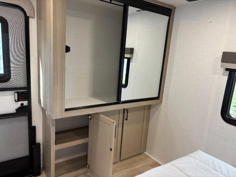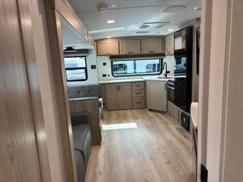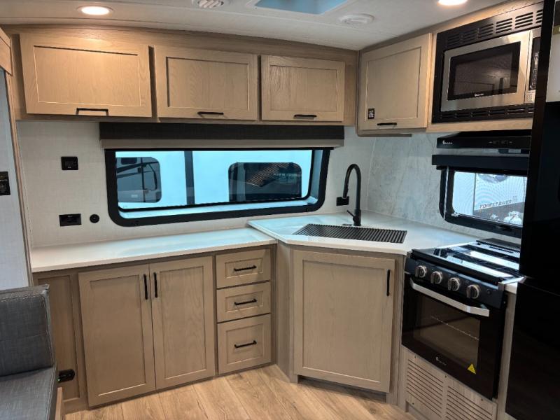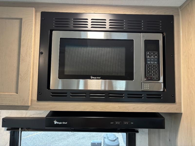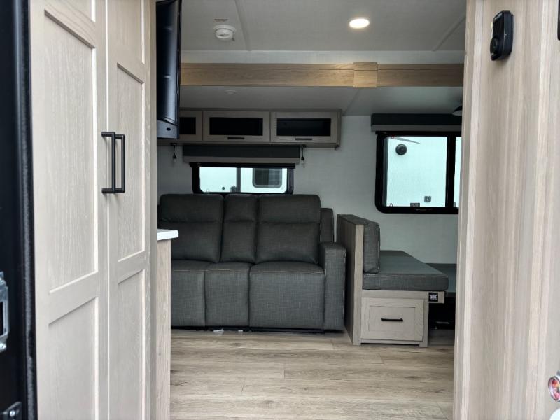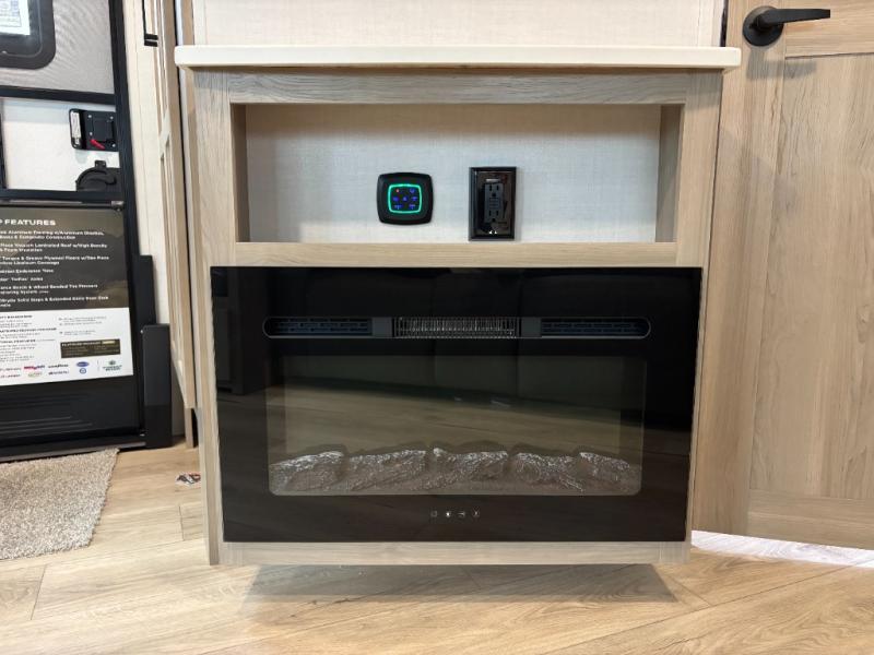 When you are outside this trailer you can enjoy the protection from the 21' power awning, you will also find exterior storage for your extra gear, and a ladder at the rear. You get to choose which entrance to step up into, be it the spacious rear bedroom with a queen bed slide and a wardrobe, or the main entry into the kitchen and living area. The furniture slide includes a booth dinette to eat your meals at, and theater seating to watch the Smart TV with a fireplace below. And the cook will love the front kitchen with extra counter space, a three-burner range, plus a 12V refrigerator and pantry for food storage!