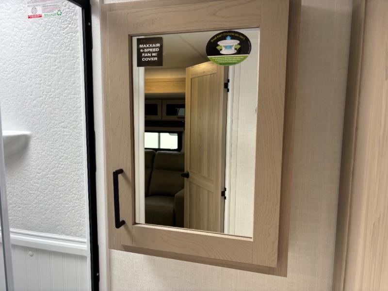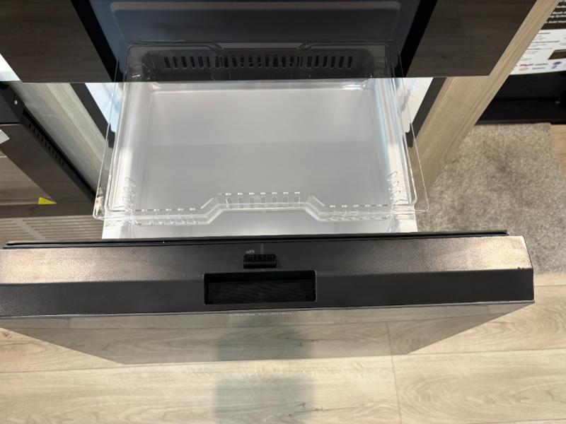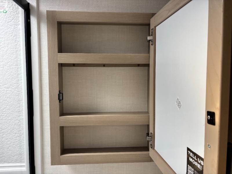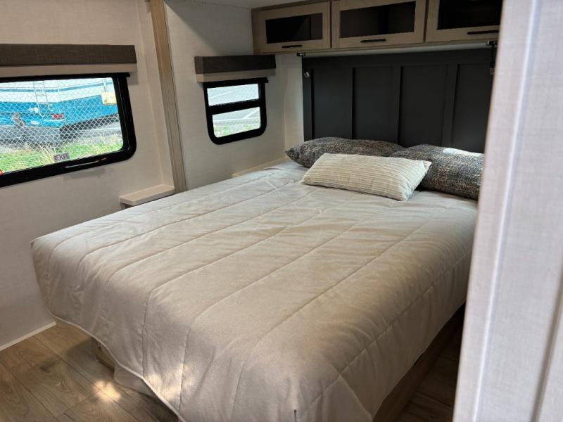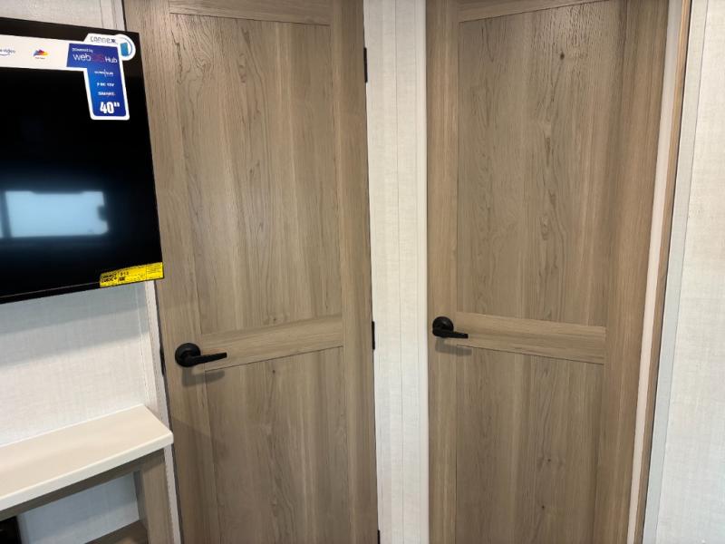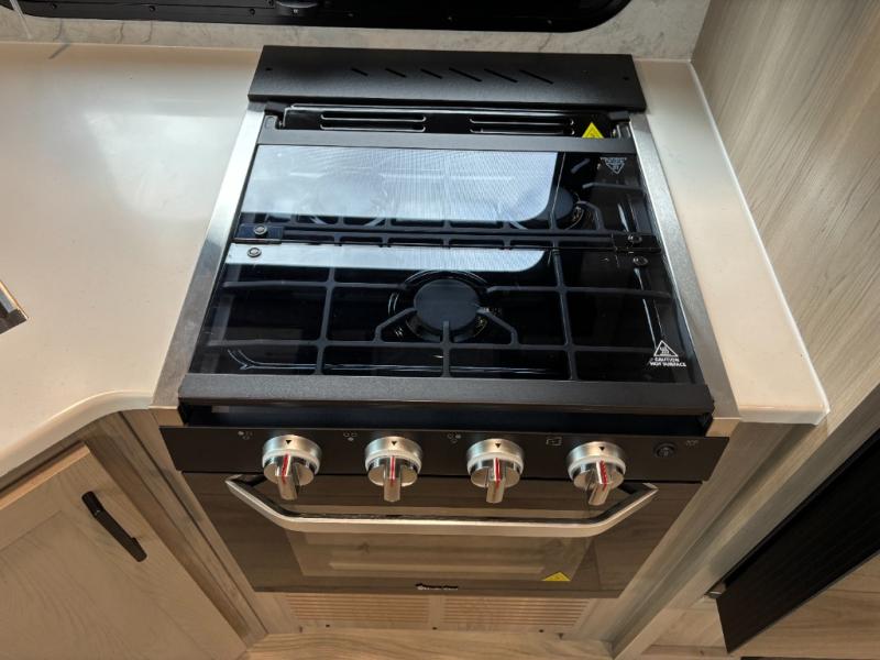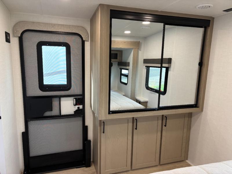 When you are outside this trailer you can enjoy the protection from the 21' power awning, you will also find exterior storage for your extra gear, and a ladder at the rear. You get to choose which entrance to step up into, be it the spacious rear bedroom with a queen bed slide and a wardrobe, or the main entry into the kitchen and living area. The furniture slide includes a booth dinette to eat your meals at, and theater seating to watch the Smart TV with a fireplace below. And the cook will love the front kitchen with extra counter space, a three-burner range, plus a 12V refrigerator and pantry for food storage!