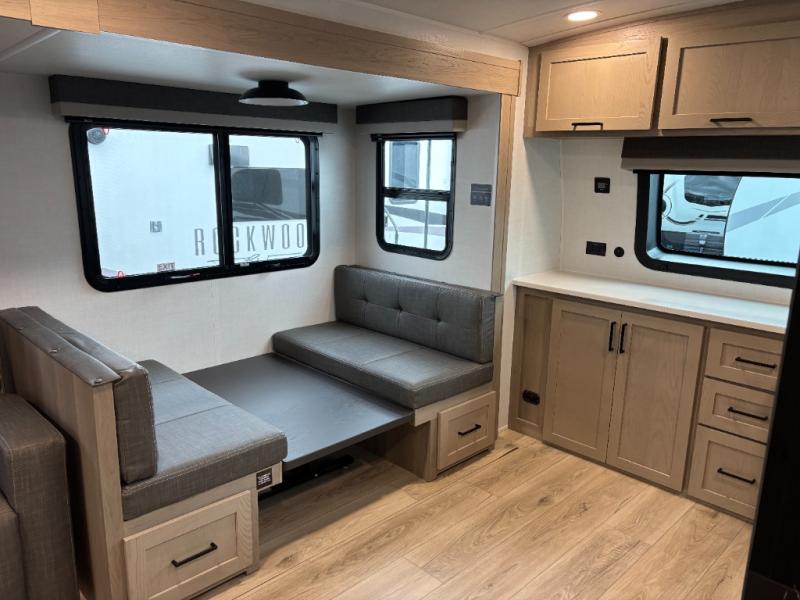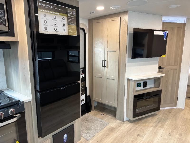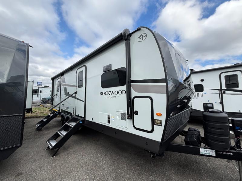 Each Rockwood Ultra Lite travel trailer by Forest River includes superior construction with a high gloss fiberglass cap, aluminum cage construction, and a power awning with LED lighting for a cozy and functional outdoor space. The torsion axle, power tongue jack will make towing smooth and hassle-free, along with the nitrogen filled, Goodyear Endurance tires and the tire pressure monitor system. Interior comforts include kitchen sink with high rise faucet, hidden hinge cabinet doors, and roller shades to name a few. Choose a Rockwood Ultra Lite travel trailer today!