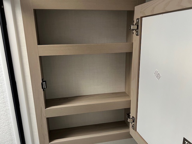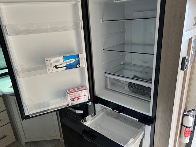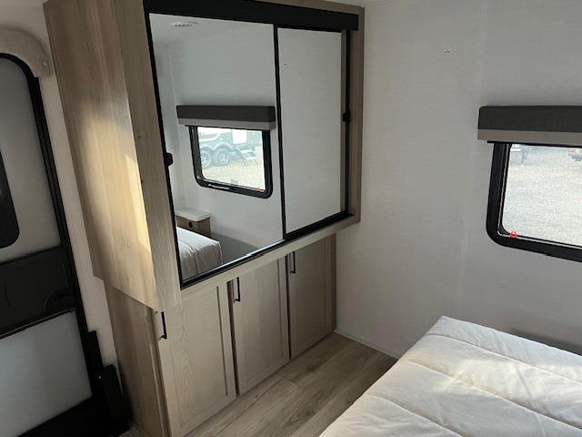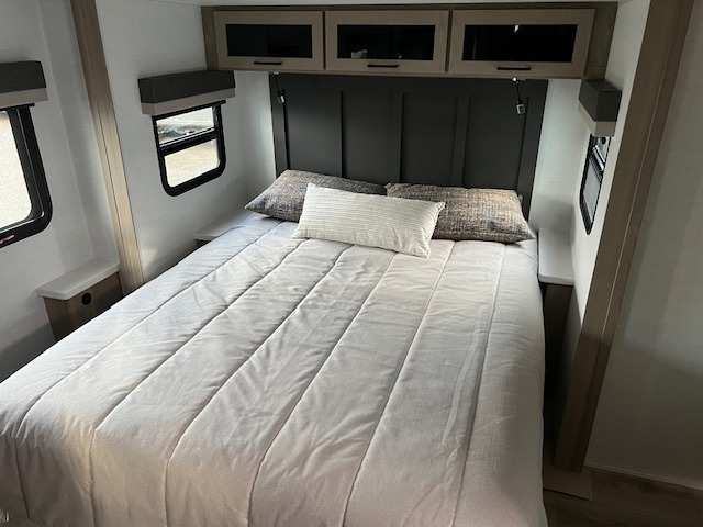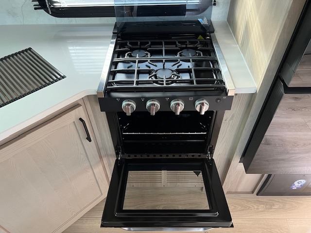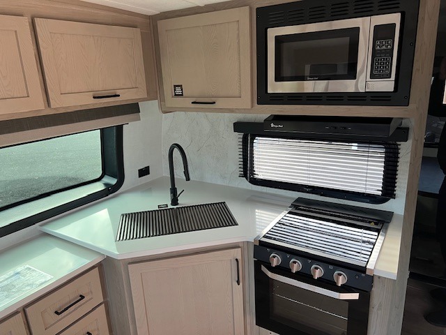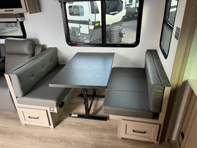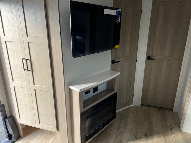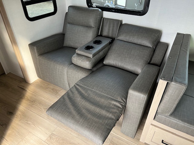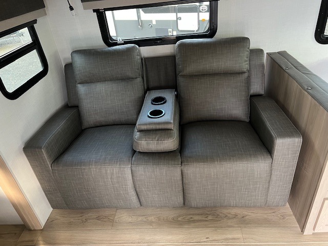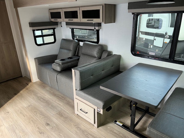 When you are outside this trailer you can enjoy the protection from the 21' power awning, you will also find exterior storage for your extra gear, and a ladder at the rear. You get to choose which entrance to step up into, be it the spacious rear bedroom with a queen bed slide and a wardrobe, or the main entry into the kitchen and living area. The furniture slide includes a booth dinette to eat your meals at, and theater seating to watch the Smart TV with a fireplace below. And the cook will love the front kitchen with extra counter space, a three-burner range, plus a 12V refrigerator and pantry for food storage!
