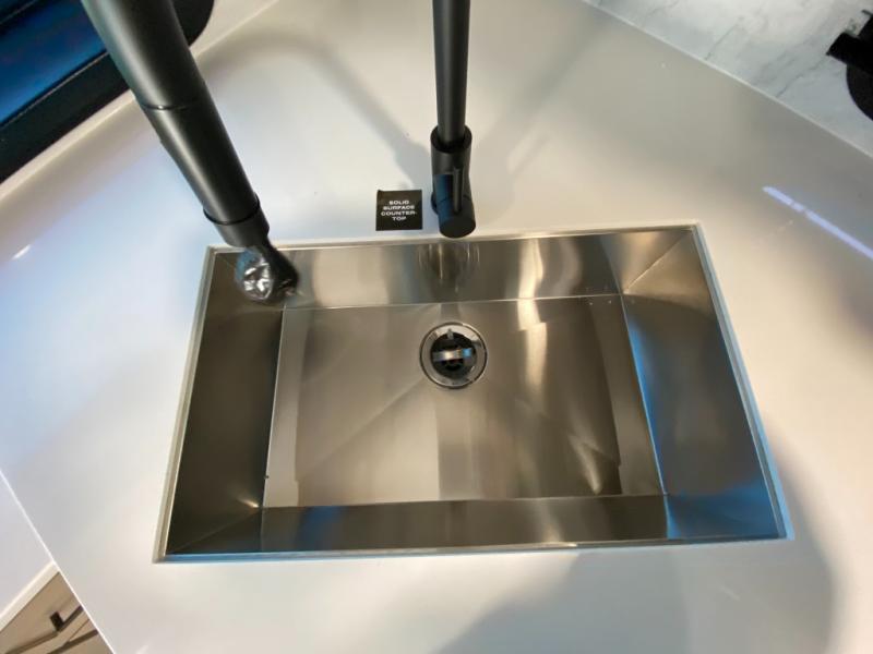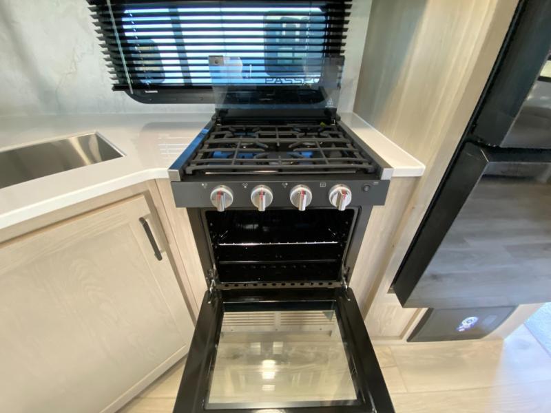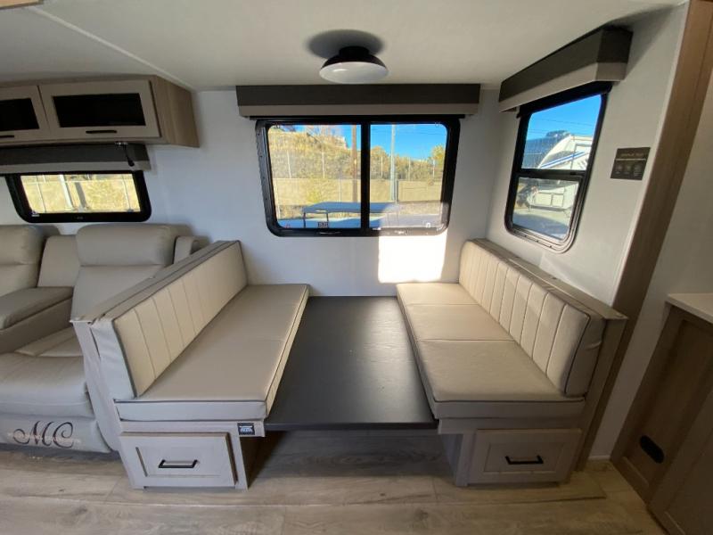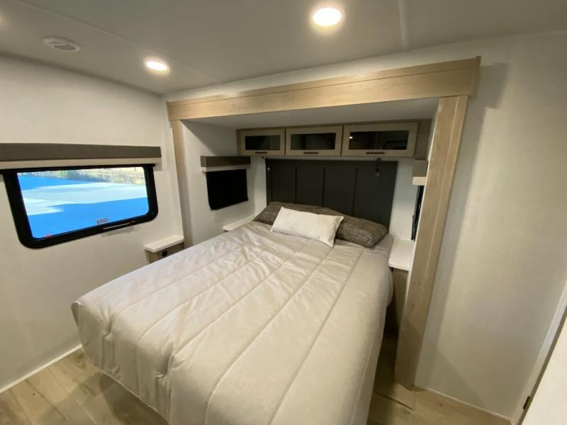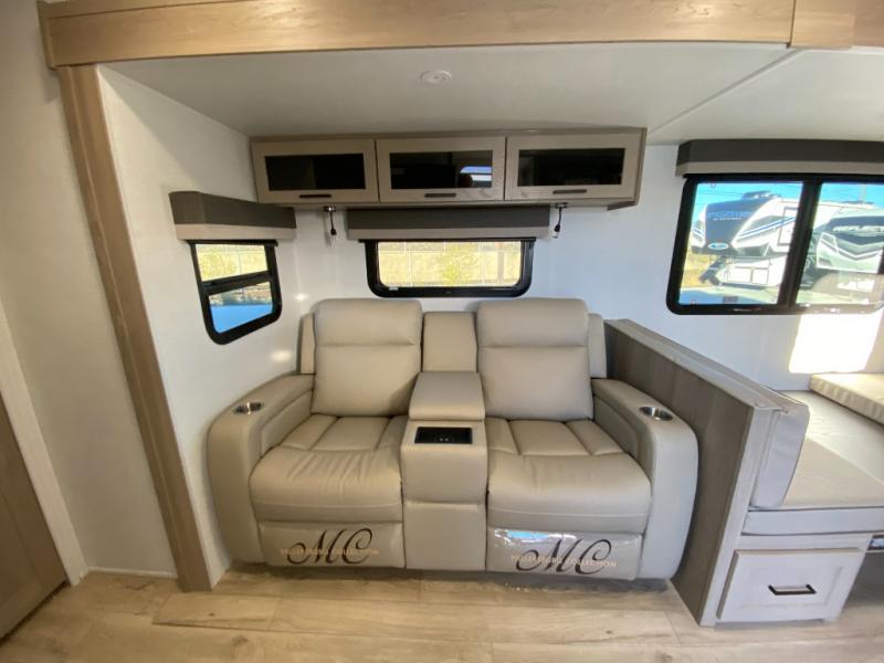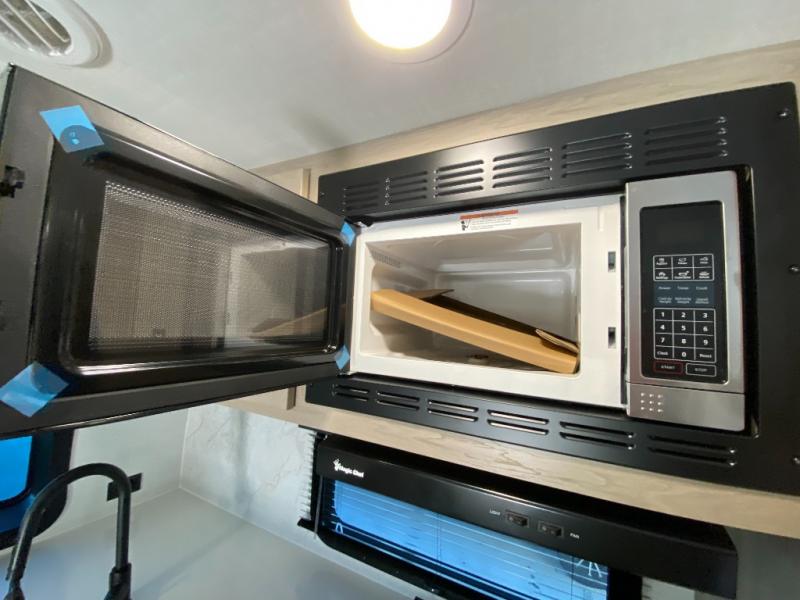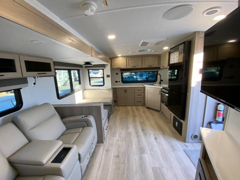 When you are outside this trailer you can enjoy the protection from the 21' power awning, you will also find exterior storage for your extra gear, and a ladder at the rear. You get to choose which entrance to step up into, be it the spacious rear bedroom with a queen bed slide and a wardrobe, or the main entry into the kitchen and living area. The furniture slide includes a booth dinette to eat your meals at, and theater seating to watch the Smart TV with a fireplace below. And the cook will love the front kitchen with extra counter space, a three-burner range, plus a 12V refrigerator and pantry for food storage!