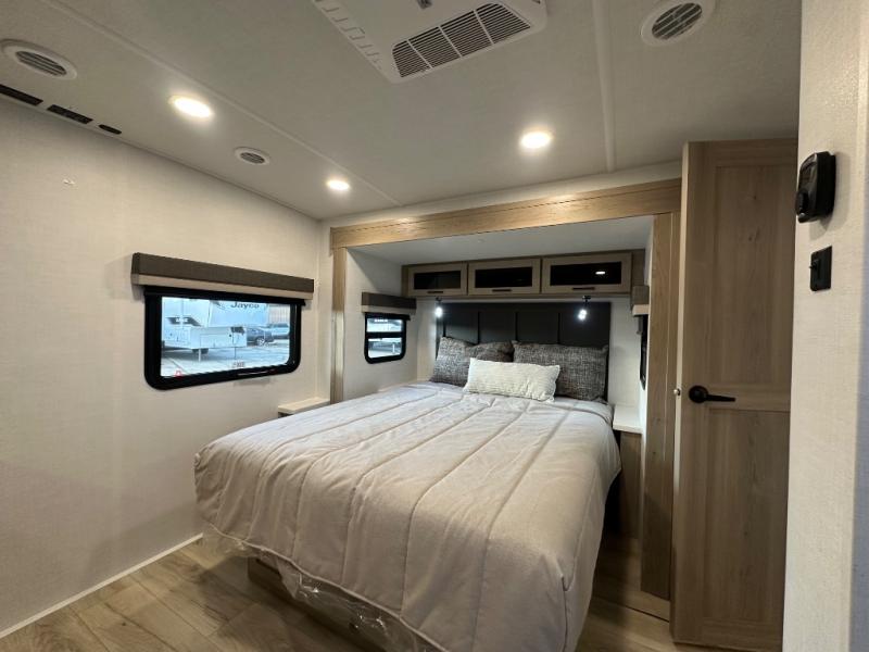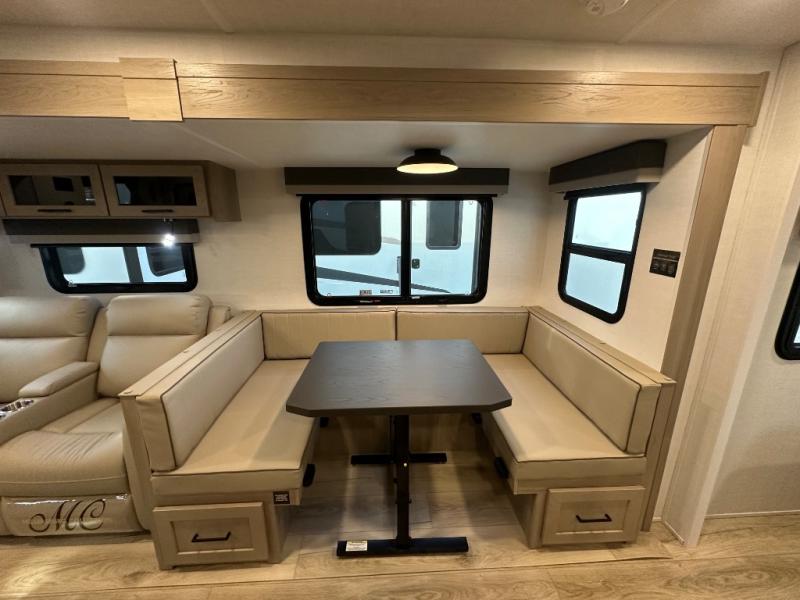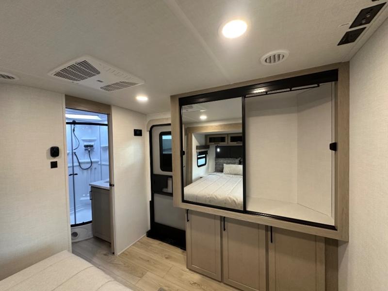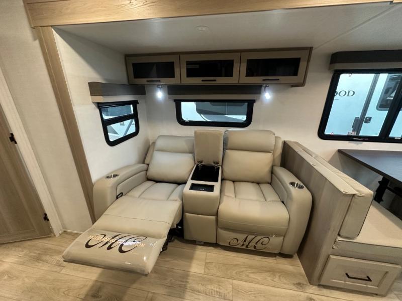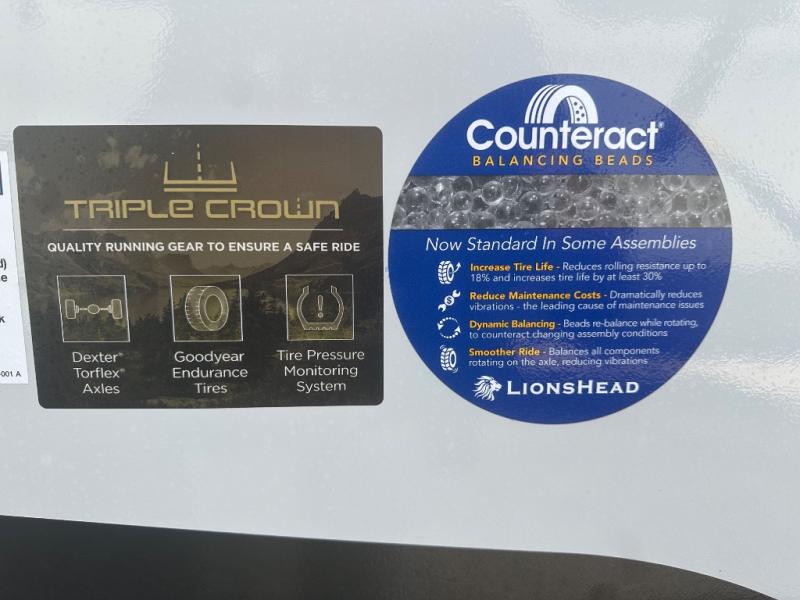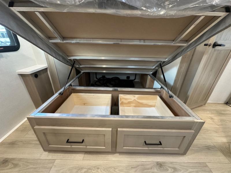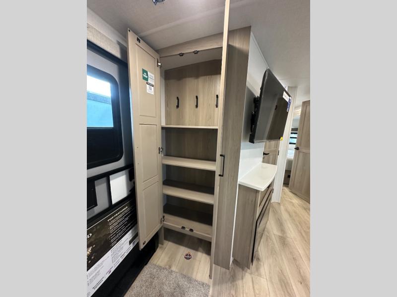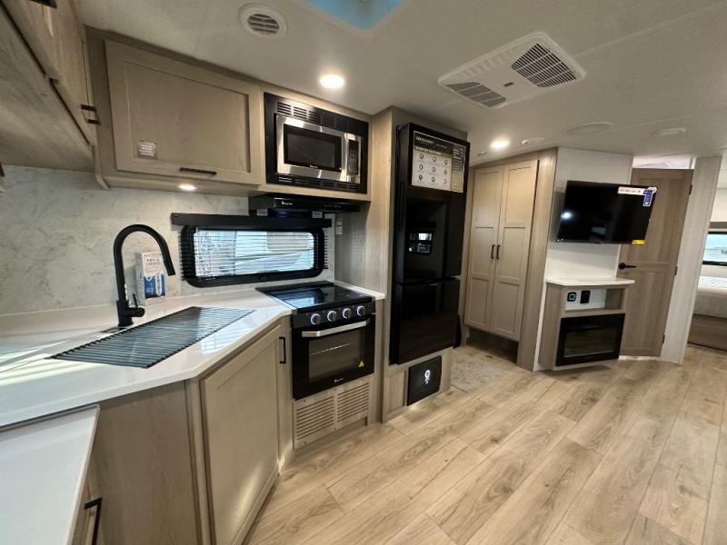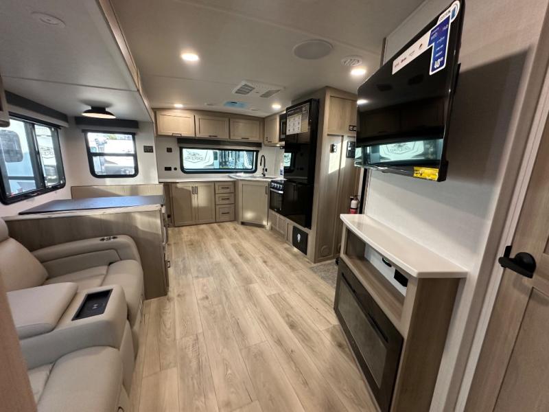 When you are outside this trailer you can enjoy the protection from the 21' power awning, you will also find exterior storage for your extra gear, and a ladder at the rear. You get to choose which entrance to step up into, be it the spacious rear bedroom with a queen bed slide and a wardrobe, or the main entry into the kitchen and living area. The furniture slide includes a booth dinette to eat your meals at, and theater seating to watch the Smart TV with a fireplace below. And the cook will love the front kitchen with extra counter space, a three-burner range, plus a 12V refrigerator and pantry for food storage!