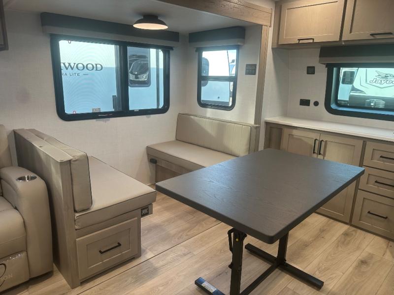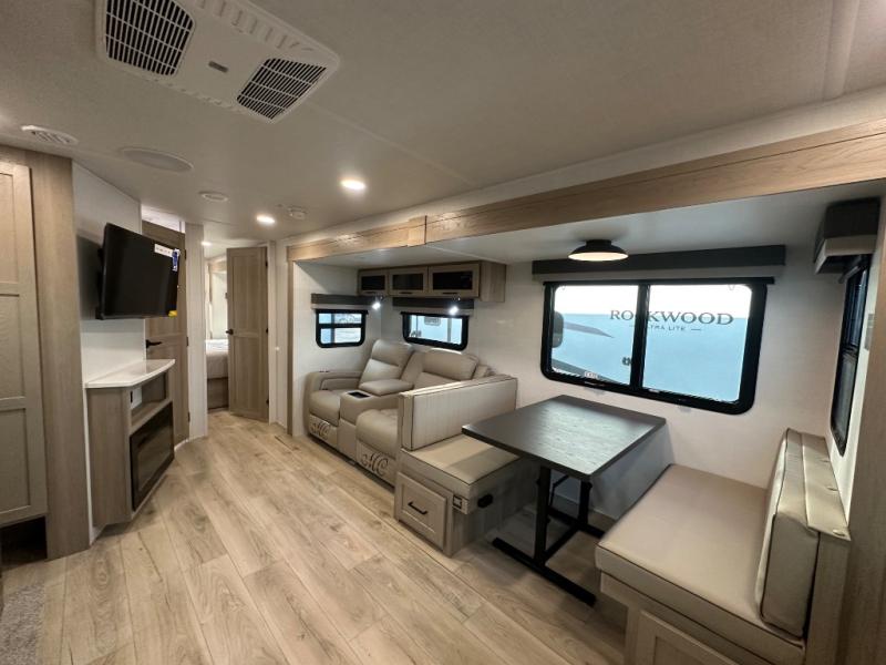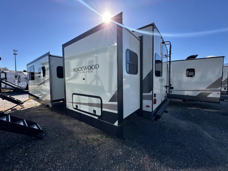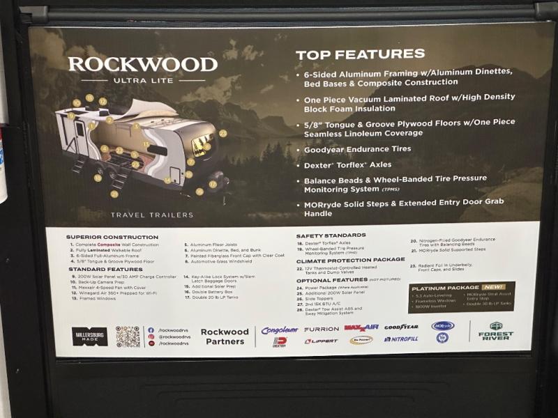 Each Rockwood Ultra Lite travel trailer by Forest River includes superior construction with a high gloss fiberglass cap, aluminum cage construction, and a power awning with LED lighting for a cozy and functional outdoor space. The torsion axle, power tongue jack will make towing smooth and hassle-free, along with the nitrogen filled, Goodyear Endurance tires and the tire pressure monitor system. Interior comforts include kitchen sink with high rise faucet, hidden hinge cabinet doors, and roller shades to name a few. Choose a Rockwood Ultra Lite travel trailer today!