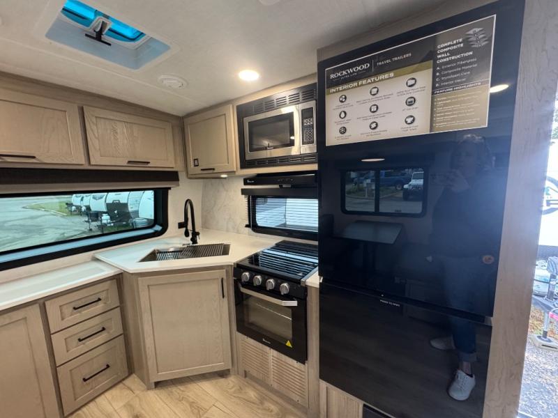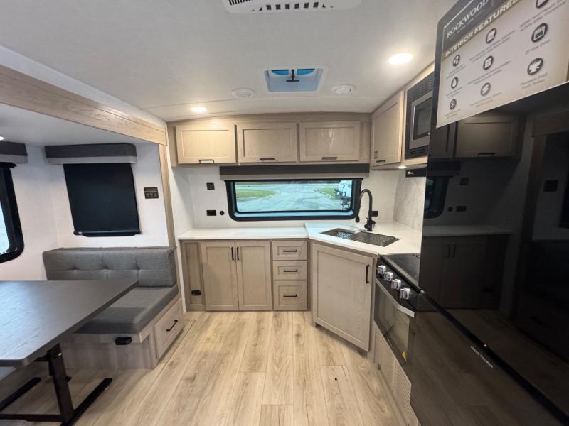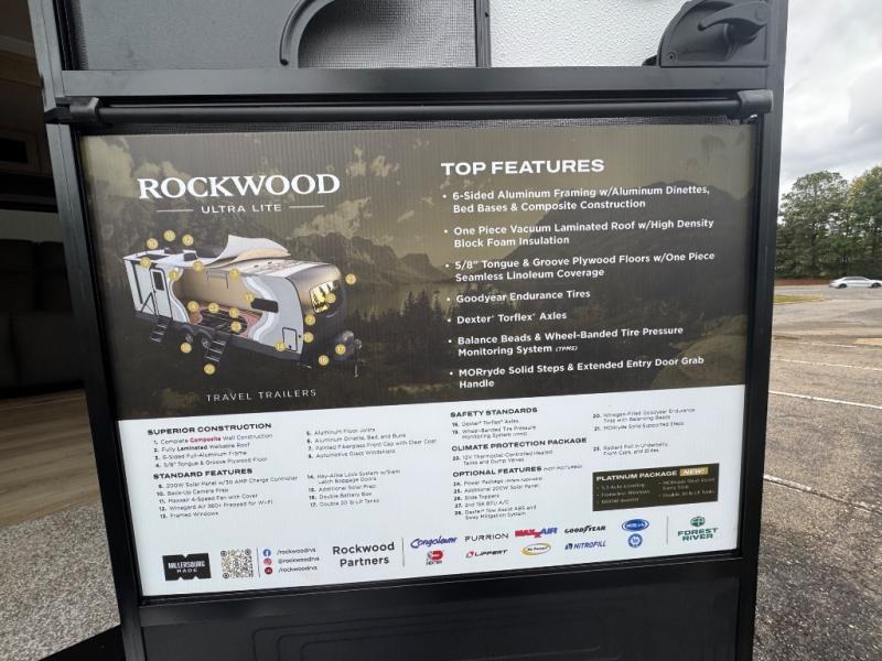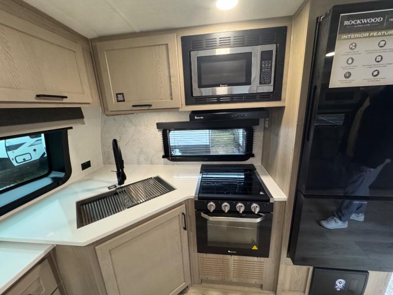 Each Rockwood Ultra Lite travel trailer by Forest River includes superior construction with a high gloss fiberglass cap, aluminum cage construction, and a power awning with LED lighting for a cozy and functional outdoor space. The torsion axle, power tongue jack will make towing smooth and hassle-free, along with the nitrogen filled, Goodyear Endurance tires and the tire pressure monitor system. Interior comforts include kitchen sink with high rise faucet, hidden hinge cabinet doors, and roller shades to name a few. Choose a Rockwood Ultra Lite travel trailer today!