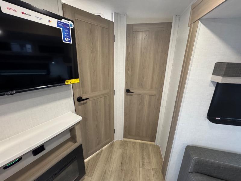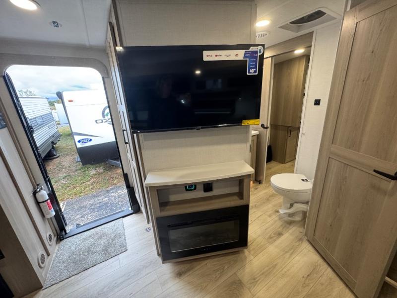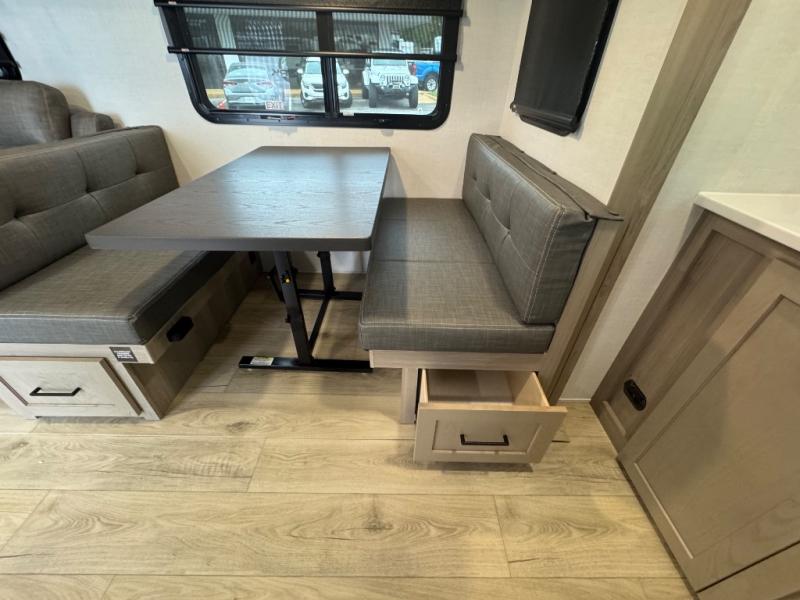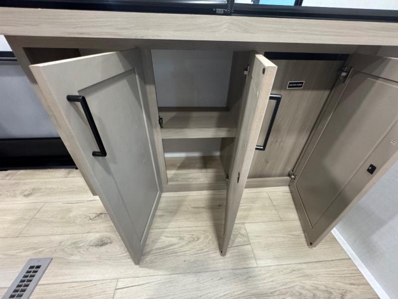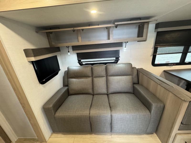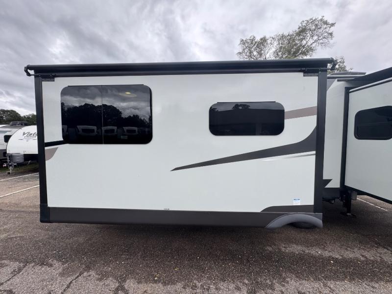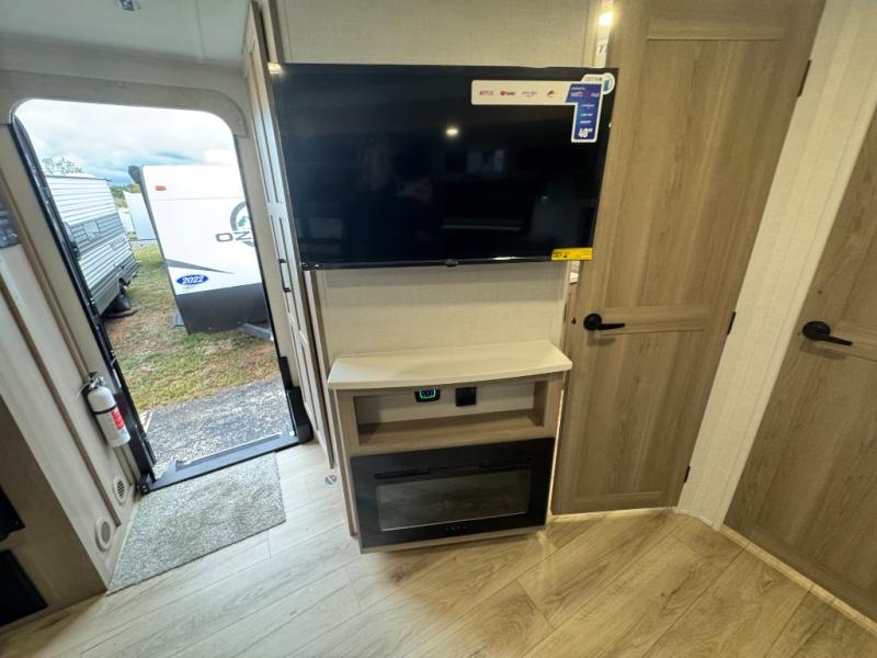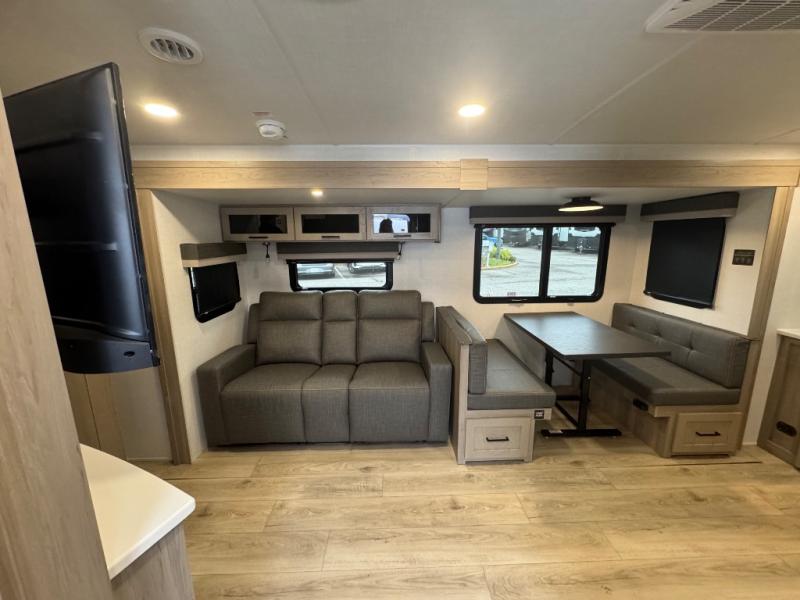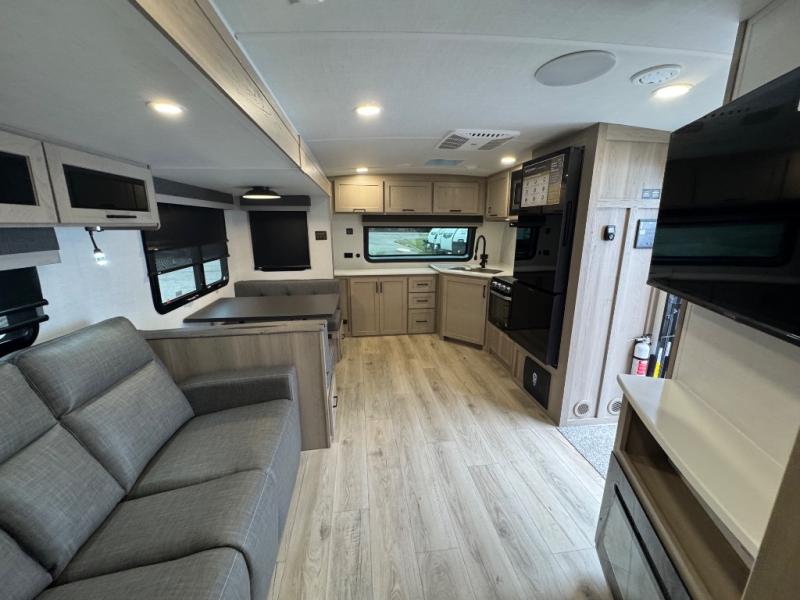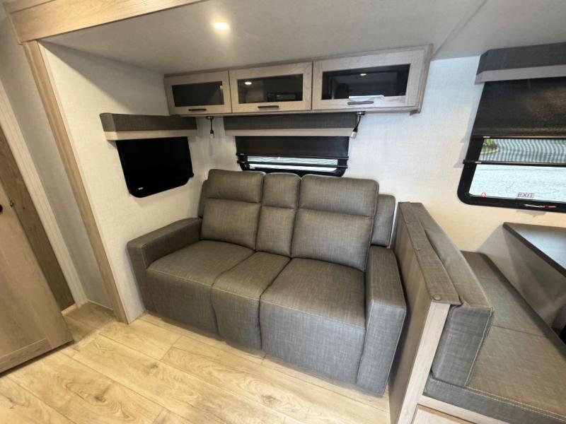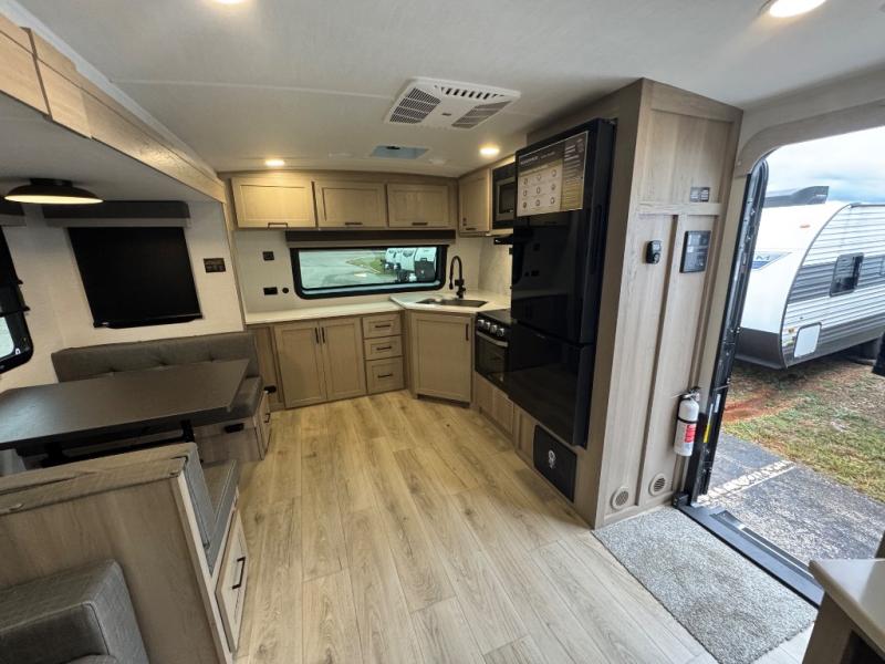 When you are outside this trailer you can enjoy the protection from the 21' power awning, you will also find exterior storage for your extra gear, and a ladder at the rear. You get to choose which entrance to step up into, be it the spacious rear bedroom with a queen bed slide and a wardrobe, or the main entry into the kitchen and living area. The furniture slide includes a booth dinette to eat your meals at, and theater seating to watch the Smart TV with a fireplace below. And the cook will love the front kitchen with extra counter space, a three-burner range, plus a 12V refrigerator and pantry for food storage!
