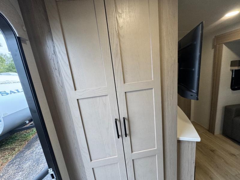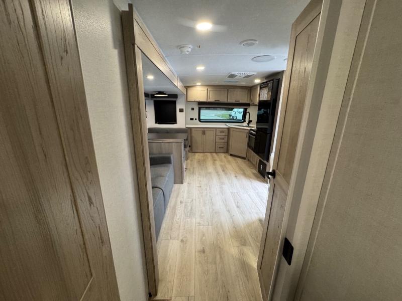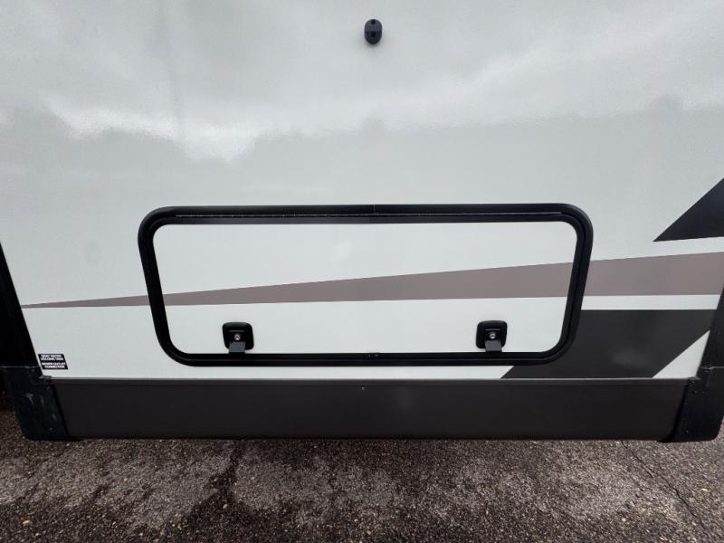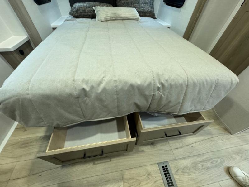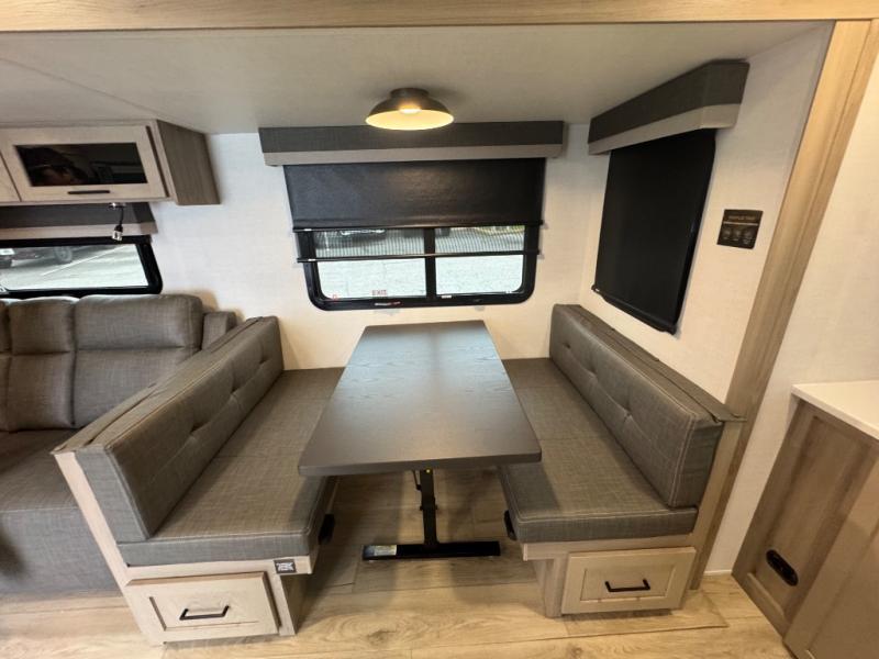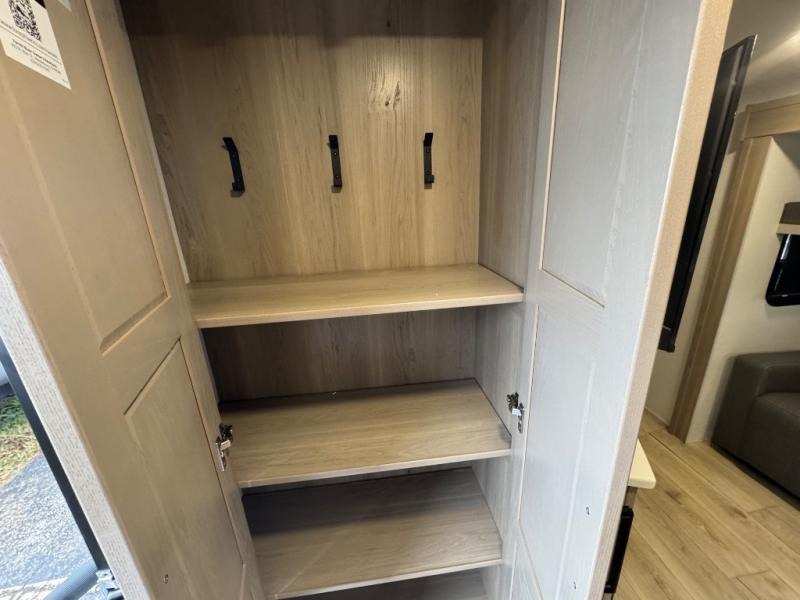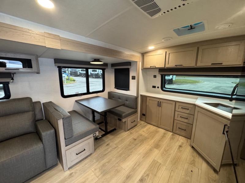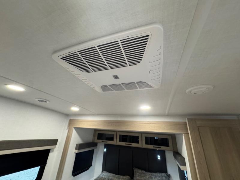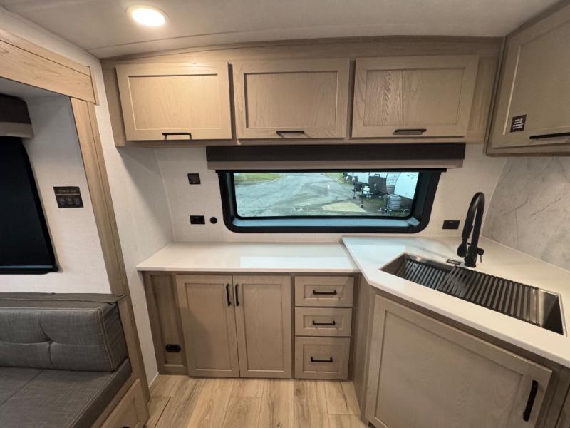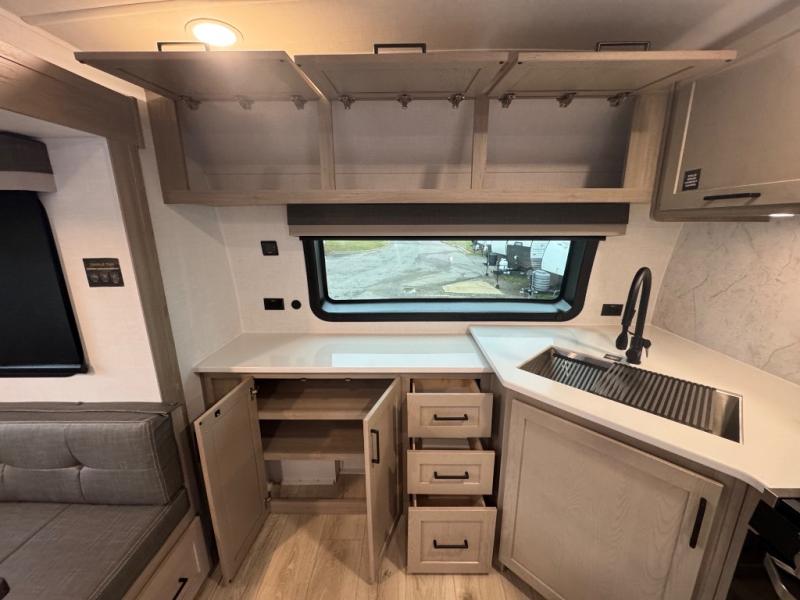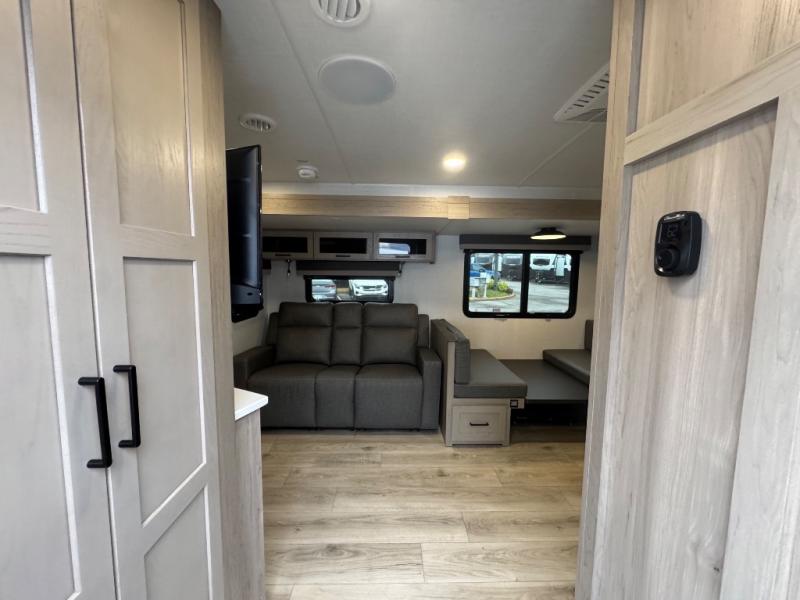 When you are outside this trailer you can enjoy the protection from the 21' power awning, you will also find exterior storage for your extra gear, and a ladder at the rear. You get to choose which entrance to step up into, be it the spacious rear bedroom with a queen bed slide and a wardrobe, or the main entry into the kitchen and living area. The furniture slide includes a booth dinette to eat your meals at, and theater seating to watch the Smart TV with a fireplace below. And the cook will love the front kitchen with extra counter space, a three-burner range, plus a 12V refrigerator and pantry for food storage!