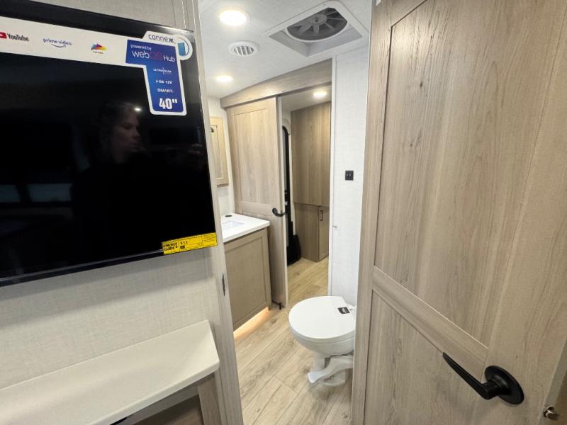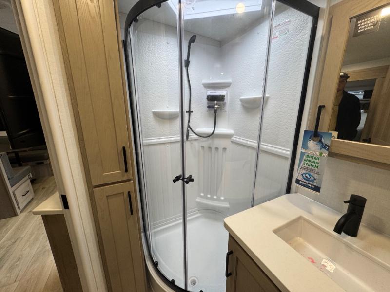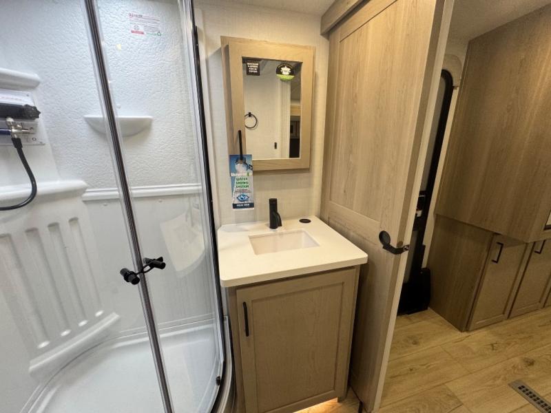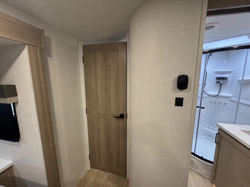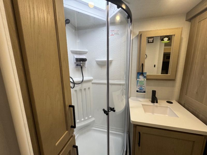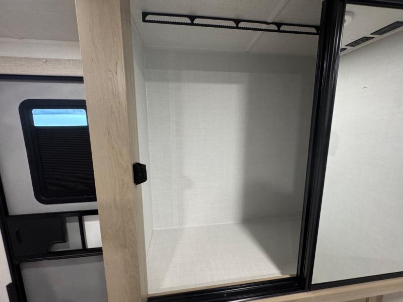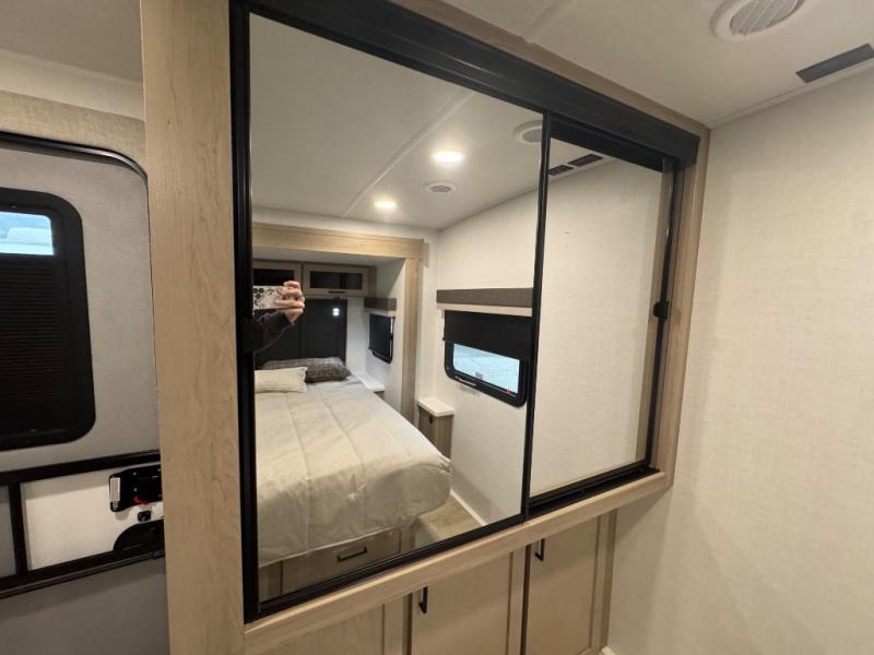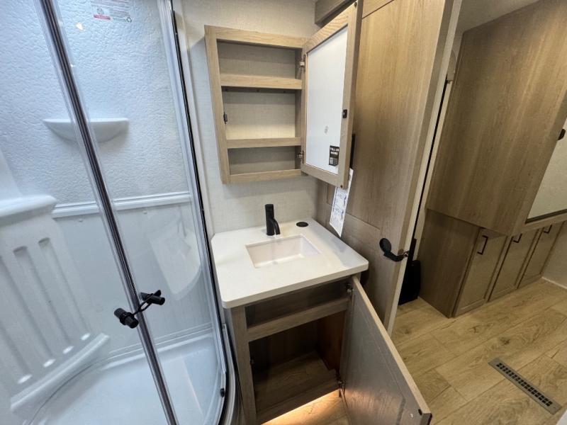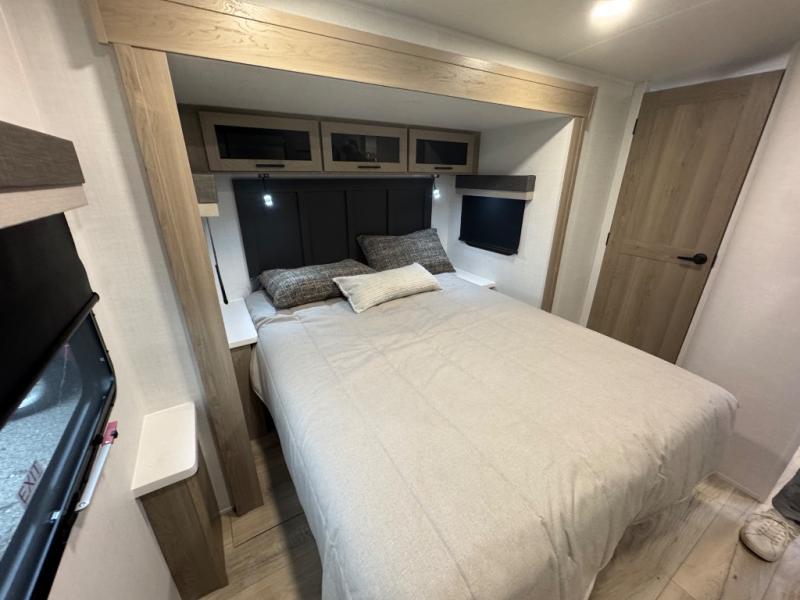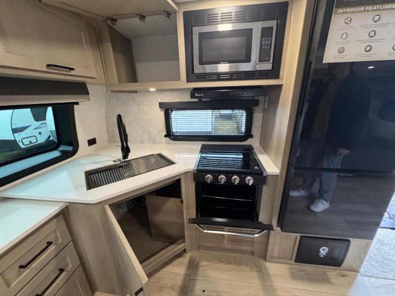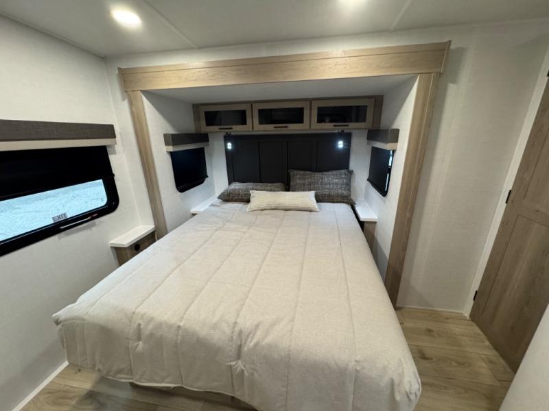 When you are outside this trailer you can enjoy the protection from the 21' power awning, you will also find exterior storage for your extra gear, and a ladder at the rear. You get to choose which entrance to step up into, be it the spacious rear bedroom with a queen bed slide and a wardrobe, or the main entry into the kitchen and living area. The furniture slide includes a booth dinette to eat your meals at, and theater seating to watch the Smart TV with a fireplace below. And the cook will love the front kitchen with extra counter space, a three-burner range, plus a 12V refrigerator and pantry for food storage!