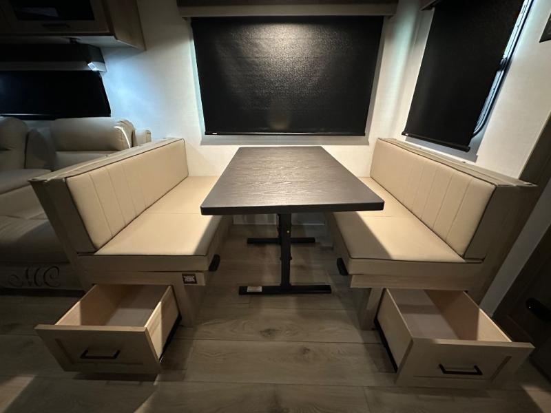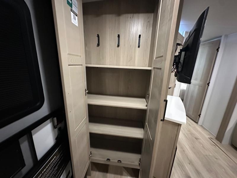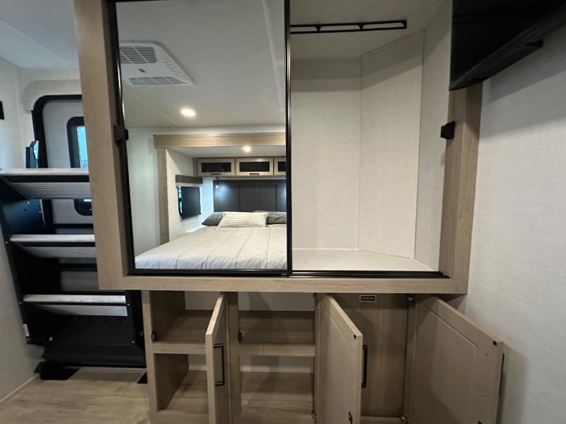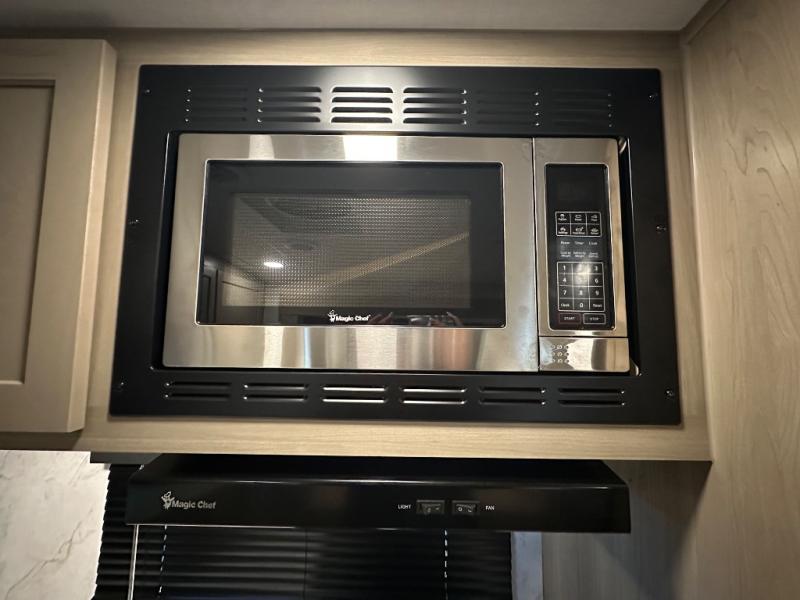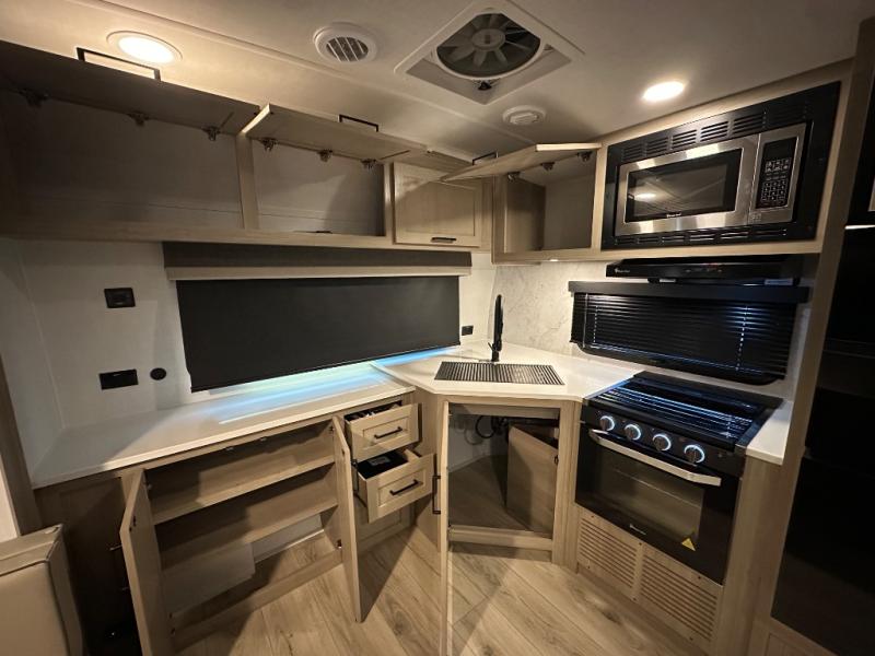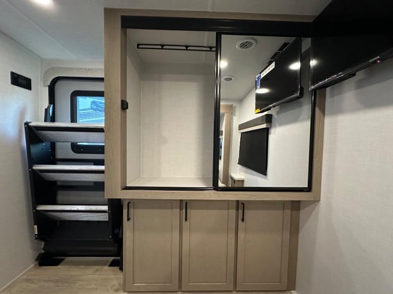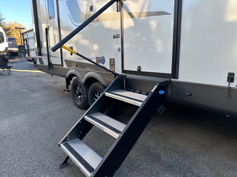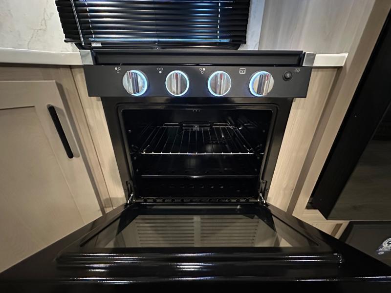 When you are outside this trailer you can enjoy the protection from the 21' power awning, you will also find exterior storage for your extra gear, and a ladder at the rear. You get to choose which entrance to step up into, be it the spacious rear bedroom with a queen bed slide and a wardrobe, or the main entry into the kitchen and living area. The furniture slide includes a booth dinette to eat your meals at, and theater seating to watch the Smart TV with a fireplace below. And the cook will love the front kitchen with extra counter space, a three-burner range, plus a 12V refrigerator and pantry for food storage!