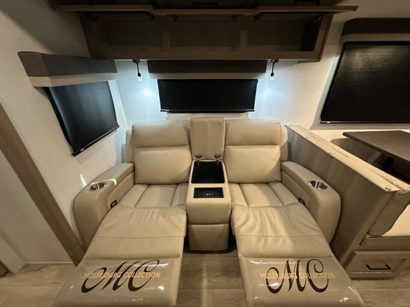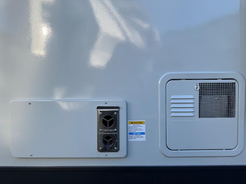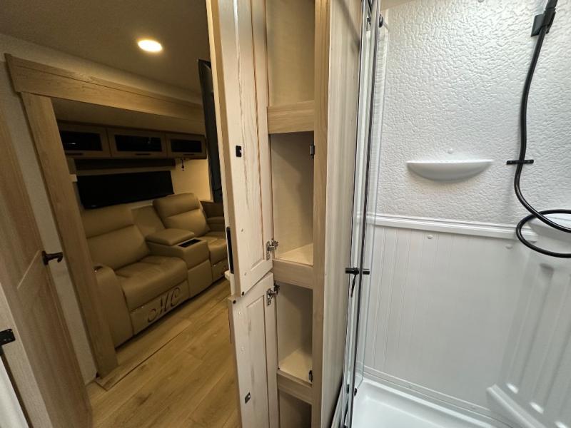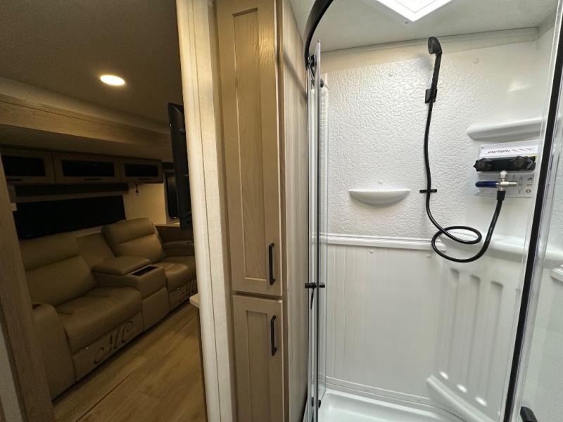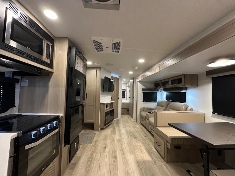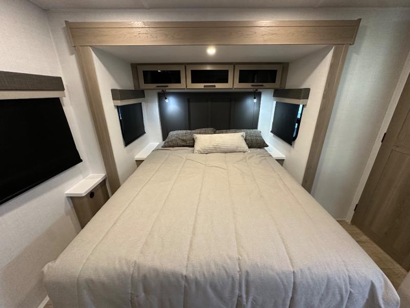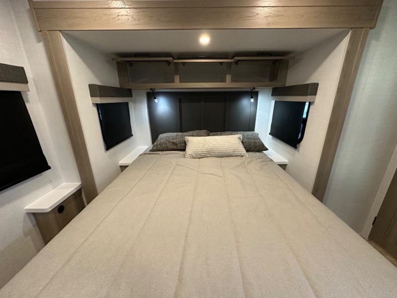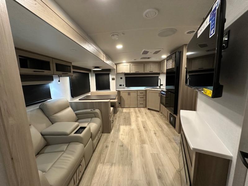 When you are outside this trailer you can enjoy the protection from the 21' power awning, you will also find exterior storage for your extra gear, and a ladder at the rear. You get to choose which entrance to step up into, be it the spacious rear bedroom with a queen bed slide and a wardrobe, or the main entry into the kitchen and living area. The furniture slide includes a booth dinette to eat your meals at, and theater seating to watch the Smart TV with a fireplace below. And the cook will love the front kitchen with extra counter space, a three-burner range, plus a 12V refrigerator and pantry for food storage!