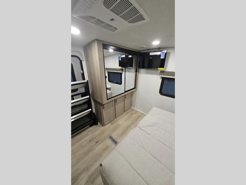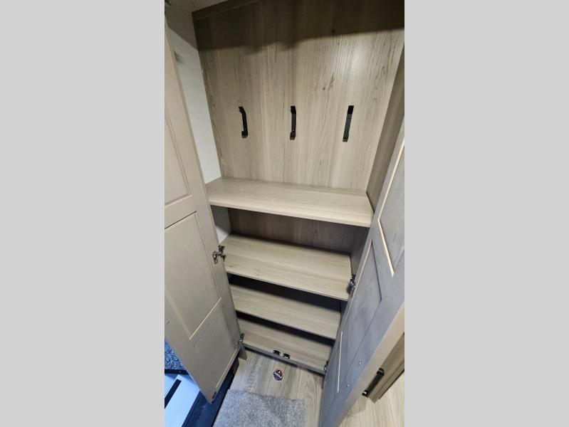 When you are outside this trailer you can enjoy the protection from the 21' power awning, you will also find exterior storage for your extra gear, and a ladder at the rear. You get to choose which entrance to step up into, be it the spacious rear bedroom with a queen bed slide and a wardrobe, or the main entry into the kitchen and living area. The furniture slide includes a booth dinette to eat your meals at, and theater seating to watch the Smart TV with a fireplace below. And the cook will love the front kitchen with extra counter space, a three-burner range, plus a 12V refrigerator and pantry for food storage!