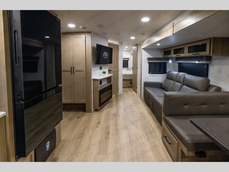 When you are outside this trailer you can enjoy the protection from the 21' power awning, you will also find exterior storage for your extra gear, and a ladder at the rear. You get to choose which entrance to step up into, be it the spacious rear bedroom with a queen bed slide and a wardrobe, or the main entry into the kitchen and living area. The furniture slide includes a booth dinette to eat your meals at, and theater seating to watch the Smart TV with a fireplace below. And the cook will love the front kitchen with extra counter space, a three-burner range, plus a 12V refrigerator and pantry for food storage!
