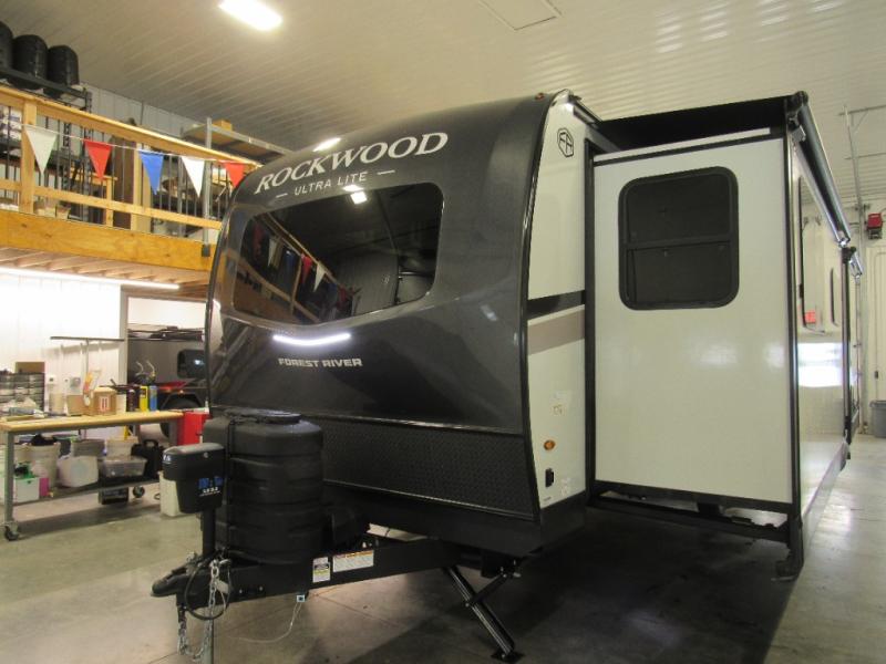 Each Rockwood Ultra Lite travel trailer by Forest River includes superior construction with a high gloss fiberglass cap, aluminum cage construction, and a power awning with LED lighting for a cozy and functional outdoor space. The torsion axle, power tongue jack will make towing smooth and hassle-free, along with the nitrogen filled, Goodyear Endurance tires and the tire pressure monitor system. Interior comforts include kitchen sink with high rise faucet, hidden hinge cabinet doors, and roller shades to name a few. Choose a Rockwood Ultra Lite travel trailer today!