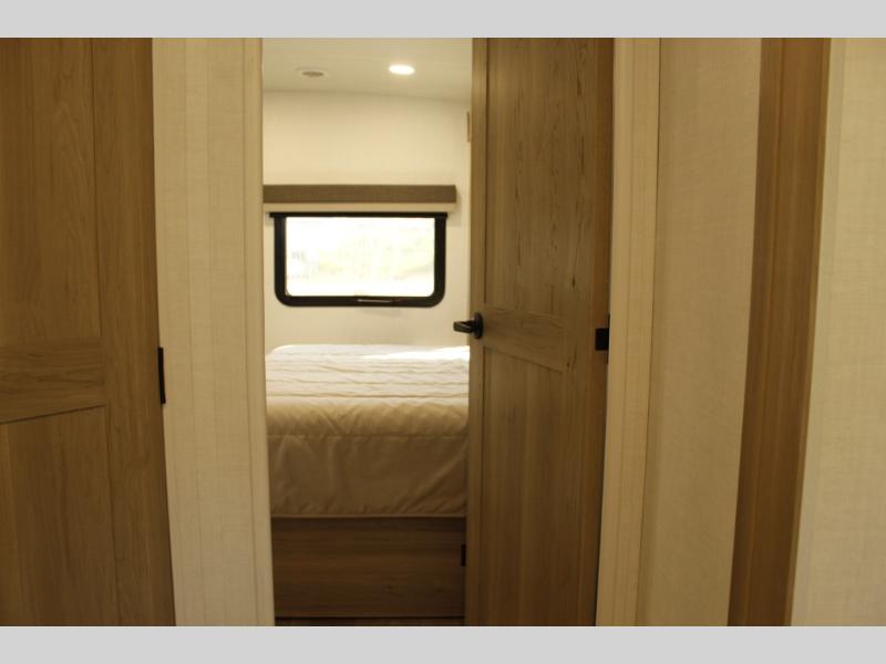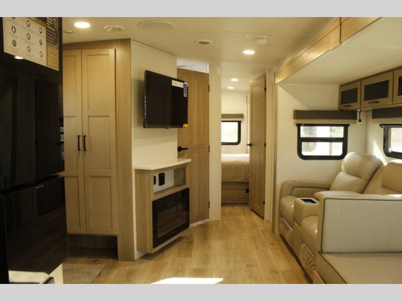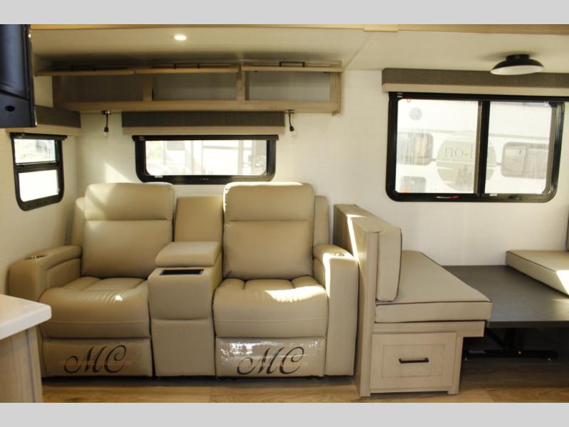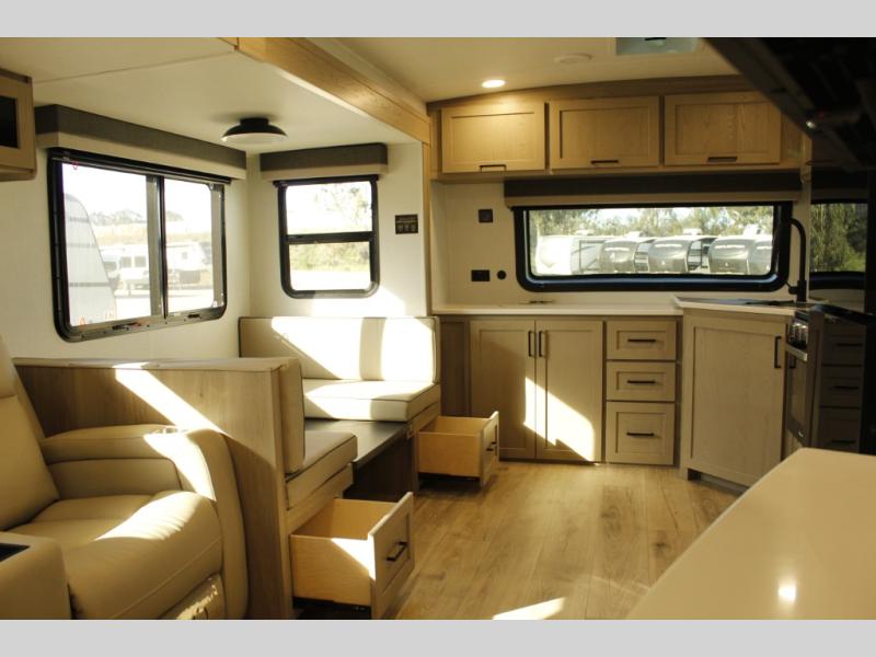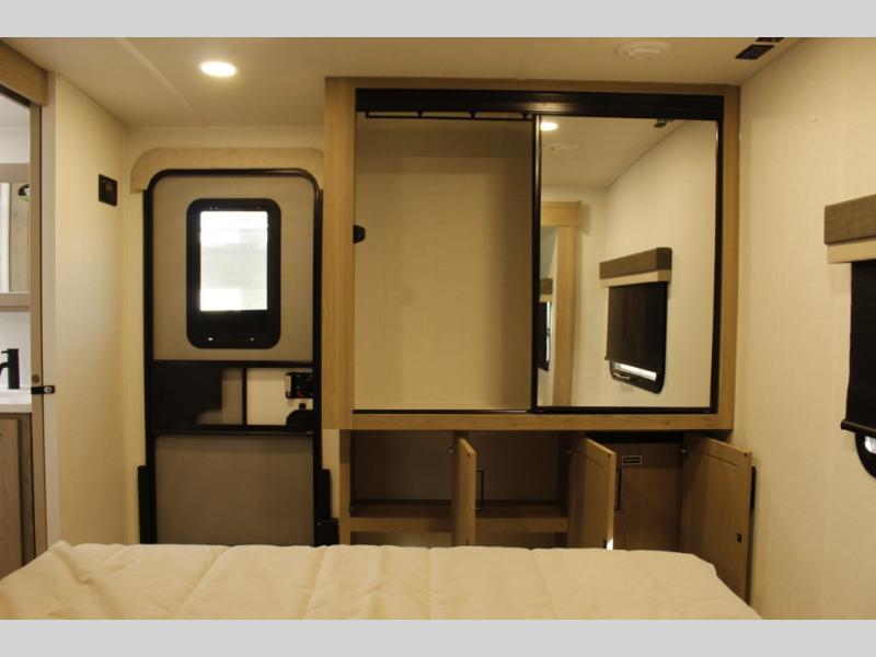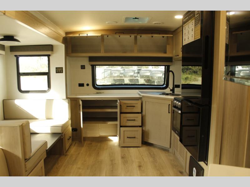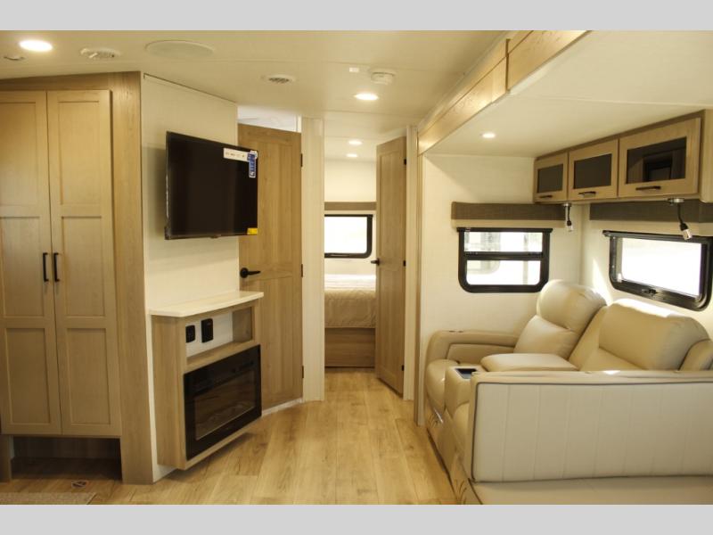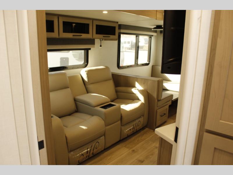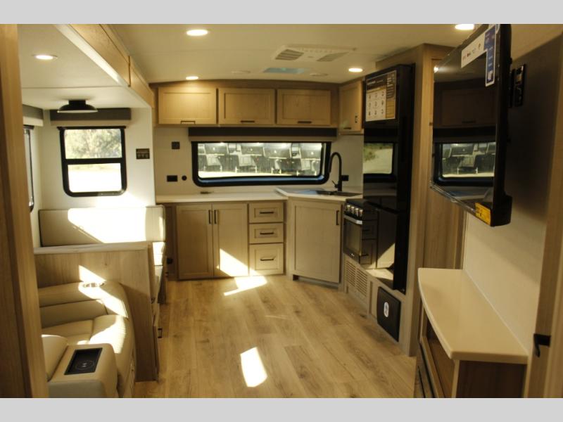 When you are outside this trailer you can enjoy the protection from the 21' power awning, you will also find exterior storage for your extra gear, and a ladder at the rear. You get to choose which entrance to step up into, be it the spacious rear bedroom with a queen bed slide and a wardrobe, or the main entry into the kitchen and living area. The furniture slide includes a booth dinette to eat your meals at, and theater seating to watch the Smart TV with a fireplace below. And the cook will love the front kitchen with extra counter space, a three-burner range, plus a 12V refrigerator and pantry for food storage!