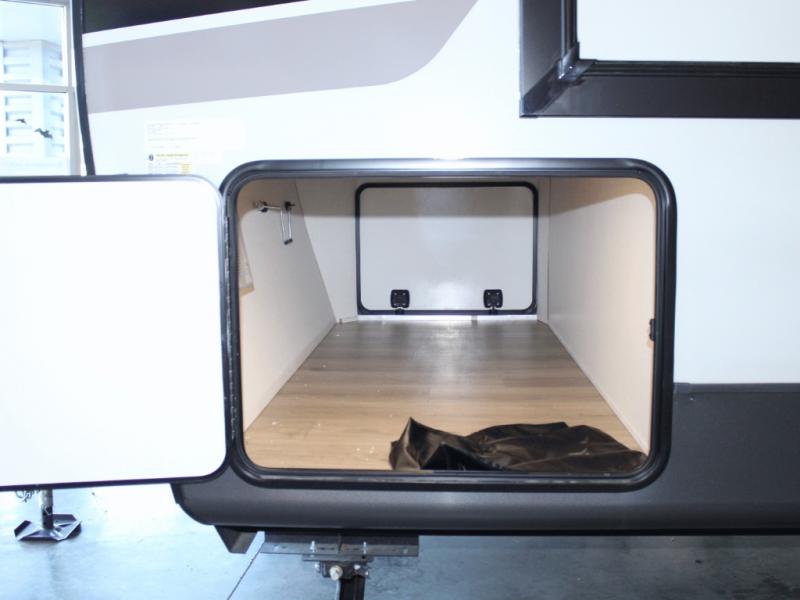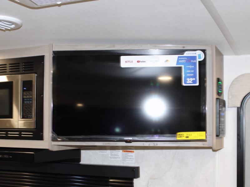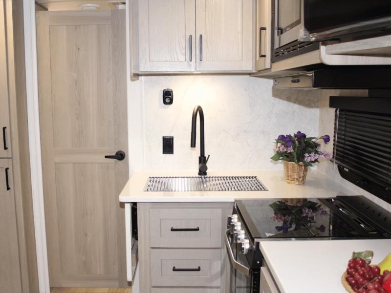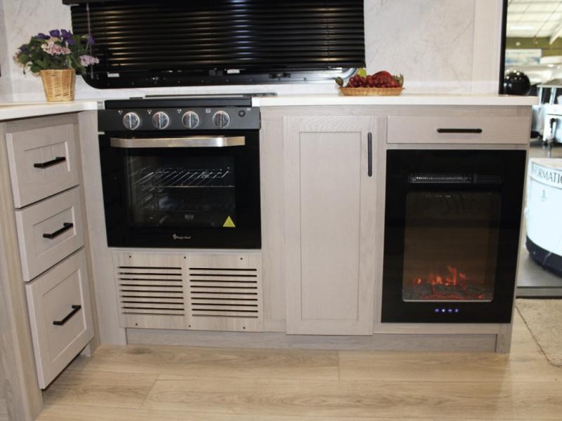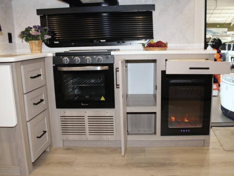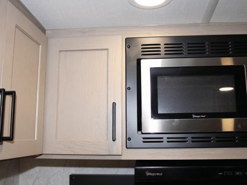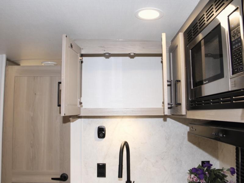 Create delicious meals in the fully-equipped kitchen, featuring a three-burner cooktop, oven, microwave, and a spacious 12V refrigerator. Tons of counter space and cabinetry make prepping, cooking, and cleaning up a breeze. Want to take the party outside? The 21' power awning with LED lighting creates a perfect outdoor living area, whether you're grilling, chilling, or both.