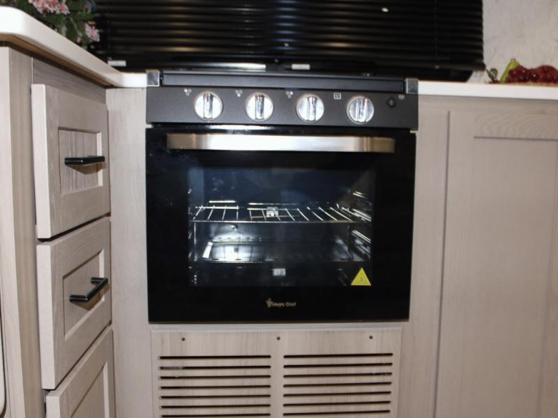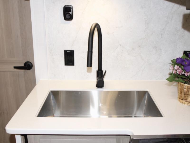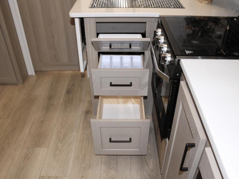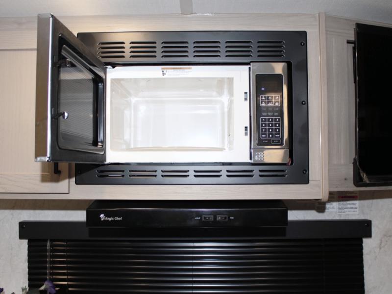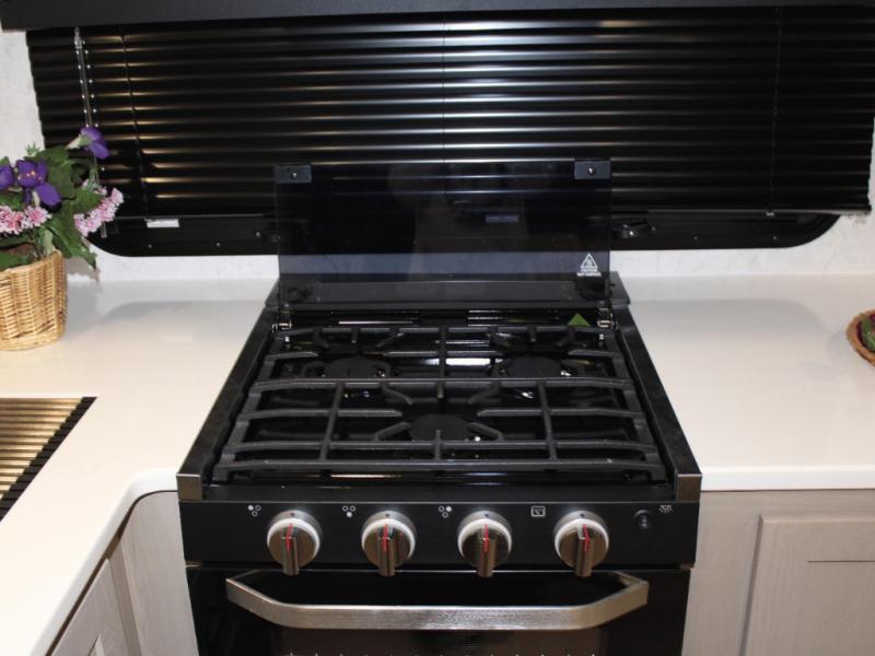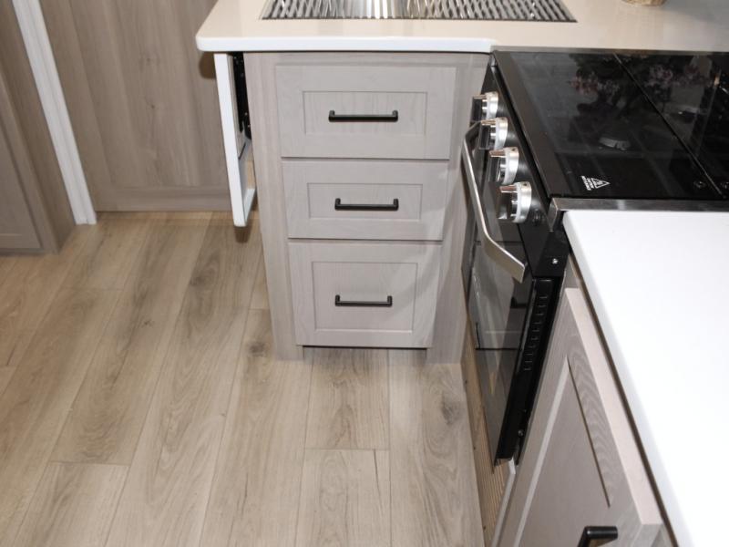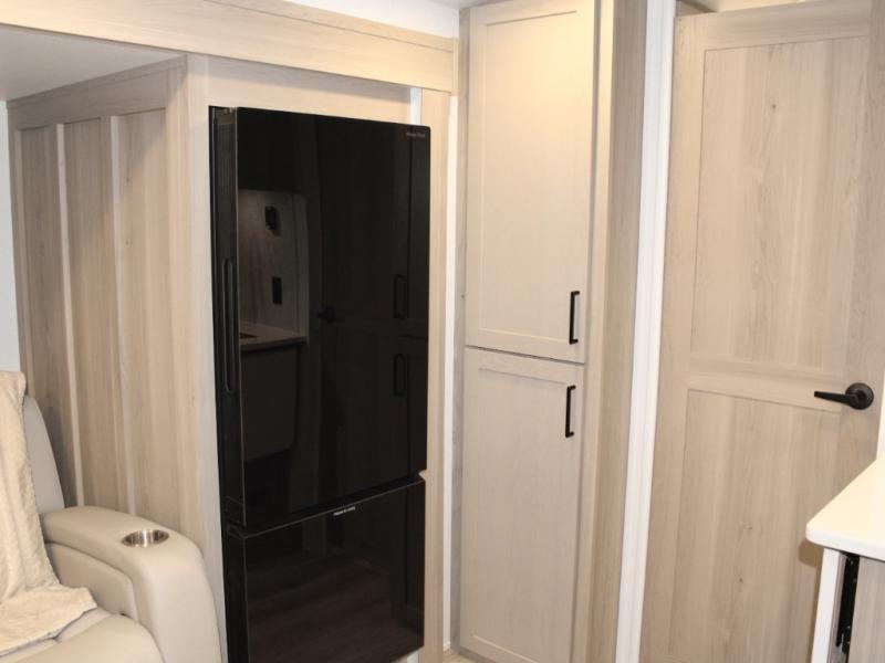 Create delicious meals in the fully-equipped kitchen, featuring a three-burner cooktop, oven, microwave, and a spacious 12V refrigerator. Tons of counter space and cabinetry make prepping, cooking, and cleaning up a breeze. Want to take the party outside? The 21' power awning with LED lighting creates a perfect outdoor living area, whether you're grilling, chilling, or both.