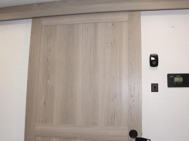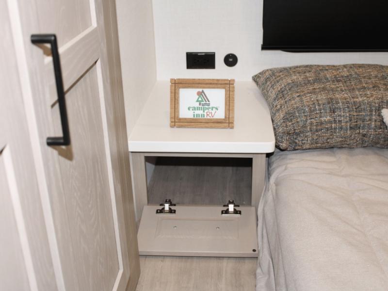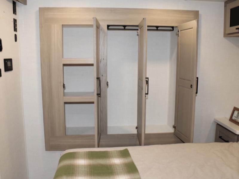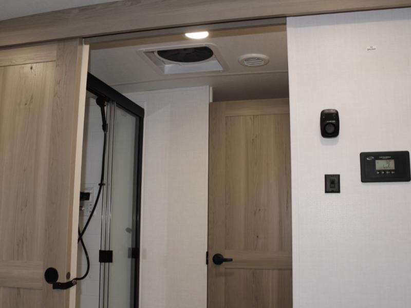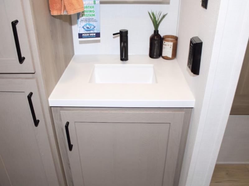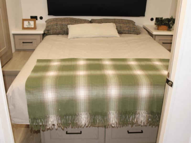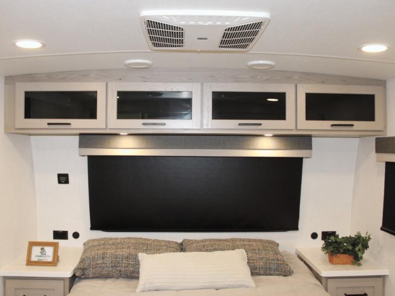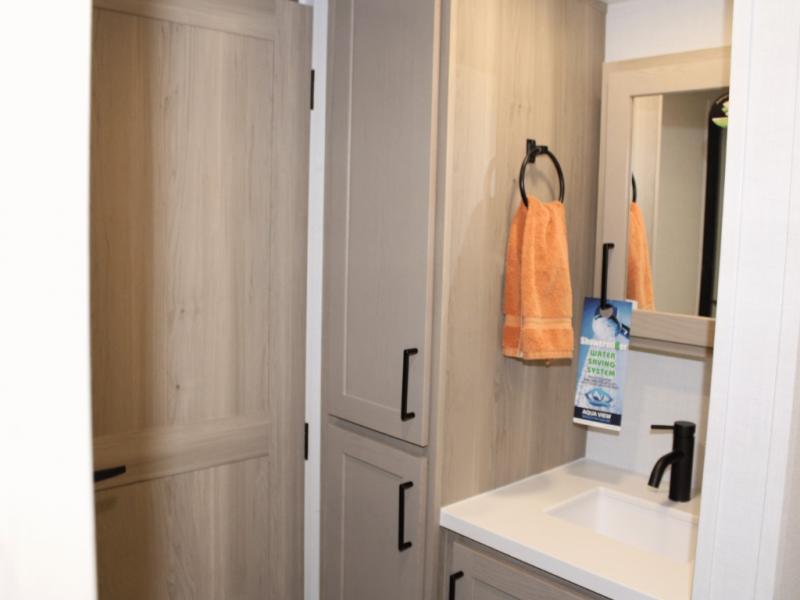 Conveniently located between the living space and bedroom, the walk-thru bathroom allows easy access from either end of the trailer. It’s spacious, well-lit, and offers a large radius shower, mirrored medicine cabinet, and ample storage for towels and toiletries.