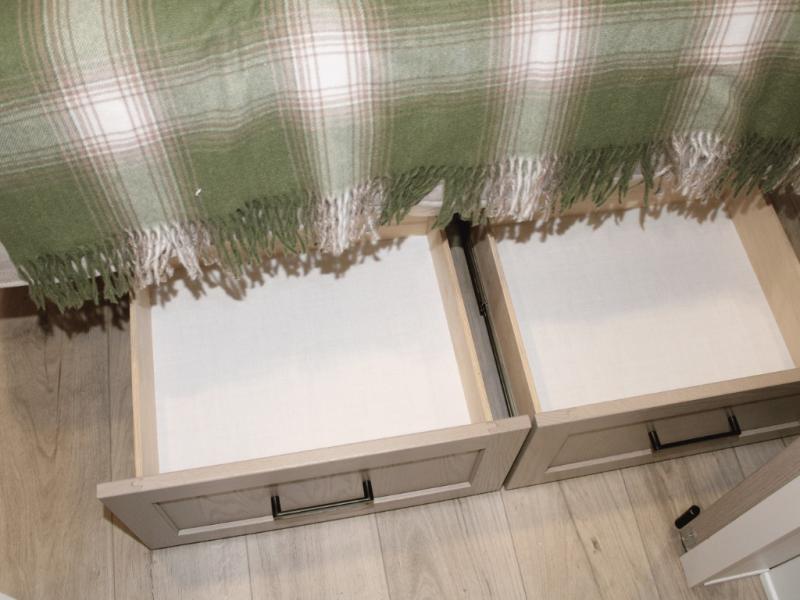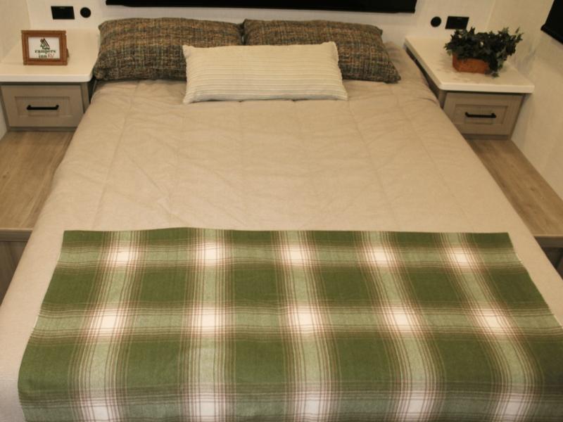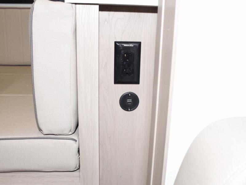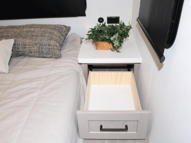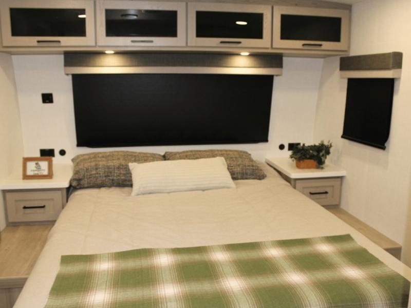 After a long day of adventure, retreat to the private front bedroom where a walk-around queen bed and dual nightstands await. The wardrobe slide adds extra storage and gives you more room to move around. With one of the two entry doors located here, you can slip out early for a sunrise hike without disturbing the rest of the crew.