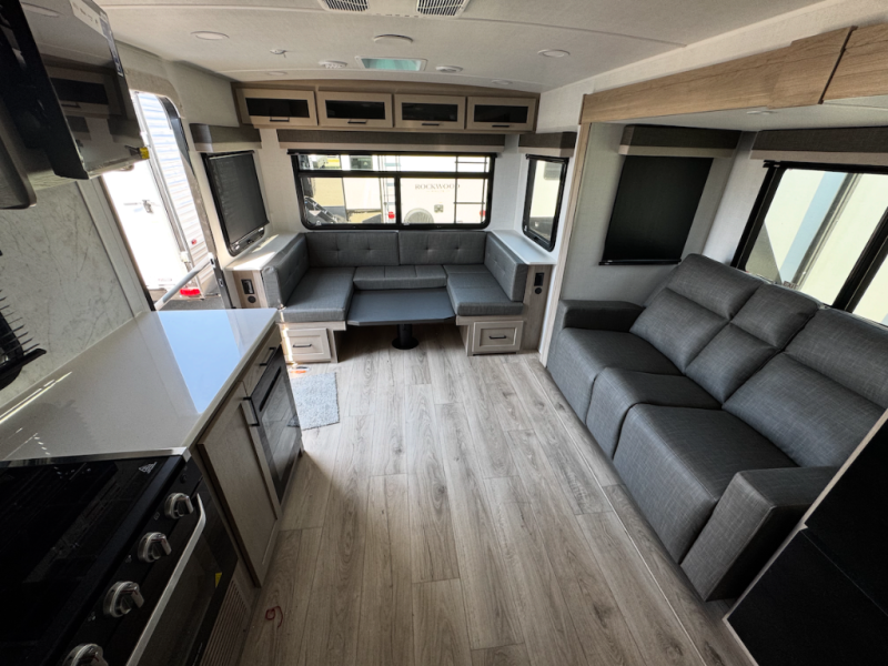 Each Rockwood Ultra Lite travel trailer by Forest River includes superior construction with a high gloss front cap, laminated white fiberglass sidewalls, and tinted frameless windows for a sleek look. The torsion axle, Rubber-Ryde suspension will make towing smooth and hassle-free, along with the nitrogen filled, Goodyear Endurance tires and the tire pressure monitor system. Interior comforts include designer kitchen backsplash, solid wood cabinet doors with hidden hinges, and night roller shades to name a few. Choose a Rockwood Ultra Lite travel trailer today!