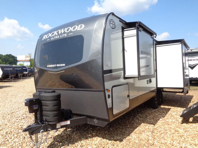 Each Rockwood Ultra Lite travel trailer by Forest River includes superior construction with a high gloss fiberglass cap, aluminum cage construction, and a power awning with LED lighting for a cozy and functional outdoor space. The torsion axle, power tongue jack will make towing smooth and hassle-free, along with the nitrogen filled, Goodyear Endurance tires and the tire pressure monitor system. Interior comforts include kitchen sink with high rise faucet, hidden hinge cabinet doors, and roller shades to name a few. Choose a Rockwood Ultra Lite travel trailer today!