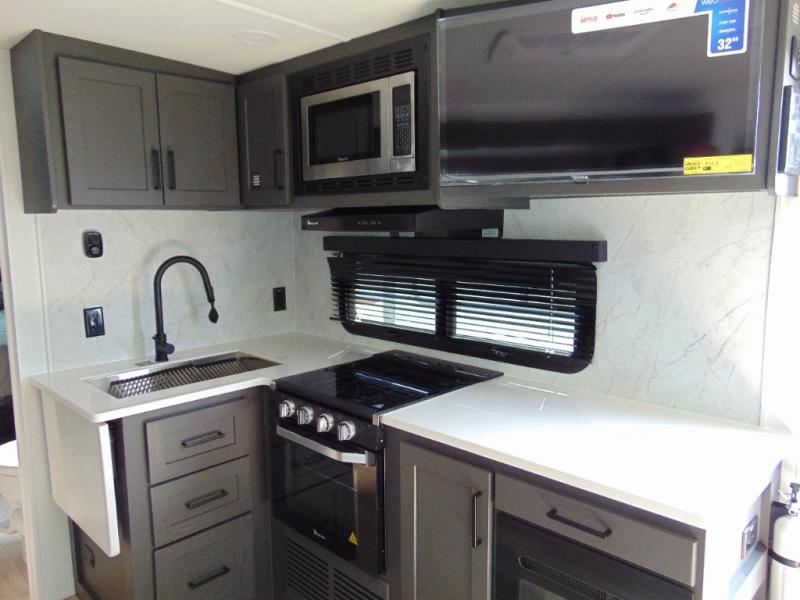This double slide out travel trailer is perfect for weekend trips or extended stays! Your crew can play a game around the U-shaped dinette, relax on the theater seat across from the TV, or visit outdoors under the 21' awning. The fully-equipped kitchen allows you to make meals each day, and the walk-thru bath is easily accessible for everyone to use. This model also includes a front master bedroom with a queen bed, a wardrobe slide out, and one of the dual entry doors for convenience!