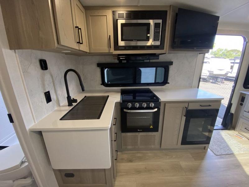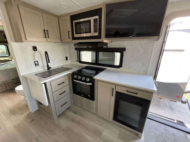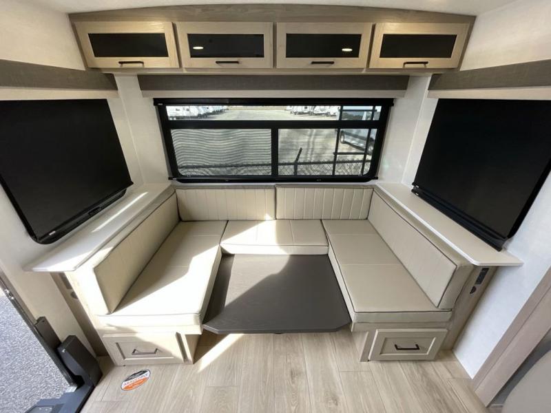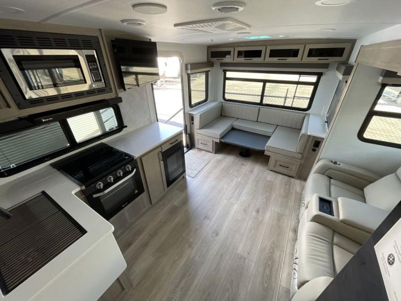 This double slide out travel trailer is perfect for weekend trips or extended stays! Your crew can play a game around the U-shaped dinette, relax on the theater seat across from the TV, or visit outdoors under the 21' awning. The fully-equipped kitchen allows you to make meals each day, and the walk-thru bath is easily accessible for everyone to use. This model also includes a front master bedroom with a queen bed, a wardrobe slide out, and one of the dual entry doors for convenience!