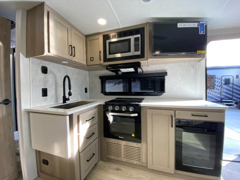 This double slide out travel trailer is perfect for weekend trips or extended stays! Your crew can play a game around the U-shaped dinette, relax on the theater seat across from the TV, or visit outdoors under the 21' awning. The fully-equipped kitchen allows you to make meals each day, and the walk-thru bath is easily accessible for everyone to use. This model also includes a front master bedroom with a queen bed, a wardrobe slide out, and one of the dual entry doors for convenience!