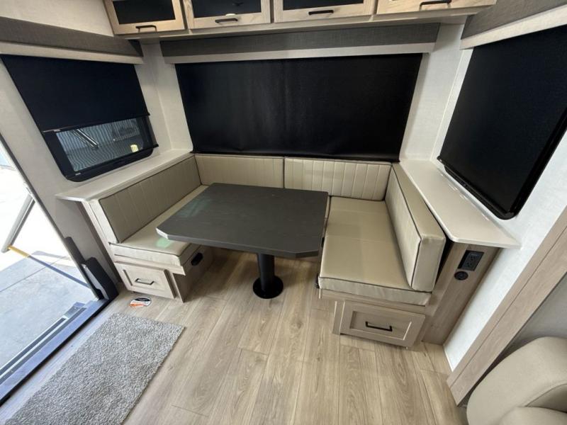 This double slide out travel trailer is perfect for weekend trips or extended stays! Your crew can play a game around the U-shaped dinette, relax on the theater seat across from the TV, or visit outdoors under the 21' awning. The fully-equipped kitchen allows you to make meals each day, and the walk-thru bath is easily accessible for everyone to use. This model also includes a front master bedroom with a queen bed, a wardrobe slide out, and one of the dual entry doors for convenience!