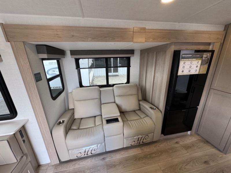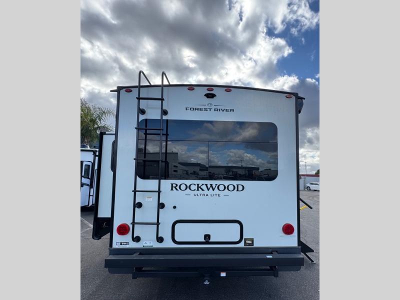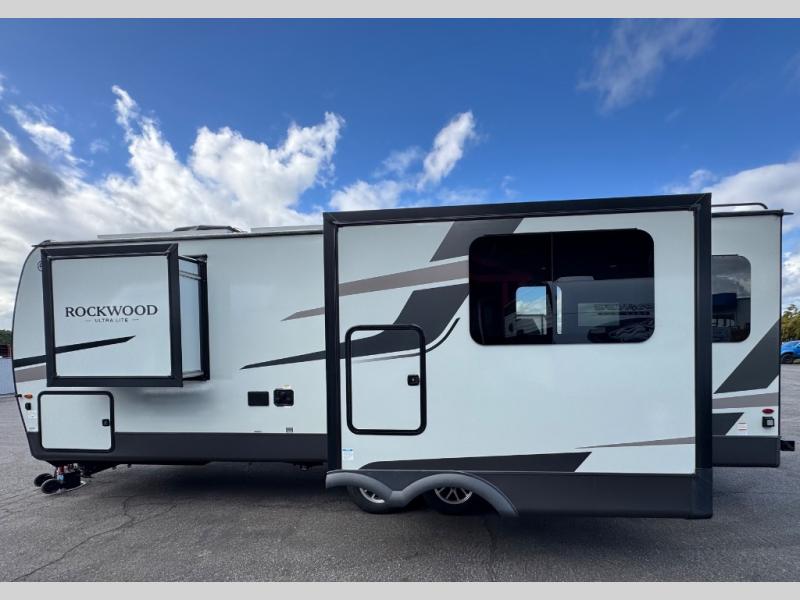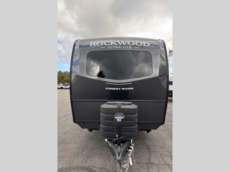 Each Rockwood Ultra Lite travel trailer by Forest River includes superior construction with a high gloss fiberglass cap, aluminum cage construction, and a power awning with LED lighting for a cozy and functional outdoor space. The torsion axle, power tongue jack will make towing smooth and hassle-free, along with the nitrogen filled, Goodyear Endurance tires and the tire pressure monitor system. Interior comforts include kitchen sink with high rise faucet, hidden hinge cabinet doors, and roller shades to name a few. Choose a Rockwood Ultra Lite travel trailer today!