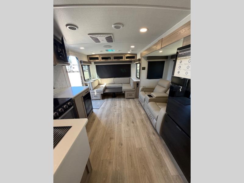 Each Rockwood Ultra Lite travel trailer by Forest River includes superior construction with a high gloss fiberglass cap, aluminum cage construction, and a power awning with LED lighting for a cozy and functional outdoor space. The torsion axle, power tongue jack will make towing smooth and hassle-free, along with the nitrogen filled, Goodyear Endurance tires and the tire pressure monitor system. Interior comforts include kitchen sink with high rise faucet, hidden hinge cabinet doors, and roller shades to name a few. Choose a Rockwood Ultra Lite travel trailer today!