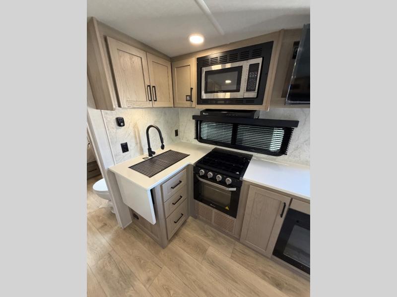 This double slide out travel trailer is perfect for weekend trips or extended stays! Your crew can play a game around the U-shaped dinette, relax on the theater seat across from the TV, or visit outdoors under the 21' awning. The fully-equipped kitchen allows you to make meals each day, and the walk-thru bath is easily accessible for everyone to use. This model also includes a front master bedroom with a queen bed, a wardrobe slide out, and one of the dual entry doors for convenience!