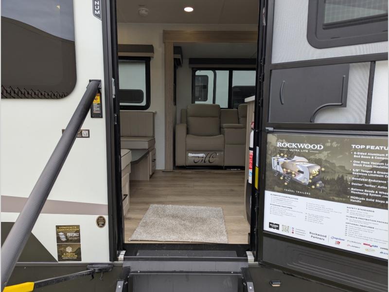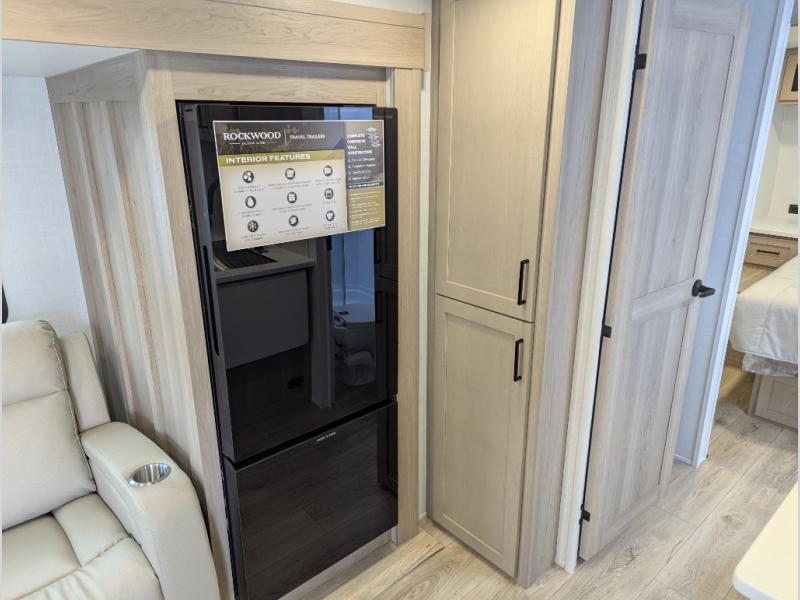 Each Rockwood Ultra Lite travel trailer by Forest River includes superior construction with a high gloss fiberglass cap, aluminum cage construction, and a power awning with LED lighting for a cozy and functional outdoor space. The torsion axle, power tongue jack will make towing smooth and hassle-free, along with the nitrogen filled, Goodyear Endurance tires and the tire pressure monitor system. Interior comforts include kitchen sink with high rise faucet, hidden hinge cabinet doors, and roller shades to name a few. Choose a Rockwood Ultra Lite travel trailer today!