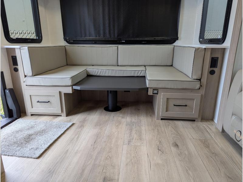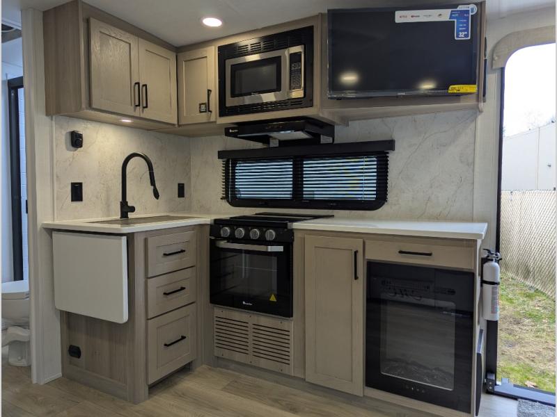 This double slide out travel trailer is perfect for weekend trips or extended stays! Your crew can play a game around the U-shaped dinette, relax on the theater seat across from the TV, or visit outdoors under the 21' awning. The fully-equipped kitchen allows you to make meals each day, and the walk-thru bath is easily accessible for everyone to use. This model also includes a front master bedroom with a queen bed, a wardrobe slide out, and one of the dual entry doors for convenience!