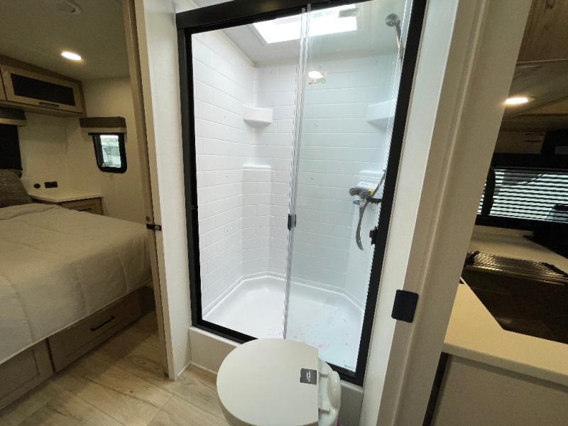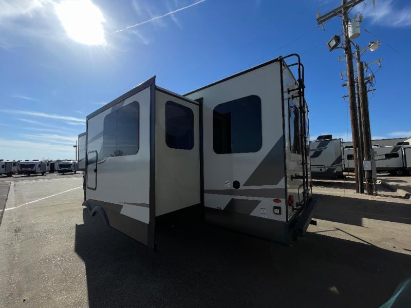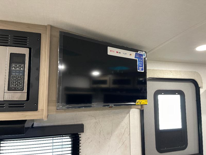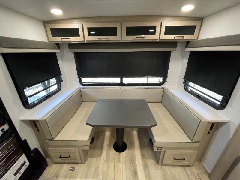 This double slide out travel trailer is perfect for weekend trips or extended stays! Your crew can play a game around the U-shaped dinette, relax on the theater seat across from the TV, or visit outdoors under the 21' awning. The fully-equipped kitchen allows you to make meals each day, and the walk-thru bath is easily accessible for everyone to use. This model also includes a front master bedroom with a queen bed, a wardrobe slide out, and one of the dual entry doors for convenience!