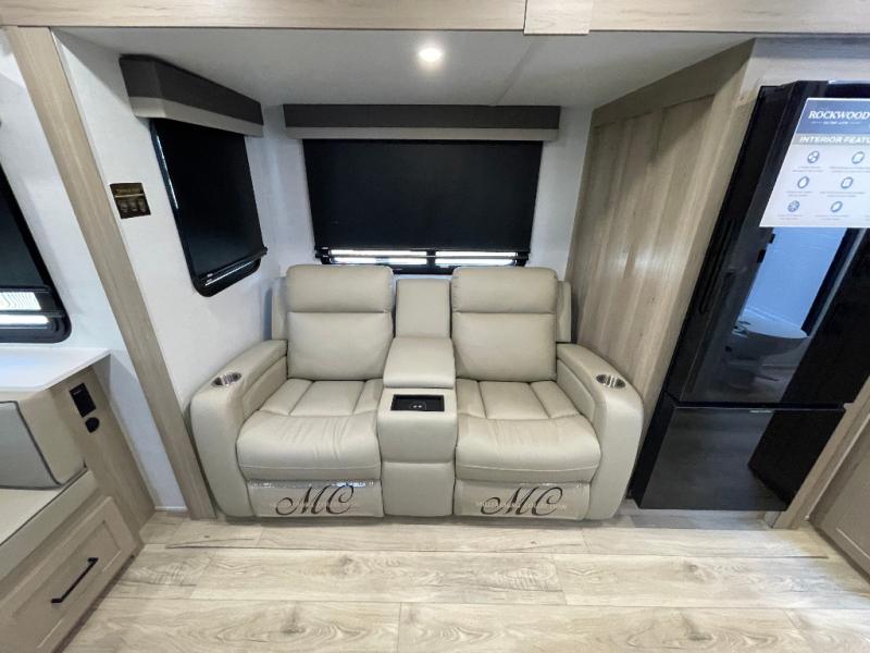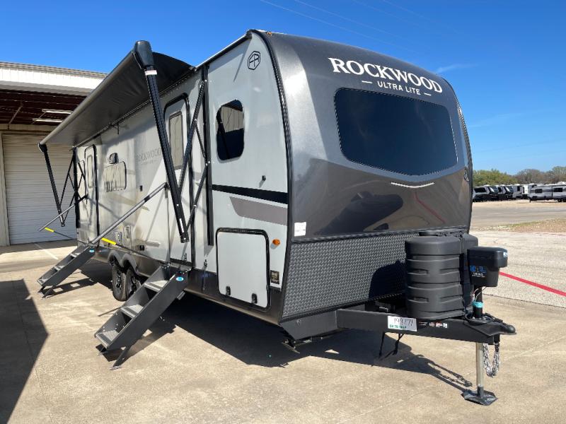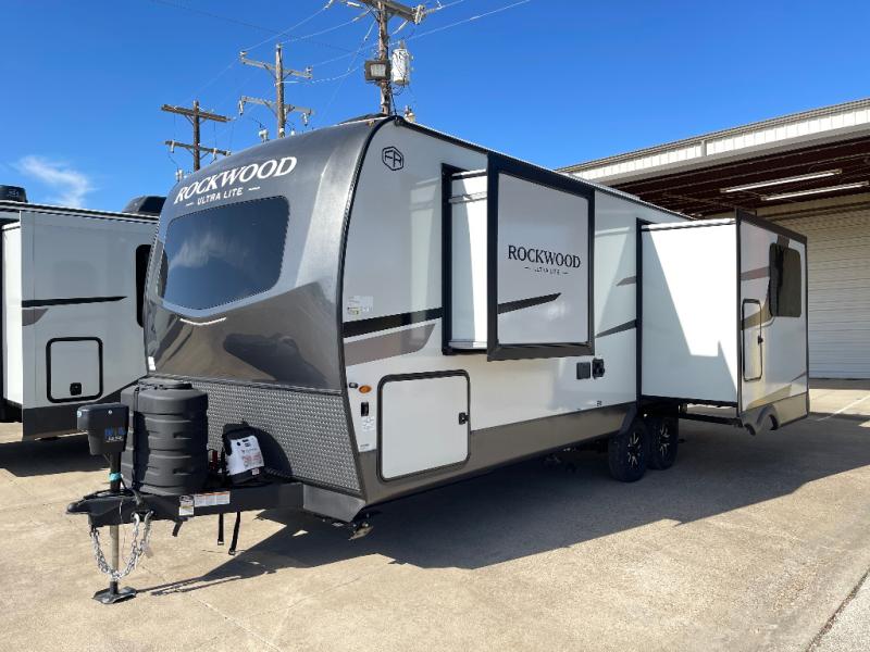 Each Rockwood Ultra Lite travel trailer by Forest River includes superior construction with a high gloss fiberglass cap, aluminum cage construction, and a power awning with LED lighting for a cozy and functional outdoor space. The torsion axle, power tongue jack will make towing smooth and hassle-free, along with the nitrogen filled, Goodyear Endurance tires and the tire pressure monitor system. Interior comforts include kitchen sink with high rise faucet, hidden hinge cabinet doors, and roller shades to name a few. Choose a Rockwood Ultra Lite travel trailer today!