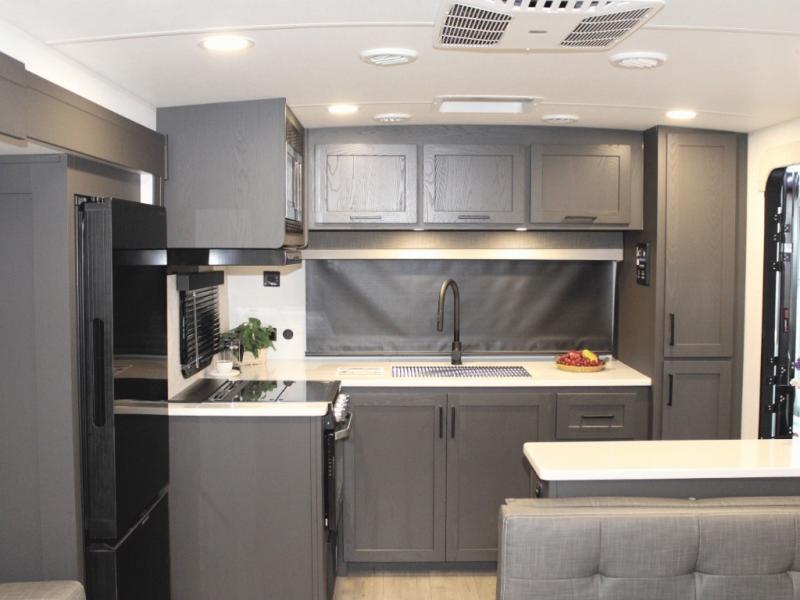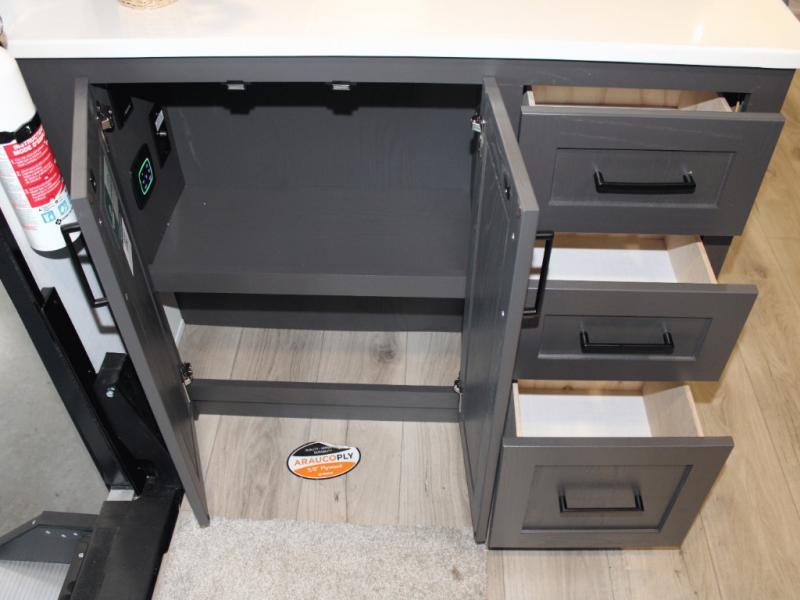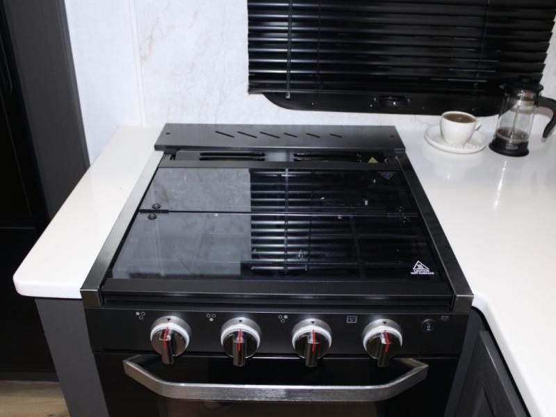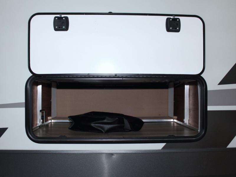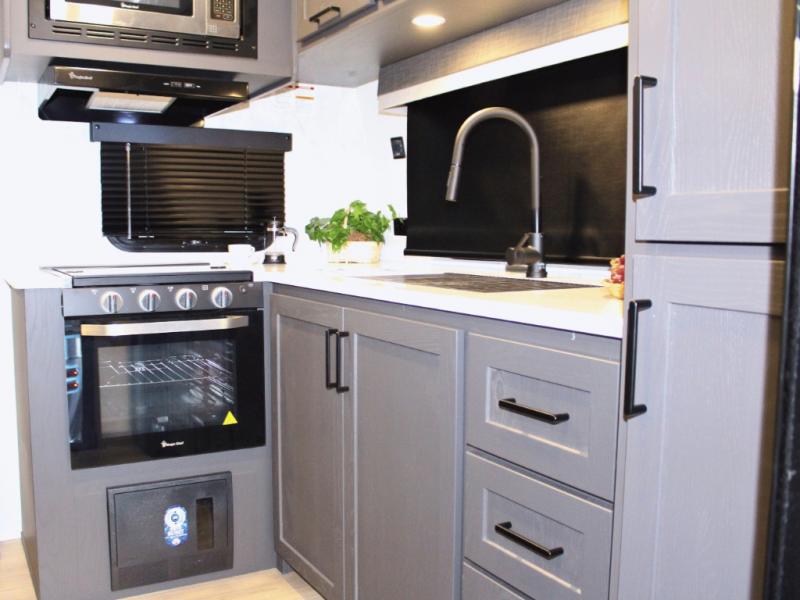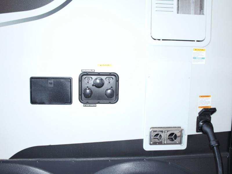 Love to cook on the road? The 2619FK delivers in a big way. The spacious front kitchen gives you abundant counter space, a three-burner range, oven, microwave, and a 12V refrigerator—all laid out for convenience and functionality. When the weather is calling, take your cooking outdoors with the exterior griddle, perfect for burgers, bacon, or breakfast with a view.
